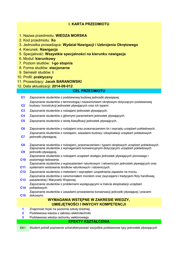 I. KARTA PRZEDMIOTU 1. Nazwa przedmiotu: WIEDZA MORSKA 2. Kod przedmiotu: Xo 3. Jednostka prowadząca: Wydział Nawigacji i Uzbrojenia Okrętowego 4. Kierunek: Nawigacja 5. Specjalność: Wszystkie specjalności na kierunku nawigacja 6. Moduł: kierunkowy 7. Poziom studiów: I-go stopnia 8. Forma studiów: stacjonarne 9. Semestr studiów: I 10. Profil: praktyczny 11. Prowadzący: Jacek BARANOWSKI 12. Data aktualizacji: 2014-09-012 CEL PRZEDMIOTU C2 Zapoznanie studentów z podstawową budową jednostki pływającej. Zapoznanie studentów z terminologią i nazewnictwem okrętowym dotyczącym podstawowej budowy i konstrukcji jednostek pływających oraz ich typami. C3 Zapoznanie studentów z rodzajami jednostek pływających. C4 Zapoznanie studentów z głównymi parametrami jednostek pływających. C5 Zapoznanie studentów z istotą klasyfikacji jednostek pływających. C6 Zapoznanie studentów z rodzajami oraz przeznaczeniem lin i osprzętu urządzeń pokładowych. Zapoznanie studentów z rodzajami, zasadami budowy i eksploatacji urządzeń pokładowych jednostki pływającej. C1 C7 C8 C9 C10 C11 C12 C13 C14 C15 Zapoznanie studentów z rodzajami, przeznaczeniem i typami okrętowych urządzeń pokładowych. Zapoznanie studentów z wymaganiami konwencyjnymi dotyczącymi urządzeń pokładowych jednostki pływającej. Zapoznanie studentów z rodzajami urządzeń dostępu jednostek pływających pionowego i poziomego ładowania. Zapoznanie studentów z wyposażeniem ratunkowym i ratowniczym jednostek pływających oraz systemami wodowania środków ratunkowych i ratowniczych. Zapoznanie studentów z metodami i osprzętem uzupełniania zapasów na morzu. Zapoznanie studentów z ceremoniałem morskim oraz zwyczajami i tradycjami floty handlowej, pasażerskiej i Marynarki Wojennej. Zapoznanie studentów z problemami występującymi w trakcie eksploatacji urządzeń pokładowych. Zapoznanie studentów z zasadami prowadzenia konserwacji jednostki pływającej i pracami dokowymi. WYMAGANIA WSTĘPNE W ZAKRESIE WIEDZY, UMIEJĘTNOŚCI I INNYCHY KOMPETENCJI 1 2 3 Znajomość fizyki na poziomie szkoły średniej. Podstawowa wiedza z zakresu elektrotechniki Podstawowa wiedza rachunku wektorowego EFEKTY KSZTAŁCENIA EK1 Student potrafi poprawnie scharakteryzować wszystkie podstawowe typy jednostek pływających EK2 EK3 EK4 Student potrafi wymienić główne Towarzystwa Klasyfikacyjne i omówić zasady ich działalności. Student poprawnie posługuje się nazewnictwem okrętowym dotyczącym podstawowej budowy i konstrukcji jednostek pływających. Poprawnie definiuje główne wymiary i wielkości jednostki pływającej. Student zna wyposażenie ładunkowe jednostek pływających. Potrafi właściwie eksploatować osprzęt pokładowy. Zna zasady pracy urządzeń podnośnych. EK5 Student zna rodzaje i typy urządzeń dostępu jednostek pływających pionowego i poziomego ładowania. Wymagania Towarzystw Klasyfikacyjnych dotyczących pokryw luków. EK6 Student potrafi wymienić urządzenia pokładowe jednostki pływającej, ich rodzaje i typy oraz omówić ich budowę. Rozumie zastosowanie tych urządzeń na okręcie. Zna wymagania konwencyjne dotyczące tych urządzeń. EK7 Student potrafi wymienić indywidualne i zbiorowe środki ratunkowe. Zna środki ratownicze stosowane na jednostkach pływających. Potrafi omówić ich przeznaczenie oraz zasady posługiwania się nimi. Zna wymagania konwencyjne dotyczące tych środków. EK8 Student potrafi omówić metody uzupełniania zapasów w morzu oraz zna osprzęt stosowany w RAS EK9 Student potrafi omówić zagadnienia z ceremoniału morskiego. Zna podstawowe zwyczaje i tradycje marynarskie EK10 Student zna przeznaczenie, budowę i zasadę działania wind kotwicznych i cumowniczych. EK11 Student zna rodzaje i przeznaczenie urządzeń pokładowych. Zna urządzenia sterowe, kotwiczne, cumownicze i przeładunkowe. Student zna rodzaje i przeznaczenie urządzeń sterowych. Zna zasady powstawania sił na sterze. EK12 Zna budowę elektrohydraulicznej maszyny sterowej. Zna przepisy instytucji klasyfikacyjnych dotyczących urządzeń sterowych. Zna zasady eksploatacji maszyny sterowej. EK13 Student potrafi omówić zasady sprawdzenia stanu technicznego osprzętu urządzeń pokładowych i zasad wycofania go z eksploatacji EK14 Student zna budowę i zasady eksploatacji wind i kabestanów kotwicznych, pokryw luków,wind ładunkowych i łodziowych. EK15 Student zna zasady prowadzenia konserwacji jednostki pływającej, sprzęt i środki ochrony, przepisy BiHP. STRUKTURA PRZEDMIOTU EK1 EK2 EK3 EK4 EK5 EK6 EK7 EK8 EK9 EK10 Forma zajęćwykłady Liczba godzin Forma zajęććwiczenia W2 W2 W3 W4 W5 W6 W7 W8 1 2 2 2 1 2 2 2 … … … C2, C6 … C3 C4 C5 C1 W4 Liczba godzin 5 5 4 3 4 Forma zajęćlaboratoria Liczba godzin EK11 EK12 EK13 EK14 EK15 W6, W4 W6 W4 W5, W6, W7 W9 Suma godzin 1 15 21 0 TREŚCI PROGRAMOWE W1 Wprowadzenie do przedmiotu, znaczenie przedmiotu studiów w kształceniu przyszłych oficerów. W2 Charakterystyka jednostek pływających; klasyfikacja statków handlowych Towarzystwa Klasyfikacyjne; klasyfikacja statków handlowych wg PRS. W3 Nazewnictwo części składowych statków; kadłub i jego wnętrze, pokład i nadbudówki, omasztowanie i olinowanie; główne wymiary i wielkości jednostek pływających. W4 W5 W6 W7 W8 W9 C1 C2 C3 C4 C5 C6 Wyposażenie ładunkowe jednostek pływających; liny okrętowe; osprzęt pokładowy; urządzenia podnośne. Urządzenia dostępu jednostek pływających pionowego i poziomego ładowania. Urządzenia pokładowe statku. Urządzenia sterowe, urządzenia kotwiczne, urządzenia cumownicze i holownicze. Wyposażenie ratunkowe statków. Środki ratunkowe, środki ratownicze. Okrętowe urządzenia do wodowania środków ratunkowych. Uzupełnianie zapasów na morzu. Metody uzupełniania zapasów na morzu. Osprzęt do przeładunku ładunków. Uzupełnianie zapasów na morzu ze specjalnie wyposażonych statków handlowych. Zasady 