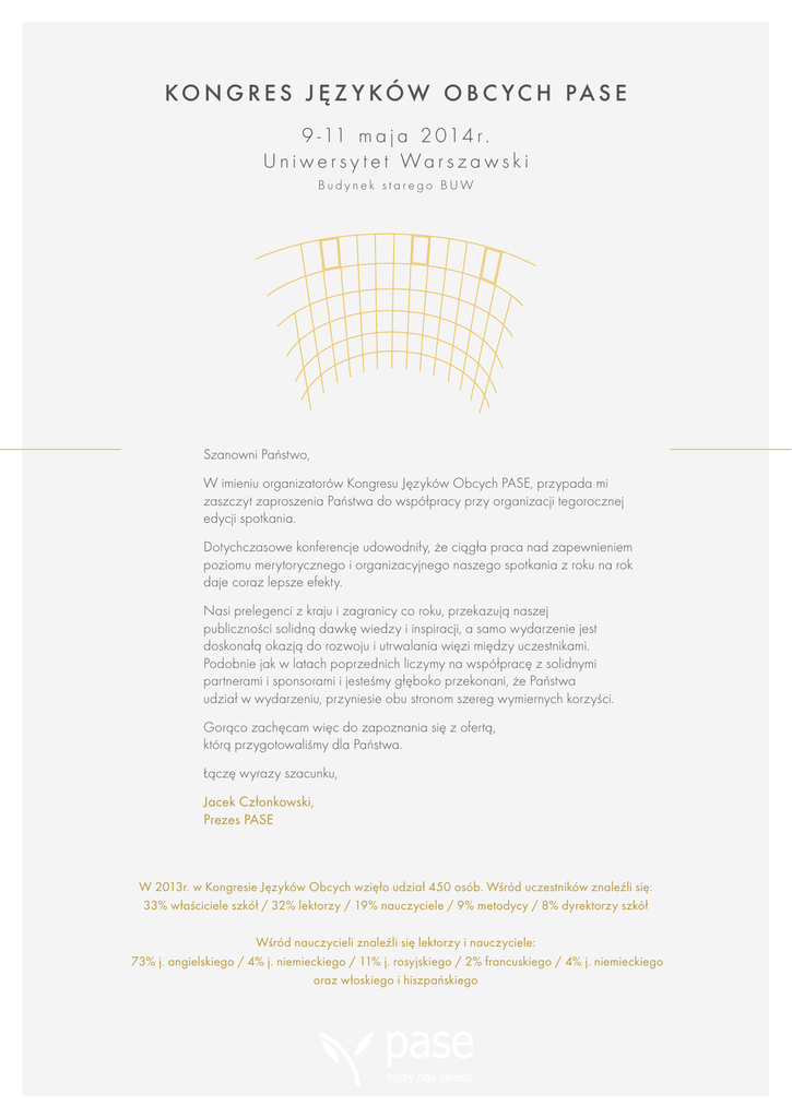 KO N G R E S J Ę Z Y KÓW O B C YC H PA S E 9 - 11 m a j a 2 014 r . U n i we rs y t e t Wa rs za w s k i Budynek starego BUW Szanowni Państwo, W imieniu organizatorów Kongresu Języków Obcych PASE, przypada mi zaszczyt zaproszenia Państwa do współpracy przy organizacji tegorocznej edycji spotkania. Dotychczasowe konferencje udowodniły, że ciągła praca nad zapewnieniem poziomu merytorycznego i organizacyjnego naszego spotkania z roku na rok daje coraz lepsze efekty. Nasi prelegenci z kraju i zagranicy co roku, przekazują naszej publiczności solidną dawkę wiedzy i inspiracji, a samo wydarzenie jest doskonałą okazją do rozwoju i utrwalania więzi między uczestnikami. Podobnie jak w latach poprzednich liczymy na współpracę z solidnymi partnerami i sponsorami i jesteśmy głęboko przekonani, że Państwa udział w wydarzeniu, przyniesie obu stronom szereg wymiernych korzyści. Gorąco zachęcam więc do zapoznania się z ofertą, którą przygotowaliśmy dla Państwa. Łączę wyrazy szacunku, Jacek Członkowski, Prezes PASE W 2013r. w Kongresie Języków Obcych wzięło udział 450 osób. Wśród uczestników znaleźli się: 33% właściciele szkół / 32% lektorzy / 19% nauczyciele / 9% metodycy / 8% dyrektorzy szkół Wśród nauczycieli znaleźli się lektorzy i nauczyciele: 73% j. angielskiego / 4% j. niemieckiego / 11% j. rosyjskiego / 2% francuskiego / 4% j. niemieckiego oraz włoskiego i hiszpańskiego G ł ówny S ponsor K ongres u P A S E 6 0 0 0 zł • 2 sesje podczas Kongresu. • Zamieszczenie materiałów promocyjnych sponsora w materiałach konferencyjnych. • Logo sponsora na stronie internetowej Kongresu. • Baner reklamowy w auli głównej. • Dystrybucja materiałów promocyjnych sponsora dla uczestników Kongresu. • Stoisko ekspozycyjne “A”* z możliwością przedstawienia pełnej oferty Sponsora. • Informacja o sponsorze we wszystkich materiałach rozsyłanych pocztą elektroniczną. • Logo Sponsora w drukowanych materiałach konferencyjnych. • Oficjalne podziękowania podczas Kongresu podkreślające fakt sponsorowania. • Nieodpłatny udział dwóch przedstawicieli Sponsora w Kongresie. • Reklama w programie Kongresu (pełna strona) S ponsor K ongres u P A S E 4 0 0 0 zł • 1 lub 2 sesje podczas Kongresu • Zamieszczenie materiałów promocyjnych sponsora w materiałach konferencyjnych. • Logo sponsora na stronie internetowej Kongresu. • Baner reklamowy w auli głównej. • Stoisko ekspozycyjne “A”* z możliwością przedstawienia pełnej oferty Sponsora. • Informacja o sponsorze we wszystkich materiałach rozsyłanych pocztą elektroniczną. • Logo Sponsora w drukowanych materiałach konferencyjnych. • Oficjalne podziękowania podczas Kongresu podkreślające fakt sponsorowania. • Nieodpłatny udział dwóch przedstawicieli Sponsora w Kongresie. P ar t ner K ongres u P A S E 2 5 0 0 zł • 50 minutowa prezentacja w bloku warsztatowym podczas Kongresu. • Zamieszczenie materiałów promocyjnych partnera w materiałach konferencyjnych. • Logo Partnera na stronie internetowej Kongresu. • Baner reklamowy na sali konferencyjnej, podczas sesji warsztatowej. • Stoisko ekspozycyjne “B”* z możliwością przedstawienia pełnej oferty Partnera. • Logo Partnera w drukowanych materiałach konferencyjnych. • Nieodpłatny udział jednego przedstawiciela Partnera w Kongresie. W ys t awca 1 0 0 0 zł • Zamieszczenie materiałów promocyjnych partnera w materiałach konferencyjnych. • Logo Partnera na stronie internetowej Kongresu. • Stoisko ekspozycyjne “C”* z możliwością przedstawienia pełnej oferty Partnera. • Logo Partnera w drukowanych materiałach konferencyjnych. P ozos t a ł e m o ż l i we f or m y rek l a m y • 50 minutowa pezentacja w bloku warsztatowym podczas Kongresu / 750 zł • Stoisko ekspozycyjne “C”* z możliwością przedstawienia pełnej oferty / 750 zł • Logo Partnera na stronie internetowej Kongresu / 400 zł • Logo Partner w drukowanych materiałach konferencyjnych / 600 zł • Zamieszczenie materiałów promocyjnych w materiałach konferencyjnych / 600 zł • Zamieszczenie reklamy w programie Kongresu strony / 500 zł • Sponsor: Wine Reception ( szczegóły do uzgodnienia z organizatorem ) • Sponsor: Evening Entertaiment ( szczegóły do uzgodnienia z organizatorem ) * stoisko ekspozycyjne „ A” = parter, hall główny w budynku BUW, stoisko ekspozycyjne „B” = parter, hall glowny lub I piętro w budynku BUW (decyduje kolejność zgłoszeń) stoisko ekspozycyjne „C” = I piętro, w budynku BUW,