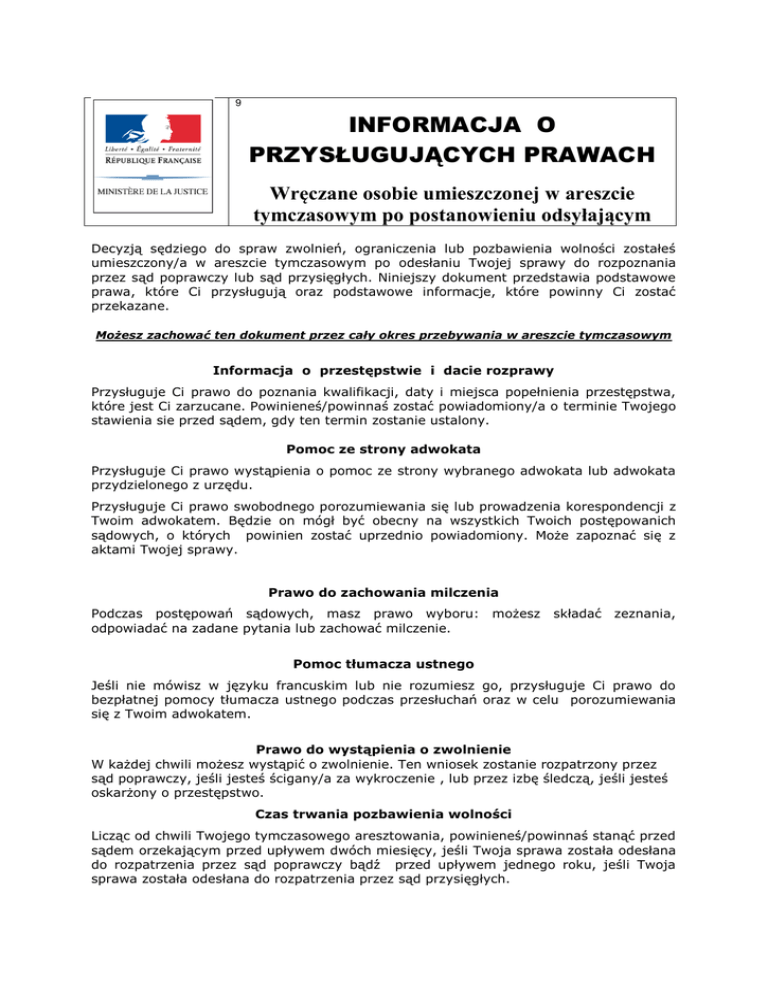 9 INFORMACJA O PRZYSŁUGUJĄCYCH PRAWACH Wręczane osobie umieszczonej w areszcie tymczasowym po postanowieniu odsyłającym Decyzją sędziego do spraw zwolnień, ograniczenia lub pozbawienia wolności zostałeś umieszczony/a w areszcie tymczasowym po odesłaniu Twojej sprawy do rozpoznania przez sąd poprawczy lub sąd przysięgłych. Niniejszy dokument przedstawia podstawowe prawa, które Ci przysługują oraz podstawowe informacje, które powinny Ci zostać przekazane. Możesz zachować ten dokument przez cały okres przebywania w areszcie tymczasowym Informacja o przestępstwie i dacie rozprawy Przysługuje Ci prawo do poznania kwalifikacji, daty i miejsca popełnienia przestępstwa, które jest Ci zarzucane. Powinieneś/powinnaś zostać powiadomiony/a o terminie Twojego stawienia sie przed sądem, gdy ten termin zostanie ustalony. Pomoc ze strony adwokata Przysługuje Ci prawo wystąpienia o pomoc ze strony wybranego adwokata lub adwokata przydzielonego z urzędu. Przysługuje Ci prawo swobodnego porozumiewania się lub prowadzenia korespondencji z Twoim adwokatem. Będzie on mógł być obecny na wszystkich Twoich postępowanich sądowych, o których powinien zostać uprzednio powiadomiony. Może zapoznać się z aktami Twojej sprawy. Prawo do zachowania milczenia Podczas postępowań sądowych, masz prawo wyboru: odpowiadać na zadane pytania lub zachować milczenie. możesz składać zeznania, Pomoc tłumacza ustnego Jeśli nie mówisz w języku francuskim lub nie rozumiesz go, przysługuje Ci prawo do bezpłatnej pomocy tłumacza ustnego podczas przesłuchań oraz w celu porozumiewania się z Twoim adwokatem. Prawo do wystąpienia o zwolnienie W każdej chwili możesz wystąpić o zwolnienie. Ten wniosek zostanie rozpatrzony przez sąd poprawczy, jeśli jesteś ścigany/a za wykroczenie , lub przez izbę śledczą, jeśli jesteś oskarżony o przestępstwo. Czas trwania pozbawienia wolności Licząc od chwili Twojego tymczasowego aresztowania, powinieneś/powinnaś stanąć przed sądem orzekającym przed upływem dwóch miesięcy, jeśli Twoja sprawa została odesłana do rozpatrzenia przez sąd poprawczy bądź przed upływem jednego roku, jeśli Twoja sprawa została odesłana do rozpatrzenia przez sąd przysięgłych. Poinformowanie niektórych osób Przysługuje Ci prawo powiadomienia o Twoim areszcie tymczasowym wybranych przez siebie osób, a zwłaszcza członków Twojej rodziny. Jeśli jesteś obywatelem innego państwa, przysługuje Ci również prawo władz konsularnych Twojego państwa. powiadomienia Badanie lekarskie Przysługuje Ci prawo poproszenia o poddanie badaniu lekarskiemu. Dostęp do akt sprawy Przysługuje Ci prawo cyfrowej. otrzymania kopii akt postępowania, w razie potrzeby w formie