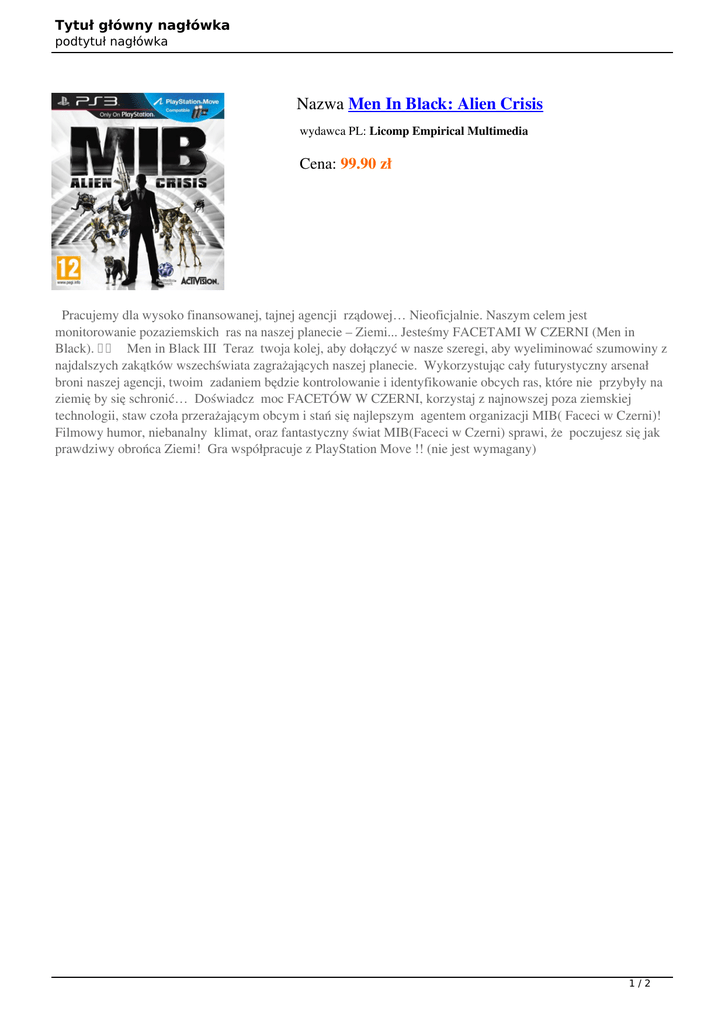 Tytuł główny nagłówka podtytuł nagłówka Nazwa Men In Black: Alien Crisis wydawca PL: Licomp Empirical Multimedia Cena: 99.90 zł Pracujemy dla wysoko finansowanej, tajnej agencji rządowej… Nieoficjalnie. Naszym celem jest monitorowanie pozaziemskich ras na naszej planecie – Ziemi... Jesteśmy FACETAMI W CZERNI (Men in Black). Men in Black III Teraz twoja kolej, aby dołączyć w nasze szeregi, aby wyeliminować szumowiny z najdalszych zakątków wszechświata zagrażających naszej planecie. Wykorzystując cały futurystyczny arsenał broni naszej agencji, twoim zadaniem będzie kontrolowanie i identyfikowanie obcych ras, które nie przybyły na ziemię by się schronić… Doświadcz moc FACETÓW W CZERNI, korzystaj z najnowszej poza ziemskiej technologii, staw czoła przerażającym obcym i stań się najlepszym agentem organizacji MIB( Faceci w Czerni)! Filmowy humor, niebanalny klimat, oraz fantastyczny świat MIB(Faceci w Czerni) sprawi, że poczujesz się jak prawdziwy obrońca Ziemi! Gra współpracuje z PlayStation Move !! (nie jest wymagany) 1/2 Tytuł główny nagłówka podtytuł nagłówka Nazwa Wartość Wydawca PL Licomp Empik Multimedia Data premiery 25-go maja 2012 Producent Tryb gry Kategoria wiekowa Wersja językowa Wymagania sprzętowe Format Activision Blizzard Single Player 12+ ENG Konsola PlayStation 3 1xBlu-Ray 2/2