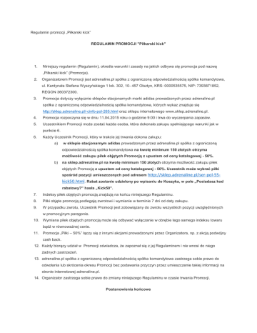 Regulamin promocji „Piłkarski kick” REGULAMIN PROMOCJI "Piłkarski kick" 1. Niniejszy regulamin (Regulamin), określa warunki i zasady na jakich odbywa się promocja pod nazwą „Piłkarski kick” (Promocja). 2. Organizatorem Promocji jest adrenaline.pl spółka z ograniczoną odpowiedzialnością spółka komandytowa, ul. Kardynała Stefana Wyszyńskiego 1 lok. 302, 10- 457 Olsztyn, KRS: 0000535575, NIP: 7393871852, REGON 360372300. 3. Promocja dotyczy wyłącznie sklepów stacjonarnych marki adidas prowadzonych przez adrenaline.pl spółka z ograniczoną odpowiedzialnością spółka komandytowa, których wykaz znajduje się http://sklep.adrenaline.pl/-cinfo-pol-265.html oraz sklepu internetowego www.sklep.adrenaline.pl. 4. Promocja rozpoczyna się w dniu 11.04.2015 roku o godzinie 9:00 i trwa do wyczerpania zapasów. 5. Uczestnikiem Promocji może zostać każda osoba, która dokonała zakupu spełniającego warunki jak w punkcie 6. 6. Każdy Uczestnik Promocji, który w trakcie jej trwania dokona zakupu: a) w sklepie stacjonarnym adidas prowadzonym przez adrenaline.pl spółka z ograniczoną odpowiedzialnością spółka komandytowa na kwotę minimum 150 złotych otrzyma możliwość zakupu piłek objętych Promocją z upustem od ceny katalogowej - 50%. b) na sklep.adrenaline.pl na kwotę minimum 150 złotych otrzyma możliwość zakupu piłek objętych Promocją z upustem od ceny katalogowej - 50%. Uczestnik może wybrać piłki spośród pozycji umieszczonych pod adresem http://sklep.adrenaline.pl/ser-pol-55- kick50.html. Rabat zostanie udzielony po wpisaniu do Koszyka, w pole „Posiadasz kod rabatowy?” hasła „Kick50”. 7. Indeksy piłek objętych promocją znajdują na końcu niniejszego Regulaminu. 8. Piłki objęte promocją podlegają zwrotowi i wymianie w terminie 7 dni od daty zakupu. 9. W przypadku zwrotu, Uczestnik Promocji jest zobowiązany do zwrotu wszystkich pozycji uwzględnionych w promocyjnym paragonie. 10. Wymiana piłek objętych promocją może się odbywać wyłączanie w obrębie tego samego indeksu towaru bądź w równoważnej cenie. 11. Promocja „Piłki – 50%” łączy się z innymi akcjami prowadzonymi przez Organizatora, np. z akcją podwójny cash back. 12. Każdy biorący udział w Promocji oświadcza, że zapoznał się z jej Regulaminem i nie wnosi do niego żadnych zastrzeżeń. 13. adrenaline.pl spółka z ograniczoną odpowiedzialnością spółka komandytowa zastrzega sobie prawo do odwołania lub skrócenia okresu Promocji bez podawania przyczyn przez umieszczenie takiej informacji na stronie internetowej adrenaline.pl. 14. Organizator zastrzega sobie prawo do zmiany niniejszego Regulaminu w czasie trwania Promocji. Postanowienia końcowe 1. Wzięcie udziału w Promocji oznacza zgodę jej Uczestnika na warunki Promocji określone niniejszym Regulaminem. 2. W sprawach nieuregulowanych niniejszym Regulaminem zastosowanie mają odpowiednie przepisy kodeksu cywilnego. Wszelkie spory wynikłe z tytułu wykonania zobowiązań związanych z niniejszą Promocją będą rozstrzygane przez Sąd Właściwy dla siedziby organizatora. 3. Regulamin Promocji, będzie dostępny przez czas trwania Promocji w salonach stacjonarnych adidas prowadzonych przez adrenaline sp. z o.o. sp. k. oraz u Organizatora. 4. Promocja, której warunki zostały określone w niniejszym Regulaminie, nie jest grą losową, loterią fantową, zakładem wzajemnym ani loterią promocyjną, których wynik zależy od przypadku w rozumieniu art. 2 ustawy z dnia 29 lipca 1992 o grach losowych i zakładach wzajemnych (Dz. U. z 2004 r., Nr 4, poz. 27, z późniejszymi zmianami). 5. Wiążącą moc prawną mają wyłącznie postanowienia niniejszego Regulaminu. 6. Reklamacje związane z przeprowadzeniem Promocji można przesyłać listownie na adres adrenaline.pl spółka z ograniczoną odpowiedzialnością spółka komandytowa, ul. Kardynała Stefana Wyszyńskiego 1 lok. 302, 10- 457 Olsztyn. Zgłoszenie reklamacji powinno zawierać dokładny opis reklamacji oraz dane Uczestnika niezbędne do udzielenia mu odpowiedzi. 7. Reklamacje będą rozpatrywane przez Organizatora w terminie 14 dni kalendarzowych od daty ich otrzymania. Organizator rozpatrując reklamację stosować będzie postanowienia niniejszego Regulaminu. O decyzji Organizatora Uczestnik zostanie powiadomiony emailem (o ile będzie podany) albo listem zwykłym. Załącznik nr 1. Indeksy piłek objętych promocją. Nazwa Styl Rozmiar PILKA BRAZUCA GLIDER G73633 5 PILKA FINALE LIS CAP G82967 5 PILKA PREDATOR GLIDER G83964 5 PILKA F50 X-ITE G82960 5 PILKA MESSI G83961 5 PILKA WCFINALTOPGLIDE G83997 5 PILKA FINALE14CAP F93307 5 PILKA FINALE14CAP F93307 4 PILKA FINALE14OMB F93366 5 PILKA FINALE14TTRAIN F93369 5 PILKA FINALE14FCB CAP F93386 5 PILKA PREDATOR GLIDER G91044 4 PILKA PREDATOR GLIDER G91044 5 PILKA F50 X-ITE G91047 5 PILKA F50 X-ITE II G91052 5 PILKA F50 X-ITE II G91053 5 PILKA F50 X-ITE MINI G91056 1 PILKA MESSI F93740 5 PILKA BRAZUCA TOP R G73622 4 PILKA F50 X-ITE G91050 5