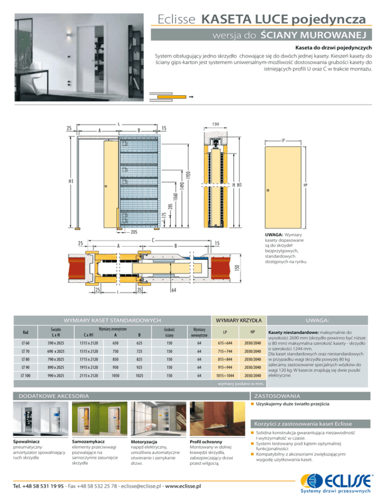 Eclisse KASETA LUCE pojedyncza wersja do ŚCIANY MUROWANEJ Kaseta do drzwi pojedynczych System obsługujący jedno skrzydło chowające się do dwóch jednej kasety. Kieszeń kasety do ściany gips-karton jest systemem uniwersalnym-możliwość dostosowania grubości kasety do istniejących profili U oraz C w trakcie montażu. C 25 A 150 15 B 1920 LP H H1 HP 175 285 1060 1490 H1 205 25 C 15 B 150 A UWAGA: Wymiary kasety dopasowane są do skrzydeł bezprzylgowych, standardowych dostępnych na rynku. 25 L 35 64 WYMIARY KASET STANDARDOWYCH Wymiary zewnętrzne WYMIARY KRZYDŁA LxH C x H1 A B Grubość ściany Wymiary wewnętrzne LP HP LT 60 590 x 2025 1315 x 2120 650 625 150 64 615÷644 2030/2040 Kod Światło LT 70 690 x 2025 1515 x 2120 750 725 150 64 715÷744 2030/2040 LT 80 790 x 2025 1715 x 2120 850 825 150 64 815÷844 2030/2040 LT 90 890 x 2025 1915 x 2120 950 925 150 64 915÷944 2030/2040 LT 100 990 x 2025 2115 x 2120 1050 1025 150 64 1015÷1044 2030/2040 Uwaga: Kasety niestandardowe: maksymalnie do wysokości 2690 mm (skrzydło powinno być niższe o 80 mm) maksymalna szerokość kasety - skrzydło o szerokości 1244 mm. Dla kaset standardowych oraz niestandardowych w przypadku wagi skrzydła powyżej 80 kg zalecamy zastosowanie specjalnych wózków do wagi 120 kg. W kasecie znajdują się dwie puszki elektryczne. wymiary podano w mm. Dodatkowe akcesoria Zastosowania Uzyskujemy duże światło przejścia Korzyści z zastosowania kaset Eclisse Spowalniacz pneumatyczny amortyzator spowalniający ruch skrzydła Samozamykacz elementy przeciwwagi pozwalające na samoczynne zasunięcie skrzydła Motoryzacja napęd elektryczny, umożliwia automatyczne otwieranie i zamykanie drzwi. Profil ochronny Montowany w dolnej krawędzi skrzydła, zabezpieczający drzwi przed wilgocią. Tel. +48 58 531 19 95 - Fax +48 58 532 25 78 - [email protected] - www.eclisse.pl Solidna konstrukcja gwarantująca niezawodność I wytrzymałość w czasie. System testowany pod kątem optymalnej funkcjonalności Kompatybilny z akcesoriami zwiększającymi wygodę użytkowania kaset. Systemy drzwi przesuwnych