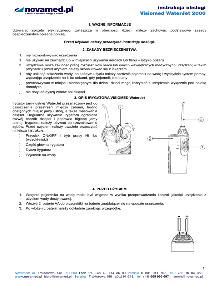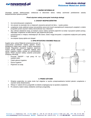 instrukcja obsługi Visiomed WaterJet 2000 1. WAŻNE INFORMACJE Używając sprzętu elektrycznego, bezpieczeństwa opisane poniżej. zwłaszcza w obecności dzieci, należy zachować podstawowe zasady Przed użyciem należy przeczytać instrukcję obsługi. 2. ZASADY BEZPIECZEŃSTWA 1. nie rozmontowywać urządzenia 1. nie używać na zewnątrz lub w miejscach używania aerozoli lub tlenu – ryzyko pożaru 3. urządzenie może zakłócać pracę rozruszników serca lub innych wewnętrznych medycznych urządzeń; w takim przypadku przed użyciem należy skonsultować się z lekarzem 1. aby uniknąć zakażenia wody, po każdym użyciu należy opróżnić pojemnik na wodę i wyczyścić system pompy, włączając urządzenie na kilka sekund, gdy pojemnik jest pusty przechowywać w miejscu niedostępnym dla dzieci; dzieci mogą korzystać z urządzenia wyłącznie pod opieką dorosłych nie dotykać dyszą zębów ani dziąseł 3. OPIS IRYGATORA VISIOMED WaterJet Irygator jamy ustnej WaterJet przeznaczony jest do czyszczenia przestrzeni między zębami, trudno dostępnych miejsc jamy ustnej, a także masowania dziąseł. Regularne używanie irygatora ogranicza rozwój chorób dziąseł i poprawia higienę jamy ustnej. Irygatora należy używać po szczotkowaniu zębów. Przed użyciem należy uważnie przeczytać niniejszą instrukcję. Przycisk ON/OFF i tryb pracy Hi -Lo (wysoki-niski) Część główna irygatora Dysza irygatora Pojemnik na wodę 4. PRZED UŻYCIEM 1. Wnętrze pojemnika na wodę może być wilgotne w wyniku przeprowadzania kontroli jakości urządzenia z użyciem wody destylowanej. 2. Włożyć 2 baterie AA do przegródki na baterie znajdującej się na spodzie urządzenia. 3. Po włożeniu baterii należy dokładnie zamknąć przegródkę. 1 Novamed: ul. Traktorowa 143 91-203 Łódź tel. +48 42 714 36 00 infolinia 0 801 011 707 NIP 732 10 04 353 www.novamed.pl [email protected] Serwis: Traktorowa 196 Łódź 91-218, tel: + 4 8 665 995 697 [email protected] instrukcja obsługi Visiomed WaterJet 2000 5. UŻYCIE IRYGATORA WaterJet Dokładnie założyć dyszę irygatora (rys. 1). Otworzyć i napełnić pojemnik na wodę (rys. 2,3) i dodać płyn do płukania jamy ustnej w razie konieczności. Temperatura wody nie powinna przekraczać 40 0. Zamknąć pojemnik. Włożyć irygator do jamy ustanej i pochylić się nad umywalką. UWAGA! podczas pierwszego użycia irygatora (jeśli nie wydobywa się płyn do płukania) należy włożyć do buzi końcówkę irygacyjną i dobrze pociągnąć :) (czyt. zassać : jak soczek przez słomkę) Irygator trzymać w pozycji pionowej, a dyszę skierować na zęby. Przesunąć przycisk na pozycję LO lub HI. Irygator rozpocznie pracę (rys. 4). Na początku zaleca się ustawienie irygatora na pozycji LO dopóki dziąsła nie przyzwyczają się do masażu i siły wibracji. Tryb HI – dokładne oczyszczanie Tryb LO – delikatne masowanie dziąseł Usta powinny być lekko otwarte tak, aby woda mogła swobodnie spływać do umywalki (rys. 5). Przesuwać dyszę irygatora wzdłuż zębów. Skierować strumień wody pod kątem 450 tuż nad linią dziąseł. Czyszczenie rozpocząć od tylnych zębów wzdłuż linii dziąseł. Kontynuować dopóki wszystkie miejsca wokół i między zębami nie zostaną wyczyszczone. (rys. 6). Upewnić się, że irygator ustawiony jest dyszą do góry – w przeciwnym razie nie będzie pobierał wody. Przed zdjęciem dyszy otwórz pojemnik i pozostałą wodę. Włączyć urządzenie na kilka sekund w celu wypompowania pozostałej wody znajdującej się w pojemniku lub końcówce irygatora. Zaleca się wykonanie powyższych czynności po każdym użyciu, aby uniknąć rozwoju bakterii. Jeśli dentysta zalecił użycie roztworu chloroheksydyny, po użyciu należy przepłukać irygator wodą z chloroheksydyną, aby powstrzymać powstawanie osadu. 6. PODSTAWOWE INFORMACJE DOTYCZĄCE UŻYCIA IRYGATORA 7. 8. 9. 10. 11. Nie wolno napełniać pojemnika gorącą wodą. Może uszkodzić dziąsła. Nigdy nie włączać irygatora przed włożeniem dyszy do ust. Nie dotykać dyszą irygatora zębów ani dziąseł. Nie wolno używać do czyszczenia innych części ciała, np. uszu lub oczu. Użytkownicy, którzy mają delikatne dziąsła mogą lekko krwawić na początku stosowania irygatora. Jeśli 2 Novamed: ul. Traktorowa 143 91-203 Łódź tel. +48 42 714 36 00 infolinia 0 801 011 707 NIP 732 10 04 353 www.novamed.pl [email protected] Serwis: Traktorowa 196 Łódź 91-218, tel: + 4 8 665 995 697 [email protected] instrukcja obsługi Visiomed WaterJet 2000 krwawienie nie ustępuje po kilku użyciach, należy skontaktować się z lekarzem. 12. Po każdym użyciu należy całkowicie opróżnić pojemnik na wodę. 7. CZYSZCZENIE IRYGATORA Wyłączyć irygator, usunąć pojemnik na wodę i zdjąć dyszę irygatora. Umyć pojemnik w ciepłej wodzie. Przetrzeć wilgotną ściereczką obudowę i irygator. Nie używać silnych środków czyszczących – mogą uszkodzić urządzenie. Nie zanurzać urządzenia w wodzie. Po wyczyszczeniu należy wytrzeć urządzenie do sucha. 8. DANE TECHNICZNE Zasilanie: 2 x baterie AA alkaliczne Wymiary: 28.7 x 5 x 6.5 cm Waga: 200g (bez baterii) 3 Novamed: ul. Traktorowa 143 91-203 Łódź tel. +48 42 714 36 00 infolinia 0 801 011 707 NIP 732 10 04 353 www.novamed.pl [email protected] Serwis: Traktorowa 196 Łódź 91-218, tel: + 4 8 665 995 697 [email protected] instrukcja obsługi Visiomed WaterJet 2000 Kartagwarancyjna Urządzenie objęte jest 24 miesięczną gwarancją liczoną od daty zakupu w przypadku uszkodzeń materiału lub produkcji. W ramach gwarancji uszkodzone elementy zostaną za darmo wymienione na nowe lub naprawione. Gwarancja nie obejmuje dostarczanych wraz z urządzeniem akcesoriów oraz części podlegających naturalnemu zużyciu. Urządzenie może być naprawiane wyłącznie przez autoryzowany serwis. Urządzenie należy przesłać do serwisu w celu naprawy w ciągu 8 dni od stw