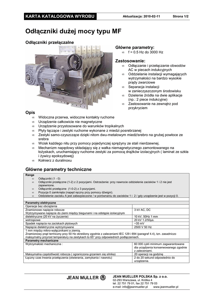 KARTA KATALOGOWA WYROBU Aktualizacja: 2010-02-11 Strona 1/2 Odłączniki duŜej mocy typu MF Odłączniki przełączalne Główne parametry: • f = 0.5 Hz do 3000 Hz Zastosowanie: • • • • • Odłączanie i przełączanie obwodów AC w piecach indukcyjnych Oddzielanie instalacji wymagających wytrzymałości na bardzo wysokie prądy zwarciowe Separacja instalacji w zanieczyszczonym środowisku Dzielenie źródła na dwie aplikacje (np.: 2 piece indukcyjne) Zastosowanie na zewnątrz pod przykryciem Opis • • • • • • • • Widoczna przerwa, widoczne kontakty ruchome Urządzenie całkowicie nie magnetyczne Urządzenie przystosowane do warunków tropikalnych Płyty łączące i zestyki ruchome wykonane z miedzi posrebrzanej Zestyki samo-czyszczące dzięki nitom dwu-metalowym miedź/srebro na grubej powłoce ze srebra Wcisk kaŜdego nitu przy pomocy pojedynczej spręŜyny ze stali nierdzewnej. Mechanizm napędowy składający się z wałka niemagnetycznego zamontowanego na łoŜyskach, uruchamiający ruchome zestyki za pomocą drąŜków izolacyjnych ( laminat ze szkła i Ŝywicy epoksydowej) Kołnierz z duralinoxu Główne parametry techniczne Range • • • • • Odłączniki (1 - 0) Odłączniki przełączne (1-2) z 2 pozycjami. OstrzeŜenie: przy nawrocie oddzielenie zacisków 1 i 2 nie jest zapewnione. Odłączniki przełączne (1-0-2) z 3 pozycjami. Pozycja 0 zamknięta (napęd ręczny przy pomocy dźwigni). Oddzielenie zacisku A jest zabezpieczone / w porównaniu do zacisków 1 i 2 / gdy urządzenie jest w pozycji 0. Parametry elektryczne Operacje bez obciąŜenia Znamionowe napięcie robocze 3 kV AC, DC Wytrzymywane napięcie do ziemi między biegunami i na odstępie izolacyjnym dielektryczne (20 kV na Ŝyczenie) 10 kV, 50Hz 1 mm wstrząsowe 20 kV 1.2/50µs. Spadek napięcia na zaciskach płytowych ~35 mV Napięcie dielektryczne wytrzymywane 2500 V 50 Hz 1 mm między mikro-wyłącznikami a ziemią. Znamionowy prąd termiczny przy 50 Hz określony zgodnie z zaleceniami IEC 129 i 694 (paragraf 4.4), tzn. zasadniczo maksymalny przyrost temperatury na zestykach to 65° przy odpowiednich podłączeniach. Parametry mechaniczne Wytrzymałość mechaniczna : 60 000 cykli minimum zagwarantowane dla urządzenia konserwowanego zgodnie z zaleceniami. Maksymalna częstotliwość robocza ( ograniczona grzaniem się silnika) 20 operacji na godzinę Łączny czas trwania przełączenia (otwierania, zamykania i nawrotu) 2 do 20 sekund odpowiednio do urządzenia. JEAN MUELLER POLSKA Sp. z o.o. 02-293 Warszawa, ul. Krótka 4 tel. 22 751 79 01, fax 22 751 79 03 e-mail: [email protected] www.jeanmueller.pl KARTA KATALOGOWA WYROBU Aktualizacja: 2010-02-11 Strona 2/2 Odłączniki duŜej mocy typu MF Akcesoria • • • • • Operacja ręczna przy pomocy dźwigni albo pokrętła plus przekładnia redukcyjna (ilość obrotów potrzebnych do wykonania manewru: 15 to 20). Operacja elektryczna przy pomocy silnika trójfazowego z przekładnią 220/380 V 50 Hz stosowanego teŜ przy 260/440 V 60 Hz oraz awaryjnego zdalnego pokrętła ( stopień ochrony: IP 44). Dwa uszczelnione oddzielające albo pozycyjne mikro-wyłączniki na jedną pozycję (wyposaŜenie standardowe). Nawrotniki bez NO + NC Typ TELEMECANIQUE XCK P118 zgodny z normami VDE 0660 część 2, CSA 22.2 nr 14 i uznany przez DEMKO - NEMKO - SEMKO : o Obwód rezystancyjny 220 V 50 Hz 10 A o Obwód indukcyjny 220 V 0 Hz 2.8 A 3026 JEAN MUELLER POLSKA Sp. z o.o. 02-293 Warszawa, ul. Krótka 4 tel. 22 751 79 01, fax 22 751 79 03 e-mail: [email protected] www.jeanmueller.pl