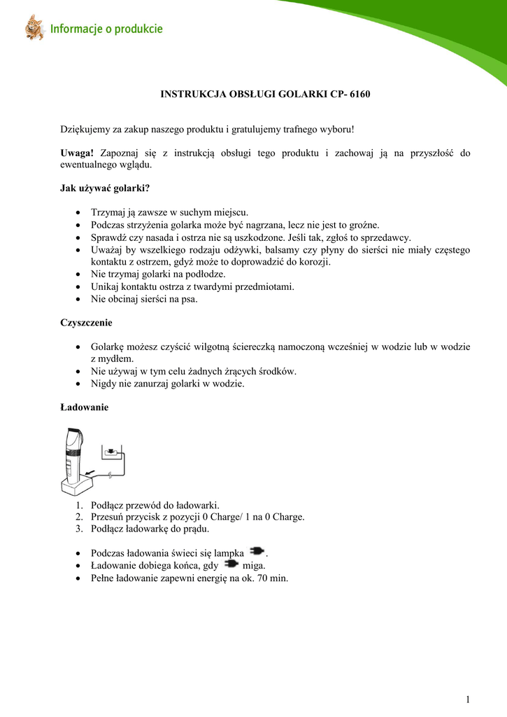 INSTRUKCJA OBSŁUGI GOLARKI CP- 6160 Dziękujemy za zakup naszego produktu i gratulujemy trafnego wyboru! Uwaga! Zapoznaj się z instrukcją obsługi tego produktu i zachowaj ją na przyszłość do ewentualnego wglądu. Jak używać golarki? Trzymaj ją zawsze w suchym miejscu. Podczas strzyżenia golarka może być nagrzana, lecz nie jest to groźne. Sprawdź czy nasada i ostrza nie są uszkodzone. Jeśli tak, zgłoś to sprzedawcy. Uważaj by wszelkiego rodzaju odżywki, balsamy czy płyny do sierści nie miały częstego kontaktu z ostrzem, gdyż może to doprowadzić do korozji. Nie trzymaj golarki na podłodze. Unikaj kontaktu ostrza z twardymi przedmiotami. Nie obcinaj sierści na psa. Czyszczenie Golarkę możesz czyścić wilgotną ściereczką namoczoną wcześniej w wodzie lub w wodzie z mydłem. Nie używaj w tym celu żadnych żrących środków. Nigdy nie zanurzaj golarki w wodzie. Ładowanie 1. Podłącz przewód do ładowarki. 2. Przesuń przycisk z pozycji 0 Charge/ 1 na 0 Charge. 3. Podłącz ładowarkę do prądu. Podczas ładowania świeci się lampka . Ładowanie dobiega końca, gdy miga. Pełne ładowanie zapewni energię na ok. 70 min. 1 Diody Podczas ładowania, wskazywany jest uzyskiwany poziom energii. Po całkowitym naładowaniu dioda miga co 1s. Po upływie 10 min. Od naładowania golarki, dioda miga co 2 sekundy wskazując odpowiedni poziom energii: „HIGH” wskazuje na całkowity poziom baterii „MID” wskazuje, że poziom baterii wynosi 60% lub mniej „LOW” wskazuje, że poziom baterii wynosi 10% lub mniej. Gdy dioda „LOW” zacznie migać należy rozpocząć ładowanie golarki. Ładowanie może także odbyć się poprzez bezpośrednie podpięcie kabla do golarki, a potem do gniazdka. Uwaga! Gdy kiedykolwiek okaże się, że baterie są rozładowane, a Ty potrzebujesz użyć golarki, możesz to zrobić podpinając ją do kabla w taki sam sposób jak do ładowania. Jeśli mimo to nie będzie działać to podładuj baterie na ok. minutę, a potem spróbuj użyć golarki ponownie. 2 Pamiętaj, by nie rozładować baterii całkowicie, poprzez pozostawianie jej włączonej, gdyż skraca to ich żywotność. Użytkowanie golarki Obróć pokrętło w prawo lub w lewo, aby ustawić odpowiednią wysokość ostrza. Jego regulowanie może przebiegać w 5 etapach - od 0,8 mm do 2,0 mm co 0,3 mm. Grzebienie 1. Wybierz długość przycinania oznaczoną na nasadzie. 2. Ustawić pokrętło na wielkość 0,8, a następnie przymocuj nasadę do maszynki, jak pokazano na ilustracji. Aby zdjąć nasadę z maszynki należy wykonać jedynie wskazany na ilustracji ruch: Montaż ostrza 1. Zdejmowanie ostrza Upewnij się, że golarka jest odłączona od prądu. Trzymaj ją skierowaną do góry i wciśnij ostrze kciukiem. Druga dłoń powinna go złapać. 3 2. Aby ponownie zamontować ostrze należy ustawić pokrętło na pozycję „2,0”, a następnie wcisnąć ostrze, tak by usłyszeć kliknięcie. Czyszczenie ostrza Zadbaj o to, by w golarce nie pozostała sierść. W tym celu użyj małej szczoteczki i usuń nią widoczne włosy na powierzchni ostrza. W kolejnym kroku zdejmij ostrze i usuń sierść z jego wszystkich zakamarków. Smarowanie ostrza Umieść kilka kropel oleju pomiędzy ruchomym i stałym ostrzem. Czynność tą możesz wykonywać przed i po strzyżeniu. Następnie ustaw pokrętło na pozucję „2.0” Wyrzucanie rozładowanych baterii 1. Usuń ostrze i wykręć śrubki. 4 2. Wyciągnij sprężynę, przykrywkę i uchwyt ostrza. 3. Wyciągnij tarczę, odsłoń oprawę, a następnie wyciągnij baterie. 4. Rozładuj baterie całkowicie zanim je wyrzucisz. 5. Uważaj, by nie doszło do ich spięcia. WAŻNE! 1. Nie zamieniaj baterii na inne, gdyż grozi to uszkodzeniem golarki. 2. Baterie zawierają substancje, które mogą być szkodliwe dla środowiska. Jeśli kiedykolwiek będziesz wyrzucać golarkę, usuń wcześniej baterie. 3. W celu ochrony środowiska upewnij się, czy miejsce, do którego wyrzucasz baterie jest do tego przystosowane. 5