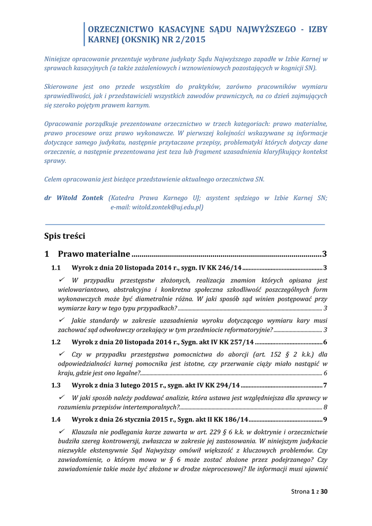 ORZECZNICTWO KASACYJNE SĄDU NAJWYŻSZEGO - IZBY KARNEJ (OKSNIK) NR 2/2015 Niniejsze opracowanie prezentuje wybrane judykaty Sądu Najwyższego zapadłe w Izbie Karnej w sprawach kasacyjnych (a także zażaleniowych i wznowieniowych pozostających w kognicji SN). Skierowane jest ono przede wszystkim do praktyków, zarówno pracowników wymiaru sprawiedliwości, jak i przedstawicieli wszystkich zawodów prawniczych, na co dzień zajmujących się szeroko pojętym prawem karnym. Opracowanie porządkuje prezentowane orzecznictwo w trzech kategoriach: prawo materialne, prawo procesowe oraz prawo wykonawcze. W pierwszej kolejności wskazywane są informacje dotyczące samego judykatu, następnie przytaczane przepisy, problematyki których dotyczy dane orzeczenie, a następnie prezentowana jest teza lub fragment uzasadnienia klaryfikujący kontekst sprawy. Celem opracowania jest bieżące przedstawienie aktualnego orzecznictwa SN. dr Witold Zontek (Katedra Prawa Karnego UJ; asystent sędziego w Izbie Karnej SN; e-mail: [email protected]) Spis treści 1 Prawo materialne .............................................................................................. 3 1.1 Wyrok z dnia 20 listopada 2014 r., sygn. IV KK 246/14 ................................................... 3 W przypadku przestępstw złożonych, realizacja znamion których opisana jest wielowariantowo, abstrakcyjna i konkretna społeczna szkodliwość poszczególnych form wykonawczych może być diametralnie różna. W jaki sposób sąd winien postępować przy wymiarze kary w tego typu przypadkach? ........................................................................................................... 3 Jakie standardy w zakresie uzasadnienia wyroku dotyczącego wymiaru kary musi zachować sąd odwoławczy orzekający w tym przedmiocie reformatoryjnie? .................................... 3 1.2 Wyrok z dnia 20 listopada 2014 r., Sygn. akt IV KK 257/14 ........................................... 6 Czy w przypadku przestępstwa pomocnictwa do aborcji (art. 152 § 2 k.k.) dla odpowiedzialności karnej pomocnika jest istotne, czy przerwanie ciąży miało nastąpić w kraju, gdzie jest ono legalne?....................................................................................................................................... 6 1.3 Wyrok z dnia 3 lutego 2015 r., sygn. akt IV KK 294/14 .................................................... 7 W jaki sposób należy poddawać analizie, która ustawa jest względniejsza dla sprawcy w rozumieniu przepisów intertemporalnych?.......................................................................................................... 8 1.4 Wyrok z dnia 26 stycznia 2015 r., Sygn. akt II KK 186/14 ............................................... 9 Klauzula nie podlegania karze zawarta w art. 229 § 6 k.k. w doktrynie i orzecznictwie budziła szereg kontrowersji, zwłaszcza w zakresie jej zastosowania. W niniejszym judykacie niezwykle ekstensywnie Sąd Najwyższy omówił większość z kluczowych problemów. Czy zawiadomienie, o którym mowa w § 6 może zostać złożone przez podejrzanego? Czy zawiadomienie takie może być złożone w drodze nieprocesowej? Ile informacji musi ujawnić Strona 1 z 30 ORZECZNICTWO KASACYJNE SĄDU NAJWYŻSZEGO - IZBY KARNEJ (OKSNIK) NR 2/2015 zawiadamiający|? Jak rozstrzygnąć problem udzielania łapówek w czynie ciągłym i następczego o nich zawiadomienia? ........................................................................................................................ 9 1.5 Wyrok z dnia 15 stycznia 2015 r. Sygn. akt V KK 361/14 ............................................. 20 Czy ilość (masa) odpadów lub substancji, o jakich mowa w art. 182 k.k. jest elementem przesądzającym o realizacji znamion tego typu? Czy brak jej precyzyjnego ustalenia pozwala na zastosowanie art. 5 § 2 k.p.k. i uniewinnienie oskarżonego? ...............................................................20 2 Prawo procesowe............................................................................................ 23 2.1 Postanowienie z dnia 22 stycznia 2015 r., Sygn. akt III KK 399/14 .......................... 23 Czy w przypadku umorzenia postępowania przygotowawczego, podejrzanemu, który ustanowił obrońcę w tej fazie przysługuje zwrot kosztów obrony?........................................................23 2.2 Postanowienie z dnia 9 stycznia 2015 r. sygn. akt IV KK 235/14 .............................. 26 W stosunku do jakich ustaleń faktycznych poczynionych przez sąd odwoławczy działa zakaz ne peius? .................................................................................................................................................................26 2.3 Postanowienie z dnia 26 lutego 2015 r., Sygn. akt III KK 23/15 ............................... 28 Czy obrońca z urzędu, który nie skorzystał z trybu przewidzianego w art. 84 § 2 k.p.k. i osobiście uczestniczył w rozprawie poza miejscem swojej siedzimy, może zakwalifikować koszty podróży, jako „niezbędne” w rozumieniu przepisów regulujących zasady ich zwrotu? .28 Strona 2 z 30 ORZECZNICTWO KASACYJNE SĄDU NAJWYŻSZEGO - IZBY KARNEJ (OKSNIK) NR 2/2015 1 Prawo materialne 1.1 Wyrok z dnia 20 listopada 2014 r., sygn. IV KK 246/14 Przepisy i problemy: art. 310 k.k., art. 53 k.k., 424 § 2 k.p.k. W przypadku przestępstw złożonych, realizacja znamion których opisana jest wielowariantowo, abstrakcyjna i konkretna społeczna szkodliwość poszczególnych form wykonawczych może być diametralnie różna. W jaki sposób sąd winien postępować przy wymiarze kary w tego typu przypadkach? Jakie standardy w zakresie uzasadnienia wyroku dotyczącego wymiaru kary musi zachować sąd odwoławczy orzekający w tym przedmiocie reformatoryjnie? Teza: Konstytucyjna zasada państwa prawnego wymaga, by wymiar kary za przestępstwo uwzględniał zasadę sprawiedliwości i równości, co nak