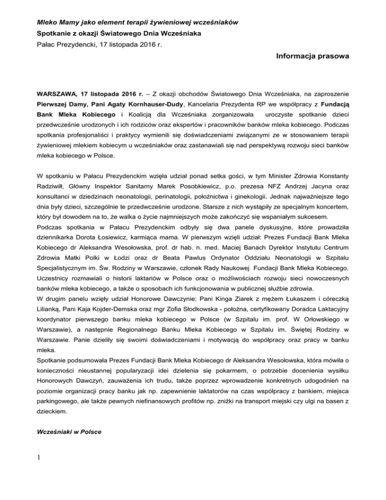 Mleko Mamy jako element terapii żywieniowej wcześniaków Spotkanie z okazji Światowego Dnia Wcześniaka Pałac Prezydencki, 17 listopada 2016 r. Informacja prasowa WARSZAWA, 17 listopada 2016 r. – Z okazji obchodów Światowego Dnia Wcześniaka, na zaproszenie Pierwszej Damy, Pani Agaty Kornhauser-Dudy, Kancelaria Prezydenta RP we współpracy z Fundacją Bank Mleka Kobiecego i Koalicją dla Wcześniaka zorganizowała uroczyste spotkanie dzieci przedwcześnie urodzonych i ich rodziców oraz ekspertów i pracowników banków mleka kobiecego. Podczas spotkania profesjonaliści i praktycy wymienili się doświadczeniami związanymi ze w stosowaniem terapii żywieniowej mlekiem kobiecym u wcześniaków oraz zastanawiali się nad perspektywą rozwoju sieci banków mleka kobiecego w Polsce. W spotkaniu w Pałacu Prezydenckim wzięła udział ponad setka gości, w tym Minister Zdrowia Konstanty Radziwiłł, Główny Inspektor Sanitarny Marek Posobkiewicz, p.o. prezesa NFZ Andrzej Jacyna oraz konsultanci w dziedzinach neonatologii, perinatologii, położnictwa i ginekologii. Jednak najważniejsze tego dnia były dzieci, szczególnie te przedwcześnie urodzone. Starsze z nich wystąpiły ze specjalnym koncertem, który był dowodem na to, że walka o życie najmniejszych może zakończyć się wspaniałym sukcesem. Podczas spotkania w Pałacu Prezydenckim odbyły się dwa panele dyskusyjne, które prowadziła dziennikarka Dorota Łosiewicz, karmiąca mama. W pierwszym wzięli udział: Prezes Fundacji Bank Mleka Kobiecego dr Aleksandra Wesołowska, prof. dr hab. n. med. Maciej Banach Dyrektor Instytutu Centrum Zdrowia Matki Polki w Łodzi oraz dr Beata Pawlus Ordynator Oddziału Neonatologii w Szpitalu Specjalistycznym im. Św. Rodziny w Warszawie, członek Rady Naukowej Fundacji Bank Mleka Kobiecego. Uczestnicy rozmawiali o historii laktariów w Polsce oraz o możliwościach rozwoju sieci nowoczesnych banków mleka kobiecego, a także o sposobach ich funkcjonowania w publicznej służbie zdrowia. W drugim panelu wzięły udział Honorowe Dawczynie: Pani Kinga Ziarek z mężem Łukaszem i córeczką Lilianką, Pani Kaja Kojder-Demska oraz mgr Zofia Słodkowska - położna, certyfikowany Doradca Laktacyjny koordynator pierwszego banku mleka kobiecego w Polsce (w Szpitalu im. prof. W Orłowskiego w Warszawie), a następnie Regionalnego Banku Mleka Kobiecego w Szpitalu im. Świętej Rodziny w Warszawie. Panie dzieliły się swoimi doświadczeniami i motywacją do współpracy oraz pracy w banku mleka. Spotkanie podsumowała Prezes Fundacji Bank Mleka Kobiecego dr Aleksandra Wesołowska, która mówiła o konieczności nieustannej popularyzacji idei dzielenia się pokarmem, o potrzebie docenienia wysiłku Honorowych Dawczyń, zauważenia ich trudu, także poprzez wprowadzenie konkretnych udogodnień na poziomie organizacji pracy banku jak np. zapewnienie laktatorów na czas współpracy z bankiem, miejsca parkingowego, ale także pewnych niefinansowych profitów np. zniżki na transport miejski czy ulgi na basen z dzieckiem. Wcześniaki w Polsce 1 Mleko Mamy jako element terapii żywieniowej wcześniaków Spotkanie z okazji Światowego Dnia Wcześniaka Pałac Prezydencki, 17 listopada 2016 r. Informacja prasowa Według definicji WHO (ang. World Health Organization; Światowa Organizacja Zdrowia) za noworodka przedwcześnie urodzonego uważa się dziecko urodzone po ukończeniu 22 a przed ukończeniem 37. tygodnia ciąży. Odsetek porodów przedwczesnych w Polsce stanowi ok. 6%. Dzieci urodzone przedwcześnie są narażone na znacznie gorszą sytuację zdrowotną, a co za tym idzie na zwiększoną śmiertelnością w okresie niemowlęcym w porównaniu do niemowląt urodzonych o czasie. Konsekwencją tego stanu jest długotrwały (niejednokrotnie 4-5 miesięczny) pobyt na oddziale noworodkowym, a początkowo - intensywnej terapii. Leczenie wcześniaka wiąże się z wielospecjalistyczną opieką medyczną i terapią powikłań takich jak: zaburzenia oddychania, krwotoki dokomorowe, martwicze zapalenie jelit, upośledzenie wzroku, słuchu lub trwałe ubytki neurologiczne, a także z ryzykiem nieprawidłowego rozwoju w przyszłości. „Codziennie rodzą się dzieci, które z różnych powodów przychodzą na świat zbyt wcześnie – mówiła Pani Prezydentowa Agata Kornhauser-Duda. - Kilkakrotnie miałam okazję spotkać się na oddziałach szpitalnych z wcześniakami i ich rodzicami. Są to dla mnie wyjątkowe chwile. Ogromne wrażenie robi atmosfera, która panuje na oddziałach, gdzie wraz z rodzicami i lekarzami o życie walczą maluszki. To chwile ciszy, wzruszenia, szeptem wypowiadanych słów, na głos czytanych bajek – mówiła. - Ale przede wszystkim jest to nadzieja i wiara w to, że uda się uratować nowo narodzone życie.” – powiedziała Pierwsza Dama. Powodzenie terapii dziecka przedwcześnie urodzonego zależy nie tylko od nowoczesnych urządzeń i technologii, ale także od .udziału w procesie leczenia obojga rodziców – ich obecności, bliskości, a także możliwości przekazania choćby niewielkich ilości pokarmu matczynego. Pokarm kobiecy ze względu na swój skład ma znaczenie prozdrowotne, ale dla wielu matek jest także wyrazem więzi łączącej ją z dzieckiem. „Poród przedwczesny i urodzenie dziecka z problemami zdrowotnymi wynikającym z wcześniactwa to olbrzymi stres dla matki. Dodatkowo kobieta boryka się w tym okresie również z własnymi problemami zdrowotnymi, co często wpływa na zaburzenie rozwoju laktacji. Dlatego działalność banków mleka kobiecego stanowi wieloaspektowe wsparcie dla matki. Nieuzasadnione poczucie winy wynikające z przedwczesnego zakończenia ciąży można zastąpić zaangażowaniem matki w poprawę stanu dziecka: jej obecność przy inkubatorze, a później przy łóżeczku dziecka, dotyk i głos mamy, ale również zapach pokarmu kobiecego od pierwszej godziny życia - to jest naprawdę najcenniejsze dla tego dziecka.” 