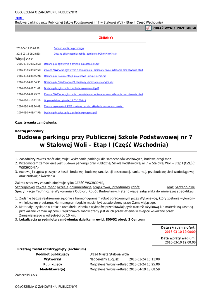 OGŁOSZENIA O ZAMÓWIENIU PUBLICZNYM XML Budowa parkingu przy Publicznej Szkole Podstawowej nr 7 w Stalowej Woli – Etap I (Część Wschodnia) POKAŻ WYNIK PRZETARGU ZMIANY: 2016-04-19 13:08:59: Dodano wynik do przetargu 2016-03-15 08:24:53: Dodano plik Przedmiar robót - zamienny POPRAWIONY.rar Więcej >>> 2016-03-15 08:23:57: Dodano plik ogłoszenie o zmianie ogłoszenia III.pdf 2016-03-15 08:22:52: Zmiana SIWZ oraz ogłoszenia o zamówieniu - zmiana terminu składania oraz otwarcia ofert 2016-03-14 09:55:21: Dodano plik Dokumentacja projektowa - uzupełnienie.rar 2016-03-14 09:54:30: Dodano plik Przedmiar robót zamienny - branża instalacyjna.rar 2016-03-14 09:51:02: Dodano plik ogłoszenie o zmianie ogłoszenia II.pdf 2016-03-14 09:49:23: Zmiana SIWZ oraz ogłoszenia o zamówieniu - zmiana terminu składania oraz otwarcia ofert 2016-03-11 15:22:23: Odpowiedzi na pytania (11.03.2016 r.) 2016-03-09 09:24:09: Zmiana ogłoszenia i SIWZ - zmiana terminu składania oraz otwarcia ofert 2016-03-09 08:47:52: Dodano plik ogłoszenie o zmianie ogłoszenia.pdf Czas trwania zamówienia: Rodzaj procedury: Budowa parkingu przy Publicznej Szkole Podstawowej nr 7 w Stalowej Woli – Etap I (Część Wschodnia) 1. Zasadniczy zakres robót obejmuje: Wykonanie parkingu dla samochodów osobowych, budowę drogi man 2. Przedmiotem zamówienia jest Budowa parkingu przy Publicznej Szkole Podstawowej nr 7 w Stalowej Woli – Etap I (CZĘŚĆ WSCHODNIA) 3. ewrowej i ciągów pieszych z kostki brukowej, budowę kanalizacji deszczowej, sanitarnej, przebudowę sieci wodociągowej oraz budowę oświetlenia. Zakres rzeczowy zadania obejmuje tylko CZEŚĆ WSCHODNIĄ. Szczegółowy zakres robót określa dokumentacja projektowa, przedmiary robót oraz Szczegółowe Specyfikacje Techniczne Wykonania i Odbioru Robót Budowlanych stanowiące załączniki do niniejszej specyfikacji. 1. Zadanie będzie realizowane zgodnie z harmonogramem robót opracowanym przez Wykonawcę, który zostanie wyłoniony w niniejszym przetargu. Harmonogram będzie musiał być zatwierdzony przez Zamawiającego. 2. Materiały uzyskane w trakcie rozbiórek i ziemia z wykopów przedstawiających wartość użytkową lub materialną zostaną przekazane Zamawiającemu. Wykonawca zobowiązany jest di ich przewiezienia w miejsce wskazane przez Zamawiającego w odległości do 10 km. 3. Lokalizacja przedmiotu zamówienia: działka nr ewid. 800/52 obręb 3 Centrum Data składania ofert: 2016-03-10 12:00:00 Data wpłaty wadium: 2016-03-10 12:00:00 Przetarg został rozstrzygnięty (archiwum) Podmiot publikujący Urząd Miasta Stalowa Wola Wytworzył Nadbereżny Lucjusz Publikujący Magdalena Wrońska-Bulec 2016-02-24 15:25:00 Modyfikował(a) Magdalena Wrońska-Bulec 2016-04-19 13:08:59 Załączniki >>> OGŁOSZENIA O ZAMÓWIENIU PUBLICZNYM 2016-02-24 15:11:00 OGŁOSZENIA O ZAMÓWIENIU PUBLICZNYM Pliki: Lp. Nazwa Rozmiar 1. ogłoszenie o zamówieniu - pobierz plik 387.77 Kb 2. SIWZ - pobierz plik 892.40 Kb 3. formularz ofertowy + załączniki- pobierz plik 142.50 Kb 4. formularz ofertowy + załączniki- pobierz plik 433.15 Kb 5. wzór umowy- pobierz plik 592.00 Kb 6. dokumentacja projektowa-pobierz plik 34.54 MB 7. przedmiary robót- pobierz plik 1.25 MB 8. szczegółowe specyfikacje techniczne - pobierz plik 5.90 MB 9. ogłoszenie o zmianie ogłoszenia 303.03 Kb 10. ogłoszenie o zmianie ogłoszenia (14.03.2016 r.) 294.51 Kb 11. przedmiar robót zamienny - branża instalacyjna 150.07 Kb 12. Dokumentacja projektowa - uzupełnienie - pobierz plik 14.61 MB 13. ogłoszenie o zmianie ogłoszenia (15.03.2016 r.) - pobierz plik 302.10 Kb 14. przedmiar robót zamienny POPRAWIONY - branża instalacyjna - pobierz plik 142.76 Kb Rejestr zmian OGŁOSZENIA O ZAMÓWIENIU PUBLICZNYM Typ