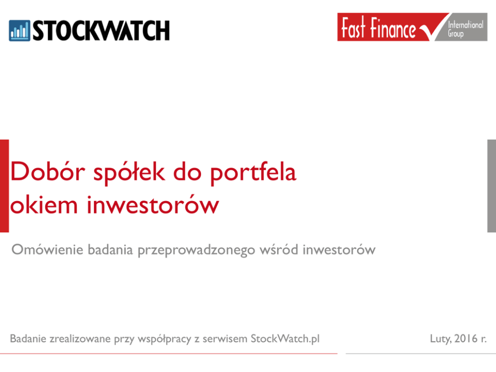 Dobór spółek do portfela okiem inwestorów Omówienie badania przeprowadzonego wśród inwestorów Badanie zrealizowane przy współpracy z serwisem StockWatch.pl Luty, 2016 r. Podsumowanie najważniejszych wyników 94% inwestorów docenia reputacje spółki 71% inwestorów uważa za bardzo ważne lub niezbędne analizy i raporty niezależnych ekspertów 97% inwestorów sprawdza przed podjęciem decyzji stabilność osiąganych przez spółkę zysków równoważy swoje inwestycje poprzez stawianie na małe i duże spółki 89% 99% ankietowanych uważa, że perspektywy branży, w której działa spółka są co najmniej istotne 49% ankietowanych Okiem inwestorów Inwestorzy zwracają uwagę czy znaczący akcjonariusze bezpośrednio zarządzają spółką – taki element sprawdza ankietowanych 86% Spółka zyskuje według inwestorów, jeśli Zarząd jest zaangażowany kapitałowo w papiery wartościowe wyemitowane przez spółkę Bogate doświadczenie Zarządu jest co najmniej istotne dla 85% inwestorów 2 O badaniu Organizatorzy Wyniki Metryczka FAST FINANCE na rynku kapitałowym O badaniu Badanie Jak budować swój portfel inwestycyjny? zostało przeprowadzone w listopadzie 2015 roku. Ankieta została skierowana do inwestorów – subskrybentów serwisu StockWatch.pl. Pytania zadane inwestorom miały na celu sprawdzenie, jakimi kryteriami kierują się inwestorzy przy doborze spółek do swojego portfela. 4 O badaniu Organizatorzy Wyniki Metryczka FAST FINANCE na rynku kapitałowym Organizatorzy O FAST FINANCE Spółka znajduje się w czołówce operujących na polskim rynku firm wyspecjalizowanych w wierzytelnościach detalicznych 99% portfela spółki to wierzytelności detaliczne; 90% portfela to wierzytelności nabyte od banków Spółka obsługuje portfel wierzytelności o wartości nominalnej przekraczającej 0,5 mld zł FAST FINANCE posiada własny Niestandardowy Sekurytyzacyjny Fundusz Inwestycyjny Zamknięty FAST FINANCE zadebiutował na rynku NewConnect w 2008 roku Na runku podstawowym GPW akcje spółki są notowane od 2010 roku Spółka wyemitowała łącznie 13 serii obligacji o wartości ponad 22 mln zł, z czego wykupiła 5 serii o wartości niemal 40 mln zł 6 Organizatorzy O StockWatch.pl Portal sięga głęboko do podstaw finansowych spółek, dostarczając unikatowych narzędzi służących analizie fundamentalnej. Zespół analityków StockWatch co roku analizuje kilkaset raportów okresowych i ofert IPO StockWatch.pl zawiera pełne informacje o ponad 905 spółkach notowanych na rynku głównym i w alternatywnym systemie obrotu Portal posiada ok. 58 tys. zarejestrowanych użytkowników, którzy aktywnie uczestniczą w dyskusjach na forum i korzystają z narzędzi dla inwestorów. W ciągu roku stronę odwiedza ponad 1,2 mln unikalnych użytkowników Liczne udostępnianie materiały poradnikowo-edukacyjne, są przygotowywane przez zespół ludzi pasjonujących się giełdą Serwis umożliwia kontakt z innymi inwestorami, wymianę wiedzy i doświadczeń. Ponadto pozwala na kontakt z przedstawicielami spółek podczas organizowanych regularnie czatów inwestorskich StockWatch.pl posiada tytuł Partnera RI Giełdy Papierów Wartościowych oraz status agencji Informacyjnej rynku kapitałowego potwierdzony przez Komisję Nadzoru Finansowego 7 O badaniu Organizatorzy Wyniki Metryczka FAST FINANCE na rynku kapitałowym Jak budować swój portfel inwestycyjny? Wyniki badania Który typ spółek dominuje w portfelu inwestorów? 15% Trudno określić, inwestycje intuicyjne 10% Największe spółki tzw. blue chips 18% Spółki o dużym potencjale (w tym z sektora MSP) 49% Portfel zdywersyfikowany (równoważący inwestycje w małe i duże spółki) 8% Spółki z modnych branż (np. high-tech) 10 Jakie znaczenie dla inwestorów mają poszczególne elementy przy ocenie atrakcyjności spółki? Wyniki badania Jakie znaczenie dla inwestorów przy ocenie atrakcyjności spółki mają: perspektywy rozwoju branży, w której działa spółka? 1% Nieistotne 21% Element niezbędny 32% Istotne, ale nie decydujące 46% Bardzo ważne 12 Wyniki badania Jakie znaczenie dla inwestorów przy ocenie atrakcyjności spółki ma: pozycja rynkowa? 3% Nieistotne 6% Element niezbędny 7% Mało znaczące 39 % Istotne, ale nie decydujące 46% Bardzo ważne 13 Wyniki badania Jakie znaczenie dla inwestorów przy ocenie atrakcyjności spółki ma: reputacja spółki? 13% Element niezbędny 6% Mało znaczące 38 % Istotne, ale nie decydujące 44% Bardzo ważne 14 Wyniki badania Jakie znaczenie dla inwestorów przy ocenie atrakcyjności spółki ma: efektywny model biznesowy? 7% Element niezbędny 10% Mało znaczące 36 % Istotne, ale nie decydujące 47% Bardzo ważne 15 Wyniki badania Jakie znaczenie dla inwestorów przy ocenie atrakcyjności spółki mają: plany inwestycyjne? 1% 10% Element niezbędny Nieistotne 6% Mało znaczące 33 % Istotne, ale nie decydujące 50% Bardzo ważne 16 Wyniki badania Jakie znaczenie dla inwestorów przy ocenie atrakcyjności spółki mają: historyczne wyniki finansowe? 3% 4% Nieistotne 15% Element niezbędny Mało znaczące 25% Bardzo ważne 53 % Istotne, ale nie decydujące 17 Wyniki badania Jakie znaczenie dla inwestorów przy ocenie atrakcyjności spółki ma: stabilność zysków? 1% Nieistotne 13% Element niezbędny 1% Mało znaczące 49% Bardzo ważne 36 % Istotne, ale nie decydujące 18 Wyniki badania Jakie znaczenie dla inwestorów przy ocenie atrakcyjności spółki ma: odporność na wahania koniunktury makroekonomicznej? 3% Nieistotne 5% Element niezbędny 15% Mało znaczące 35% Bardzo ważne 42% Istotne, ale nie decydujące 19 Wyniki badania Jakie znaczenie dla inwestorów przy ocenie atrakcyjności spółki ma: aktywna komunikacja? 15% Element niezbędny 6% Nieistotne 18% Mało znaczące 35% Bardzo ważne 26 % Istotne, ale nie decydujące 20 Jakie znaczenie dla inwestorów mają informacje dotyczące Zarządu oraz struktury akcjonariatu? Wyniki badania J
