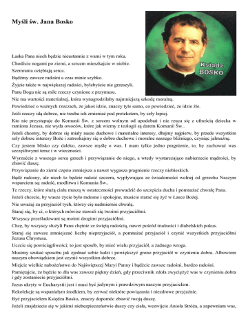 Myśli św. Jana Bosko Łaska Pana niech będzie nieustannie z wami w tym roku. Chodźcie nogami po ziemi, a sercem mieszkajcie w niebie. Szemrania oziębiają serca. Bądźmy zawsze radośni a czas minie szybko. Żyjcie także w największej radości, bylebyście nie grzeszyli. Panu Bogu nie są miłe rzeczy czynione z przymusu. Nie ma wartości materialnej, która wynagrodziłaby najmniejszą szkodę moralną. Powiedzieć o ważnych rzeczach, że jakoś idzie, znaczy tyle samo, co powiedzieć, że idzie źle. Jeśli rzeczy idą dobrze, nie trzeba ich zmieniać pod pretekstem, by szły lepiej. Kto nie przystępuje do Komunii Św. z sercem wolnym od upodobań i nie rzuca się z ufnością dziecka w ramiona Jezusa, nie wyda owoców, które jak wiemy z teologii są darem Komunii Św.. Jeżeli chcemy, by dobrze się miały nasze duchowe i materialne interesy, dbajmy najpierw, by przede wszystkim szły dobrze interesy Boże i zatroskajmy się o dobro duchowe i moralne naszego bliźniego, czyniąc jałmużnę. Czy jestem blisko czy daleko, zawsze myślę o was. I mam tylko jedno pragnienie, to, by zachować was szczęśliwymi teraz i w wieczności. Wyrzućcie z waszego serca grzech i przywiązanie do niego, a wtedy wystarczająco nabierzecie mądrości, by zbawić duszę. Przywiązanie do ziemi często zmniejsza a nawet wygasza pragnienie rzeczy niebieskich. Bądź radosny, ale niech to będzie radość szczera, wypływająca ze świadomości wolnej od grzechu Naszym wsparciem są: radość, modlitwa i Komunia Św.. Te rzeczy, które służą ciału muszą w ostateczności prowadzić do szczęścia ducha i pomnażać chwałę Pana. Jeżeli chcecie, by wasze życie było radosne i spokojne, musicie starać się żyć w Łasce Bożej. Nie uważaj za przyjaciół tych, którzy cię nadmiernie chwalą. Staraj się, by ci, o których mówisz stawali się twoimi przyjaciółmi. Wszyscy prześladowani są moimi drogimi przyjaciółmi. Chcę, by wszyscy służyli Panu chętnie ze świętą radością, nawet pośród trudności i diabelskich pokus. Staraj się zawsze zmniejszać liczbę nieprzyjaciół, a pomnażać przyjaciół i czynić wszystkich przyjaciółmi Jezusa Chrystusa. Uczcie się powściągliwości; to jest sposób, by mieć wielu przyjaciół, a żadnego wroga. Musimy szukać sposobu jak zjednać sobie ludzi i powiększyć grono przyjaciół w czynieniu dobra. Albowiem naszym obowiązkiem jest czynić wszystkim dobrze. Miejcie wielkie nabożeństwo do Najświętszej Maryi Panny i bądźcie zawsze radośni, bardzo radośni. Pamiętajcie, że będzie to dla was zawsze piękny dzień, gdy przeciwnik zdoła zwyciężyć was w czynieniu dobra i gdy zostaniecie przyjaciółmi. Jezus ukryty w Eucharystii jest i musi być jedynym i prawdziwym naszym przyjacielem. Rekolekcje są wspaniałym środkiem, by zerwać niektóre powiązania i niezdrowe przyjaźnie. Być przyjacielem Księdza Bosko, znaczy dopomóc zbawić twoją duszę. Jeżeli znajdziecie się w jakimś niebezpieczeństwie duszy czy ciała, wezwijcie Anioła Stróża, a zapewniam was, że Ten będzie wam towarzyszył i was uwolni. Dbajcie w szczególny sposób o dzieci, chorych, starszych i biednych a zasłużycie sobie na Błogosławieństwo Boże i szacunek ludzi. Najlepszą rzeczą jaką można uczynić na świecie jest sprowadzić zagubione dusze na drogę cnoty, wiodącą do Boga. Osobom chorym za wszelkie umartwienia cielesne wystarczy posłusznie spełnianie zaleceń lekarza i opiekunów oraz spokojne w duchu miłości do Boga znoszenie własnych cierpień. Pocierp chociaż trochę dla tego Boga, który tyle wycierpiał dla ciebie. Bądź zdolny upokorzyć się w każdym działaniu jeśli ma to służyć zbawieniu dusz. Nie wszyscy mogą pościć i składać obfite jałmużny, odbywać długie pielgrzymki dla chwały Bożej, ale wszyscy mogą kochać Boga, wystarczy tylko chcieć. Kochaj twoje zadania, jeśli chcesz je dobrze spełniać. Aby miłość była braterska musi dobro jednego człowieka być dobrem wszystkich, a grzech jednego - grzechem wszystkich czy chcemy czy nie jest odpowiedzialność zbiorowa. Kto wie, że jest kochany kocha. A kto jest kochany otrzyma wszystko od młodzieży. By czynić dobrze trzeba mieć trochę odwagi, cierpliwie znosić wszystkie niedostatki, nie krzywdzić nigdy nikogo i zawsze kochać. Ten kto jest pokorny i kochający, będzie zawsze kochany przez wszystkich, przez Boga i przez ludzi. Choroby duszy chcą być przynajmniej tak taktowane jak choroby ciała. Jeżeli znajdziecie się w jakimś niebezpieczeństwie duszy czy ciała, wezwijcie Anioła Stróża, a zapewniam was, że Ten będzie wam towarzyszył i was uwolni. Módl się do swojego Anioła Stróża, by przyszedł cię pocieszyć i towarzyszył ci w chwili śmierci. Jeśli chodzi o służenie tak Dobremu Ojcu jak Bogu, trzeba być gotowym poświęcić wszystko. Staraj się dobrym słowem i przykładem zbawiać dusze tam, gdzie Pan cię przeznaczy. Bądźcie roztropni, ale nie zapominajmy, że nasza roztropność musi zawsze polegać na ocaleniu wiary, sumienia i naszej duszy. Przyjmujmy za maksymę, że jeśli jakieś dzieło rozwija się pomyślnie to jest pewne, że pochodzi od Boga a nie od szatana. Masz tylko jedną duszę i jeśli będzie zbawiona, wszystko zbawione. Jeśli stracona wszystko stracone na zawsze. Pozwólcie mi zbawić wiele dusz. Diabeł pracuje bez odpoczynku, by je zgubić. A my pracujmy bez wytchnienia by je ocalić. Najpierw miłość trzeba okazać własnej duszy. Pan Bóg zasługuje na naszą miłość, bo nas stworzył, odkupił, obdarzył niezliczonymi dobrami i przygotował nagrodę każdemu, kto zachowuje jego przykazania. Mamy tylko jedną duszę. Gdybyśmy mieli dwie, może moglibyśmy dać jedną diabłu, by zadowolić swoje namiętności. Ale mamy tylko jedną. Chciałbym, aby każdy z was uczynił taką refleksję: co uczyniłem w przeszłości dla mojej duszy Jak prezentuję się obecnie w oblic