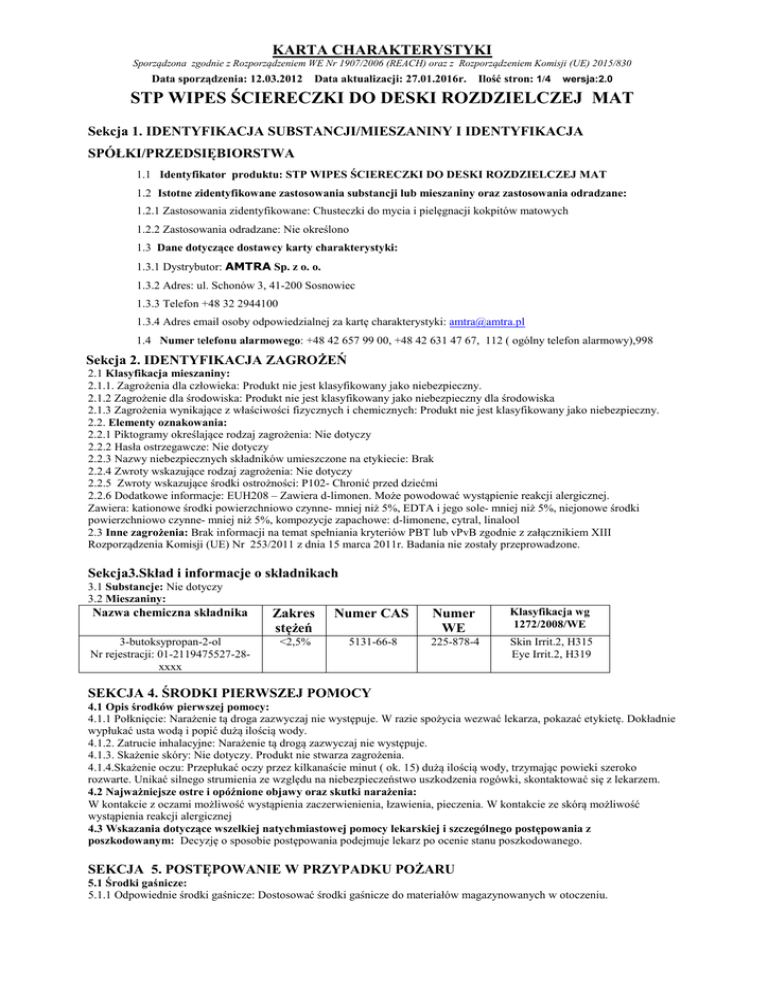 KARTA CHARAKTERYSTYKI Sporządzona zgodnie z Rozporządzeniem WE Nr 1907/2006 (REACH) oraz z Rozporządzeniem Komisji (UE) 2015/830 Data sporządzenia: 12.03.2012 Data aktualizacji: 27.01.2016r. Ilość stron: 1/4 wersja:2.0 STP WIPES ŚCIERECZKI DO DESKI ROZDZIELCZEJ MAT Sekcja 1. IDENTYFIKACJA SUBSTANCJI/MIESZANINY I IDENTYFIKACJA SPÓŁKI/PRZEDSIĘBIORSTWA 1.1 Identyfikator produktu: STP WIPES ŚCIERECZKI DO DESKI ROZDZIELCZEJ MAT 1.2 Istotne zidentyfikowane zastosowania substancji lub mieszaniny oraz zastosowania odradzane: 1.2.1 Zastosowania zidentyfikowane: Chusteczki do mycia i pielęgnacji kokpitów matowych 1.2.2 Zastosowania odradzane: Nie określono 1.3 Dane dotyczące dostawcy karty charakterystyki: 1.3.1 Dystrybutor: AMTRA Sp. z o. o. 1.3.2 Adres: ul. Schonów 3, 41-200 Sosnowiec 1.3.3 Telefon +48 32 2944100 1.3.4 Adres email osoby odpowiedzialnej za kartę charakterystyki: [email protected] 1.4 Numer telefonu alarmowego: +48 42 657 99 00, +48 42 631 47 67, 112 ( ogólny telefon alarmowy),998 Sekcja 2. IDENTYFIKACJA ZAGROŻEŃ 2.1 Klasyfikacja mieszaniny: 2.1.1. Zagrożenia dla człowieka: Produkt nie jest klasyfikowany jako niebezpieczny. 2.1.2 Zagrożenie dla środowiska: Produkt nie jest klasyfikowany jako niebezpieczny dla środowiska 2.1.3 Zagrożenia wynikające z właściwości fizycznych i chemicznych: Produkt nie jest klasyfikowany jako niebezpieczny. 2.2. Elementy oznakowania: 2.2.1 Piktogramy określające rodzaj zagrożenia: Nie dotyczy 2.2.2 Hasła ostrzegawcze: Nie dotyczy 2.2.3 Nazwy niebezpiecznych składników umieszczone na etykiecie: Brak 2.2.4 Zwroty wskazujące rodzaj zagrożenia: Nie dotyczy 2.2.5 Zwroty wskazujące środki ostrożności: P102- Chronić przed dziećmi 2.2.6 Dodatkowe informacje: EUH208 – Zawiera d-limonen. Może powodować wystąpienie reakcji alergicznej. Zawiera: kationowe środki powierzchniowo czynne- mniej niż 5%, EDTA i jego sole- mniej niż 5%, niejonowe środki powierzchniowo czynne- mniej niż 5%, kompozycje zapachowe: d-limonene, cytral, linalool 2.3 Inne zagrożenia: Brak informacji na temat spełniania kryteriów PBT lub vPvB zgodnie z załącznikiem XIII Rozporządzenia Komisji (UE) Nr 253/2011 z dnia 15 marca 2011r. Badania nie zostały przeprowadzone. Sekcja3.Skład i informacje o składnikach 3.1 Substancje: Nie dotyczy 3.2 Mieszaniny: Nazwa chemiczna składnika Zakres stężeń Numer CAS Numer WE Klasyfikacja wg 1272/2008/WE 3-butoksypropan-2-ol Nr rejestracji: 01-2119475527-28xxxx <2,5% 5131-66-8 225-878-4 Skin Irrit.2, H315 Eye Irrit.2, H319 SEKCJA 4. ŚRODKI PIERWSZEJ POMOCY 4.1 Opis środków pierwszej pomocy: 4.1.1 Połknięcie: Narażenie tą droga zazwyczaj nie występuje. W razie spożycia wezwać lekarza, pokazać etykietę. Dokładnie wypłukać usta wodą i popić dużą ilością wody. 4.1.2. Zatrucie inhalacyjne: Narażenie tą drogą zazwyczaj nie występuje. 4.1.3. Skażenie skóry: Nie dotyczy. Produkt nie stwarza zagrożenia. 4.1.4.Skażenie oczu: Przepłukać oczy przez kilkanaście minut ( ok. 15) dużą ilością wody, trzymając powieki szeroko rozwarte. Unikać silnego strumienia ze względu na niebezpieczeństwo uszkodzenia rogówki, skontaktować się z lekarzem. 4.2 Najważniejsze ostre i opóźnione objawy oraz skutki narażenia: W kontakcie z oczami możliwość wystąpienia zaczerwienienia, łzawienia, pieczenia. W kontakcie ze skórą możliwość wystąpienia reakcji alergicznej 4.3 Wskazania dotyczące wszelkiej natychmiastowej pomocy lekarskiej i szczególnego postępowania z poszkodowanym: Decyzję o sposobie postępowania podejmuje lekarz po ocenie stanu poszkodowanego. SEKCJA 5. POSTĘPOWANIE W PRZYPADKU POŻARU 5.1 Środki gaśnicze: 5.1.1 Odpowiednie środki gaśnicze: Dostosować środki gaśnicze do materiałów magazynowanych w otoczeniu. KARTA CHARAKTERYSTYKI Sporządzona zgodnie z Rozporządzeniem WE Nr 1907/2006 (REACH) oraz z Rozporządzeniem Komisji (UE) 2015/830 Data sporządzenia: 12.03.2012 Data aktualizacji: 27.01.2016r. Ilość stron: 2/4 wersja:2.0 STP WIPES ŚCIERECZKI DO DESKI ROZDZIELCZEJ MAT 5.1.2 Niewłaściwe środki gaśnicze: Nie są znane. 5.2 Szczególne zagrożenia związane z mieszaniną: Podczas spalania mogą tworzyć się toksyczne spaliny zawierające tlenki węgla. Unikać wdychania. 5.3 Informacje dla straży pożarnej: Środki ochrony ogólnej typowe w przypadku pożaru. Nie należy przebywać w zagrożonej ogniem strefie bez odpowiedniego ubrania odpornego na chemikalia i aparatu do oddychania z niezależnym obiegiem powietrza. Zagrożone pożarem zbiorniki usunąć jeśli to możliwe i nie wiąże się z nadmiernym ryzykiem lub chłodzić rozpyloną wodą z odpowiedniej odległości. SEKCJA 6. POSTĘPOWANIE W PRZYPADKU NIEZAMIERZONEGO UWOLNIENIA DO ŚRODOWISKA 6.1 Indywidualne środki ostrożności, wyposażenie ochronne i procedury w sytuacjach awaryjnych: 6.1.1 Dla osób niezależących do personelu likwidującego skutki awarii: Ograniczyć dostęp osób postronnych do obszaru awarii do czasu usunięcia awarii. Stosować środki ochrony indywidualnej. Unikać długotrwałego kontaktu ze skórą. Unikać kontaktu z oczami. Przestrzegać zasad i przepisów BHP obowiązujących przy pracy z preparatami chemicznymi. 6.1.2 Dla osób likwidujących skutki awarii: Usuwanie awarii i jej skutków może przeprowadzać wyłącznie przeszkolony personel. Stosować odzież ochronną na chemikalia. 6.2 Środki ostrożności w zakresie ochrony środowiska: Nie dopuścić do przedostania się do źródeł wody pitnej, gleby, kanalizacji. W razie potrzeby powiadomić władze i służby ratownictwa chemicznego. 6.3 Metody i materiały zapobiegające rozprzestrzenieniu się skażenia i służące do usuwania skażenia: Zbierać mechanicznie. Zebrany materiał potraktować jak odpady. 6.4 Odniesienia do innych sekcji: Postępowanie z odpadami produktu – sekcja 13 karty charakterystyki, środki ochrony indywidualnej – sekcja 8 karty charakterystyki SEKCJA 7. PO