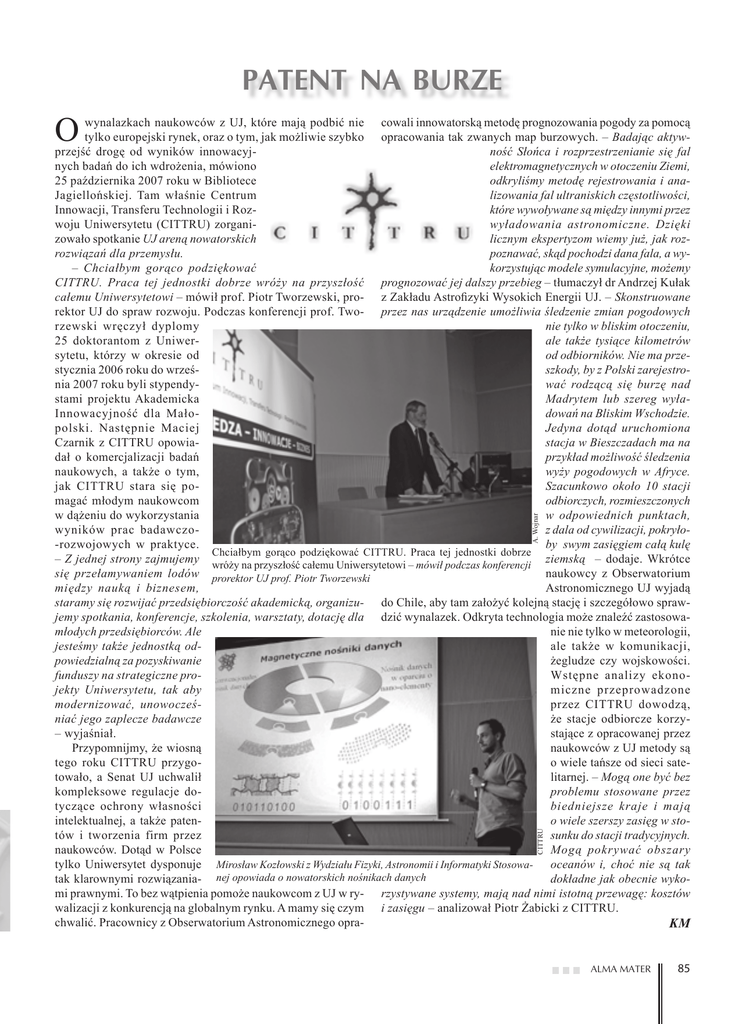 PATENT NA BURZE O CITTRU A. Wojnar wynalazkach naukowców z UJ, które mają podbić nie cowali innowatorską metodę prognozowania pogody za pomocą tylko europejski rynek, oraz o tym, jak możliwie szybko opracowania tak zwanych map burzowych. – Badając aktywprzejść drogę od wyników innowacyjność Słońca i rozprzestrzenianie się fal nych badań do ich wdrożenia, mówiono elektromagnetycznych w otoczeniu Ziemi, 25 października 2007 roku w Bibliotece odkryliśmy metodę rejestrowania i anaJagiellońskiej. Tam właśnie Centrum lizowania fal ultraniskich częstotliwości, Innowacji, Transferu Technologii i Rozktóre wywoływane są między innymi przez woju Uniwersytetu (CITTRU) zorganiwyładowania astronomiczne. Dzięki zowało spotkanie UJ areną nowatorskich licznym ekspertyzom wiemy już, jak rozrozwiązań dla przemysłu. poznawać, skąd pochodzi dana fala, a wy– Chciałbym gorąco podziękować korzystując modele symulacyjne, możemy CITTRU. Praca tej jednostki dobrze wróży na przyszłość prognozować jej dalszy przebieg – tłumaczył dr Andrzej Kułak całemu Uniwersytetowi – mówił prof. Piotr Tworzewski, pro- z Zakładu Astrofizyki Wysokich Energii UJ. – Skonstruowane rektor UJ do spraw rozwoju. Podczas konferencji prof. Two- przez nas urządzenie umożliwia śledzenie zmian pogodowych rzewski wręczył dyplomy nie tylko w bliskim otoczeniu, 25 doktorantom z Uniwerale także tysiące kilometrów sytetu, którzy w okresie od od odbiorników. Nie ma przestycznia 2006 roku do wrześszkody, by z Polski zarejestronia 2007 roku byli stypendywać rodzącą się burzę nad stami projektu Akademicka Madrytem lub szereg wyłaInnowacyjność dla Małodowań na Bliskim Wschodzie. polski. Następnie Maciej Jedyna dotąd uruchomiona Czarnik z CITTRU opowiastacja w Bieszczadach ma na dał o komercjalizacji badań przykład możliwość śledzenia naukowych, a także o tym, wyży pogodowych w Afryce. jak CITTRU stara się poSzacunkowo około 10 stacji magać młodym naukowcom odbiorczych, rozmieszczonych w dążeniu do wykorzystania w odpowiednich punktach, wyników prac badawczoz dala od cywilizacji, pokryło-rozwojowych w praktyce. by swym zasięgiem całą kulę Chciałbym gorąco podziękować CITTRU. Praca tej jednostki dobrze – Z jednej strony zajmujemy ziemską – dodaje. Wkrótce wróży na przyszłość całemu Uniwersytetowi – mówił podczas konferencji naukowcy z Obserwatorium się przełamywaniem lodów prorektor UJ prof. Piotr Tworzewski Astronomicznego UJ wyjadą między nauką i biznesem, staramy się rozwijać przedsiębiorczość akademicką, organizu- do Chile, aby tam założyć kolejną stację i szczegółowo sprawjemy spotkania, konferencje, szkolenia, warsztaty, dotację dla dzić wynalazek. Odkryta technologia może znaleźć zastosowamłodych przedsiębiorców. Ale nie nie tylko w meteorologii, jesteśmy także jednostką odale także w komunikacji, powiedzialną za pozyskiwanie żegludze czy wojskowości. funduszy na strategiczne proWstępne analizy ekonojekty Uniwersytetu, tak aby miczne przeprowadzone modernizować, unowocześprzez CITTRU dowodzą, niać jego zaplecze badawcze że stacje odbiorcze korzy– wyjaśniał. stające z opracowanej przez Przypomnijmy, że wiosną naukowców z UJ metody są tego roku CITTRU przygoo wiele tańsze od sieci satetowało, a Senat UJ uchwalił litarnej. – Mogą one być bez kompleksowe regulacje doproblemu stosowane przez tyczące ochrony własności biedniejsze kraje i mają intelektualnej, a także pateno wiele szerszy zasięg w stotów i tworzenia firm przez sunku do stacji tradycyjnych. naukowców. Dotąd w Polsce Mogą pokrywać obszary tylko Uniwersytet dysponuje Mirosław Kozłowski z Wydziału Fizyki, Astronomii i Informatyki Stosowa- oceanów i, choć nie są tak tak klarownymi rozwiązania- nej opowiada o nowatorskich nośnikach danych dokładne jak obecnie wykomi prawnymi. To bez wątpienia pomoże naukowcom z UJ w ry- rzystywane systemy, mają nad nimi istotną przewagę: kosztów walizacji z konkurencją na globalnym rynku. A mamy się czym i zasięgu – analizował Piotr Żabicki z CITTRU. chwalić. Pracownicy z Obserwatorium Astronomicznego opraKM ALMA MATER 85 ŚWIĘTO MIKROSKOPÓW ELEKTRONOWYCH Z A. Wojnar A. Wojnar okazji 30-lecia utworzenia Pracowni Mikroskopii Ska- następny mikroskop elektronowy skaningowy – model S-4700 ningowej Nauk Biologicznych i Geologicznych Wydziału wyprodukowany przez firmę Hitachi. Zaletą nowego mikroskopu Biologii i Nauk o Ziemi Uniwersytetu Jagiellońskiego w dniach była możliwość obrazowania badanych obiektów z rozdziel17–18 września 2007 roku czością kilku nanometrów, w Auditorium Maximum dzięki zastosowaniu źródła Uniwersytetu Jagiellońskieelektronów w postaci katody go odbyła się Konferencja z emisją polową. Dołączenie Mikroskopii Elektronowej do mikroskopu detektorów: i Mikroanalizy. promieniowania X, elektroPracownia mikroskopowa nów wstecznie rozproszonych została powołana do życia oraz katodoluminescencji, 1 grudnia 1977 roku z inicjaumożliwia obecnie precyzyjtywy prof. Wincentego Kilarną analizę materiałów geoloskiego z Instytutu Zoologii gicznych i metalurgicznych UJ, przy poparciu prof. Rafała pod względem topografii Unruga z Instytutu Geoloi składu pierwiastkowego. gii UJ. Bodźcem do zakupu Od początku działalności elektronowego mikroskopu Pracowni z mikroskopów skaningowego i organizacji korzystali nie tylko pracowPracowni na Uniwersytecie Mikroskop elektronowy skaningowy nicy UJ, ale również z innych były doświadczenia prof. Kiuczelni Krakowa, a także larskiego nabyte w czasie jego pracy z tym najnowocześniejszym z ośrodków akademickich i badawczych z całej Polski. Obecnie w owych czasach sprzętem badawczym w Harvard University Pracownia nadal służy wszystkim naukowcom wykonującym w Stanach Zjednoczonych. badania z zakresu nauk biologicznych, medycznych, rolniczych, Mikroskop