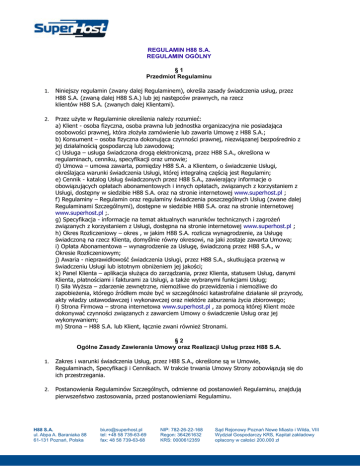 REGULAMIN H88 S.A. REGULAMIN OGÓLNY §1 Przedmiot Regulaminu 1. Niniejszy regulamin (zwany dalej Regulaminem), określa zasady świadczenia usług, przez H88 S.A. (zwaną dalej H88 S.A.) lub jej następców prawnych, na rzecz klientów H88 S.A. (zwanych dalej Klientami). 2. Przez użyte w Regulaminie określenia należy rozumieć: a) Klient - osoba fizyczna, osoba prawna lub jednostka organizacyjna nie posiadająca osobowości prawnej, która złożyła zamówienie lub zawarła Umowę z H88 S.A.; b) Konsument – osoba fizyczna dokonująca czynności prawnej, niezwiązanej bezpośrednio z jej działalnością gospodarczą lub zawodową; c) Usługa – usługa świadczona drogą elektroniczną, przez H88 S.A., określona w regulaminach, cenniku, specyfikacji oraz umowie; d) Umowa – umowa zawarta, pomiędzy H88 S.A. a Klientem, o świadczenie Usługi, określająca warunki świadczenia Usługi, której integralną częścią jest Regulamin; e) Cennik - katalog Usług świadczonych przez H88 S.A., zawierający informacje o obowiązujących opłatach abonamentowych i innych opłatach, związanych z korzystaniem z Usługi, dostępny w siedzibie H88 S.A. oraz na stronie internetowej www.superhost.pl ; f) Regulaminy – Regulamin oraz regulaminy świadczenia poszczególnych Usług (zwane dalej Regulaminami Szczególnymi), dostępne w siedzibie H88 S.A. oraz na stronie internetowej www.superhost.pl ;. g) Specyfikacja - informacje na temat aktualnych warunków technicznych i zagrożeń związanych z korzystaniem z Usługi, dostępna na stronie internetowej www.superhost.pl ; h) Okres Rozliczeniowy – okres , w jakim H88 S.A. rozlicza wynagrodzenie, za Usługę świadczoną na rzecz Klienta, domyślnie równy okresowi, na jaki zostaje zawarta Umowa; i) Opłata Abonamentowa – wynagrodzenie za Usługę, świadczoną przez H88 S.A., w Okresie Rozliczeniowym; j) Awaria - nieprawidłowość świadczenia Usługi, przez H88 S.A., skutkująca przerwą w świadczeniu Usługi lub istotnym obniżeniem jej jakości; k) Panel Klienta – aplikacja służąca do zarządzania, przez Klienta, statusem Usług, danymi Klienta, płatnościami i fakturami za Usługi, a także wybranymi funkcjami Usług; l) Siła Wyższa – zdarzenie zewnętrzne, niemożliwe do przewidzenia i niemożliwe do zapobieżenia, którego źródłem może być w szczególności katastrofalne działanie sił przyrody, akty władzy ustawodawczej i wykonawczej oraz niektóre zaburzenia życia zbiorowego; ł) Strona Firmowa – strona internetowa www.superhost.pl , za pomocą której Klient może dokonywać czynności związanych z zawarciem Umowy o świadczenie Usług oraz jej wykonywaniem; m) Strona – H88 S.A. lub Klient, łącznie zwani również Stronami. §2 Ogólne Zasady Zawierania Umowy oraz Realizacji Usług przez H88 S.A. 1. Zakres i warunki świadczenia Usług, przez H88 S.A., określone są w Umowie, Regulaminach, Specyfikacji i Cennikach. W trakcie trwania Umowy Strony zobowiązują się do ich przestrzegania. 2. Postanowienia Regulaminów Szczególnych, odmienne od postanowień Regulaminu, znajdują pierwszeństwo zastosowania, przed postanowieniami Regulaminu. H88 S.A. ul. Abpa A. Baraniaka 88 61-131 Poznań, Polska [email protected] tel: +48 58 739-63-69 fax: 48 58 739-63-68 NIP: 782-26-22-168 Regon: 364261632 KRS: 0000612359 Sąd Rejonowy Poznań Nowe Miasto i Wilda, VIII Wydział Gospodarczy KRS, Kapitał zakładowy opłacony w całości 200.000 zł 3. Postanowienia Umowy i Cenników, odmienne od postanowień Regulaminów, znajdują pierwszeństwo zastosowania, przed postanowieniami Regulaminów. 4. Złożenie zamówienia, przez Klienta, na świadczenie Usługi, następuje w wyniku wypełnienia elektronicznego formularza, dostępnego na Stronie Firmowej i wysłania go za pośrednictwem tej strony do H88 S.A.. 5. Po złożeniu zamówienia, przez Klienta, na świadczenie Usługi, w sposób wskazany w § 2 pkt. 4 Regulaminu, H88 S.A. przekazuje Klientowi, na wskazany przez niego adres e-mail, informację o wysokości Opłaty Abonamentowej, wybranym Okresie Rozliczeniowym, terminie płatności, numerze rachunku bankowego, na który ma być zrealizowana płatność oraz warunkach świadczenia Usługi. Dodatkowo Klientowi przesyłane są Regulaminy, ewentualnie Specyfikacja danej Usługi. 6. H88 S.A. może uzależnić zawarcie Umowy od przedstawienia, przez Klienta, dokumentów potwierdzających prawdziwość danych, podanych w związku z zawarciem Umowy, w szczególności odpisu z rejestru Ewidencji Działalności Gospodarczej, Krajowego Rejestru Sądowego, jak również potwierdzających nadany numer NIP oraz numer REGON. Jeśli Stroną Umowy jest Konsument H88 S.A., może uzależnić jej zawarcie od przedstawienia, przez Klienta będącego Konsumentem, skanu dowodu osobistego. 7. Umowa o świadczenie Usługi zostaje zawarta w dniu zaksięgowania, na koncie bankowym H88 S.A., Opłaty Abonamentowej za pierwszy Okres Rozliczeniowy, chyba że Umowa stanowi inaczej. Zapłata Opłaty Abonamentowej oznacza, że Klient zapoznał się z treścią Umowy, Regulaminów oraz Cennika i nie wnosi do nich uwag. 8. Umowa zostaje zawarta w formie pisemnej albo poprzez złożenie zamówienia w formie elektronicznej, zgodnie z §2 pkt. 4 Regulaminu. 9. W przypadku zawarcia Umowy obejmującej różne Usługi, Okresy Rozliczeniowe oraz terminy płatności dla poszczególnych Usług liczone są niezależnie. 10. H88 S.A. zobowiązuje się do stałego i nieprzerwanego świadczenia Usługi, w zakresie odpowiadającym, zakresowi zawartej z Klientem Umowy, o ile nie doszło do jej naruszenia, przez Klienta. 11. Klient może dokonać konfiguracji Usługi, w zakresie określonym w Specyfikacji lub Regulaminach, w szczególności w zakresie wprowadzenia zabezpieczeń, innych niż standardowe. H88 S.A. nie ponosi odpowiedzialności za zdarzenia spowodowane brakiem dodatkowych zabezpieczeń, jak również za oprogramowanie instalowane przez Klienta. 12. 