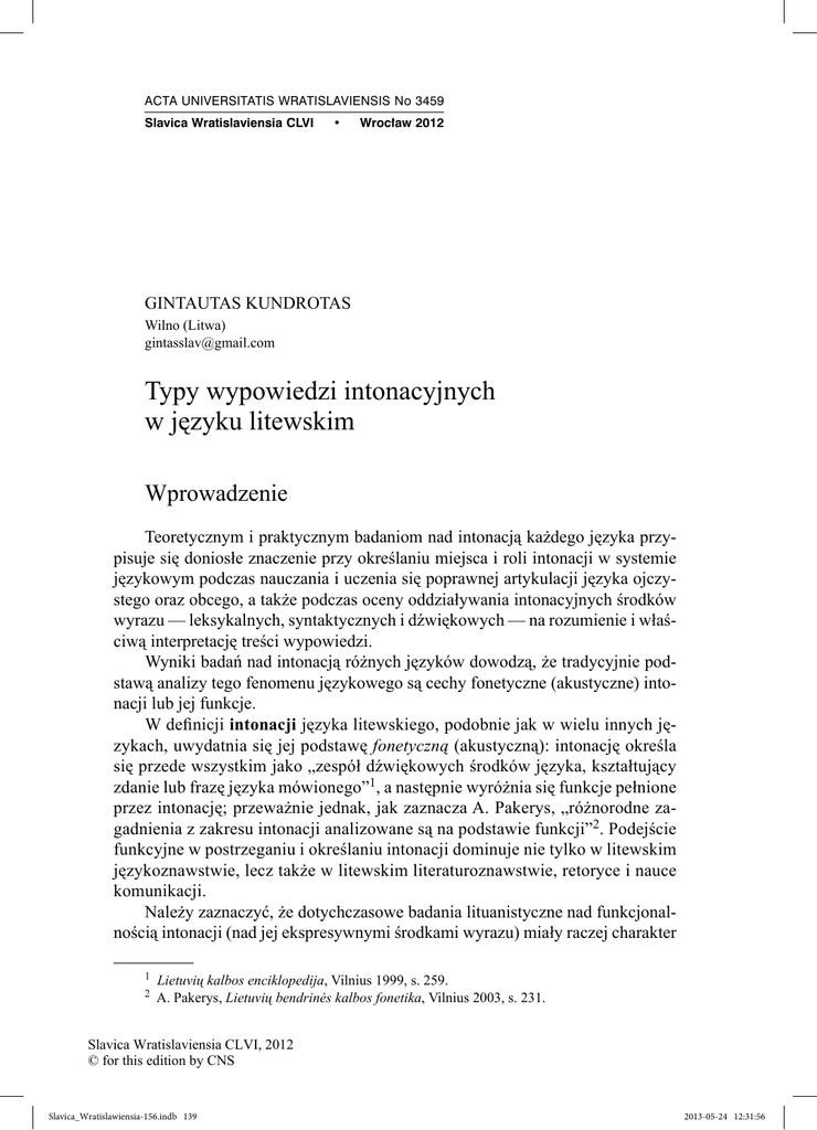 ACTA UNIVERSITATIS WRATISLAVIENSIS No 3459 Slavica Wratislaviensia CLVI • Wroc³aw 2012 GINTAUTAS KUNDROTAS Wilno (Litwa) [email protected] Typy wypowiedzi intonacyjnych w języku litewskim Wprowadzenie Teoretycznym i praktycznym badaniom nad intonacją każdego języka przypisuje się doniosłe znaczenie przy określaniu miejsca i roli intonacji w systemie językowym podczas nauczania i uczenia się poprawnej artykulacji języka ojczystego oraz obcego, a także podczas oceny oddziaływania intonacyjnych środków wyrazu — leksykalnych, syntaktycznych i dźwiękowych — na rozumienie i właściwą interpretację treści wypowiedzi. Wyniki badań nad intonacją różnych języków dowodzą, że tradycyjnie podstawą analizy tego fenomenu językowego są cechy fonetyczne (akustyczne) intonacji lub jej funkcje. W definicji intonacji języka litewskiego, podobnie jak w wielu innych językach, uwydatnia się jej podstawę fonetyczną (akustyczną): intonację określa się przede wszystkim jako „zespół dźwiękowych środków języka, kształtujący zdanie lub frazę języka mówionego”1, a następnie wyróżnia się funkcje pełnione przez intonację; przeważnie jednak, jak zaznacza A. Pakerys, „różnorodne zagadnienia z zakresu intonacji analizowane są na podstawie funkcji”2. Podejście funkcyjne w postrzeganiu i określaniu intonacji dominuje nie tylko w litewskim językoznawstwie, lecz także w litewskim literaturoznawstwie, retoryce i nauce komunikacji. Należy zaznaczyć, że dotychczasowe badania lituanistyczne nad funkcjonalnością intonacji (nad jej ekspresywnymi środkami wyrazu) miały raczej charakter 1 2 Lietuvių kalbos enciklopedija, Vilnius 1999, s. 259. A. Pakerys, Lietuvių bendrinės kalbos fonetika, Vilnius 2003, s. 231. Slavica Wratislaviensia CLVI, 2012 © for this edition by CNS Slavica_Wratislawiensia-156.indb 139 2013-05-24 12:31:56 140 • Gintautas Kundrotas epizodyczny, zostały wyróżnione tylko podstawowe funkcje syntaktyczne3 pełnione przez intonację w tekstach pisanych; niektóre inne nazwane funkcje (emotywna, apelatywna, fonostylistyczna) dotąd pozostały niezbadane, przy tym analizowane funkcje również zbyt ogólnikowo łączono z ekspresyjnymi środkami wyrazu. W związku z tym sytuacja w zakresie analizy funkcjonalności intonacji języka litewskiego (w porównaniu z innymi językami) nie jest zadowalająca i wymaga dalszych badań. To decyduje o aktualności i nowatorstwie niniejszego artykułu. Z badań nad współczesną intonologią wynika, że w analizie intonacji należy stosować podejście systemowe zamiast koncentrowania uwagi na poszczególnych składnikach tego zjawiska, kiedy to badaniom poddawane są tylko funkcje intonacji lub tylko jej cechy fonetyczne. Znaczenie zdania (wyrażenia) jest wynikiem współdziałania wszystkich środków językowych — jego podstawy leksykalno-gramatycznej, intonacji i kontekstu. W każdym konkretnym przypadku znaczenie tych środków językowych jest różne, mogą one „zastępować”, znaczyć „więcej” lub „mniej”, „mocniej” lub „słabiej” — zasady substytucji zostały sformułowane i zbadane w rosyjskiej intonologii4. Właściwości te nie łączą się z charakterystyką intonacyjną cech fonetycznych. Systemowości intonacji nie należy utożsamiać wyłącznie z systemem lub podsystemem jednostek intonacyjnych5 (konturów intonacyjnych). Określone 3 Pierwsze wzmianki o intonacji w języku litewskim pochodzą z początku XX wieku, znajdujemy je w pracach J. Jablonskisa (J. Jablonskis, Rygiškių Jono lietuvių kalbos sintaksė, S-P 1911) i M. Durysa (M. Durys, Lietuvių kalbos sintaksė, Kaunas 1927). Intonacja opisywana jest tam w aspekcie funkcjonalnym, syntaktycznym; fonetyczne jej cechy zostały określone krótko i zwięźle — tylko jako zmiana dźwięku (tonu). Taki sam (funkcjonalny) pogląd na dane zjawisko językowe panował w późniejszych latach. W gramatyce akademickiej Lietuvių kalbos gramatika (1976) i Dabartinės lietuvių kalbos gramatika (1994) intonację definiuje się jako środek pomocniczy służący do wyrażania stosunków syntaktycznych w różnych typach zdań: zdaniach pojedynczych i bezspójnikowych, w których o znaczeniu zdania decyduje intonacja. Dla tego typu zdań „charakterystyczne są cztery rodzaje intonacji: wyszczególniająca, porównawcza, warunkująca, wspomagająca”. Akustyczno-fonetyczna struktura typów intonacyjnych nie została przedstawiona przez badaczy składni, mowa jest tylko o „swoistej”, „specyficznej”, „pytającej” bądź „wykrzyknikowej” intonacji zdań modalnych. Bodajże najwięcej uwagi zagadnieniom związanym z intonacją poświęcił J. Balkevičius: w podręczniku jego autorstwa Dabartinės lietuvių kalbos sintaksė (Vilnius, 1963) znajdujemy cenne informacje o charakterze systemowym. Autor uogólnia podstawowe akustyczne elementy intonacji, ukazuje współdziałanie najważniejszych z nich — tonu, przebiegu, intensywności — w różnych typach zdań, podaje też inne, jego zdaniam, cechy (czy środki) należące do intonacji — rozczłonkowanie syntagmy, akcent logiczny i pauzy. 4 Т.М. Николаева, „Принцип замены” А.М. Пешковского и отдельные компоненты интонации, [w:] Вопросы фонетики и обучение произношению, Москва 1975, s. 145–166. 5 W językoznawstwie litewskim (podobnie jak w terminologii z zakresu intonologii stosowanej w większości języków) brakuje dokładnej koncepcji jednostki intonacyjnej, a więc i jej nazwy; przeważnie używa się takich określeń, jak „fonem tonu”, „tonem”, „melodem”, „kontur intonacyjny”, „figura intonacyjna” w zależności od tego, czy badacz podkreśla ważność tonu (melodii) jako Slavica Wratislaviensia CLVI, 2012 © for this edition by CNS Slavica_Wratislawiensia-156.indb 140 2013-05-24 12:31:56 