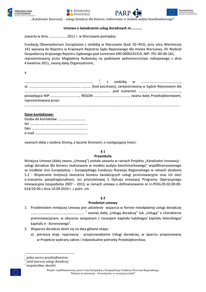 „Katalizator Innowacji – usługi doradcze dla biznesu, realizowane w modelu audytu benchmarkowego” Umowa o świadczenie usług doradczych nr........... zawarta w dniu …………………2011 r. w Warszawie pomiędzy: Fundacją Obserwatorium Zarządzania z siedzibą w Warszawie (kod: 02–952), przy ulicy Wiertniczej 141 wpisaną do Rejestru w Krajowym Rejestrze Sądu Rejonowego dla miasta Warszawy, XII Wydział Gospodarczy Krajowego Rejestru Sądowego pod numerem KRS 0000235319, NIP: 701-00-00-181, reprezentowaną przez Magdalenę Rudowską na podstawie pełnomocnictwa rodzajowego z dnia 4 kwietnia 2011, zwaną dalej Organizatorem, a 1 …………………………………………………………………… , z siedzibą w ………………………………………, ul. …………………………………………………, ……….. (kod pocztowy), zarejestrowaną w Sądzie Rejonowym dla …………………………………………………………………………………….. pod numerem …………………………………………, posiadająca NIP ……………………………, REGON …………………………………., zwana dalej Przedsiębiorstwem, reprezentowana przez: ……………………………………………………………………………………………………………………………………………………………. Dane kontaktowe: Osoba do kontaktów: …………………………. tel. ……………………………………………………….. faks ………………………………………………………. e-mail …………………………………………………… zwanych dalej z osobna Stroną, a łącznie Stronami, o następującej treści: §1 Preambuła Niniejsza Umowa (dalej zwana „Umową”) została zawarta w ramach Projektu „Katalizator Innowacji usługi doradcze dla biznesu realizowane w modelu audytu benchmarkowego” współfinansowanego ze środków Unii Europejskiej – Europejskiego Funduszu Rozwoju Regionalnego w ramach działania 5.2 - Wspieranie instytucji otoczenia biznesu świadczących usługi proinnowacyjne oraz ich sieci o znaczeniu ponadregionalnym, osi priorytetowej 5 Dyfuzja innowacji Programu Operacyjnego Innowacyjna Gospodarka 2007 – 2013, w ramach umowy o dofinansowanie nr U-POIG.05.02.00-00014/10-00 z dnia 10.09.2010 r. z późn. zm. §2 Przedmiot umowy 1. Przedmiotem niniejszej Umowy jest udzielenie wsparcia w formie nieodpłatnej usługi doradczej ……………………………………………………. 2 zwanej dalej „Usługą doradczą” lub „Usługą” o charakterze proinnowacyjnym, w obszarze związanym z rozwojem kapitału ludzkiego/ kapitału klienckiego/ kapitału e - biznesowego3. 2. Wsparcie doradcze dzieli się na dwa główne etapy: a) pierwszy etap: naprawczy - przeprowadzenie Usługi doradczej, w oparciu proponowany w Projekcie wybrany zakres i indywidualne potrzeby Przedsiębiorstwa; 1 pełna nazwa przedsiębiorstwa tytuł (nazwa) usługi doradczej 3 niepotrzebne skreślić 2 Projekt współfinansowany przez Unię Europejską z Europejskiego Funduszu Rozwoju Regionalnego "Dotacje na innowacje - Inwestujemy w waszą przyszłość” „Katalizator Innowacji – usługi doradcze dla biznesu, realizowane w modelu audytu benchmarkowego” b) drugi etap: weryfikujący – diagnoza firmy po upływie do ok. 1 roku od przeprowadzenia pierwszego etapu Projektu. 3. W ramach udziału w Programie Przedsiębiorca zleca, a Organizator zobowiązuje się do realizacji Projektu, zgodnie z Programem Usługi doradczej, według poniższych założeo: …………………………………………………………………………………………………………………………………………………………… …………………………………………………………………………………………………………………………………………………………… ……………………………………………………………………………………………………………………………………………………………. 4. W ramach udziału w Programie Przedsiębiorca zobowiązuje się do przekazania materiałów i narzędzi niezbędnych do poprawnej realizacji Usługi oraz aktywnego udziału w Projekcie, zgodnie z Programem Usługi doradczej, o której mowa w § 2 pkt.1. 5. Usługi w ramach Projektu są świadczone na rzecz przedsiębiorców nieodpłatnie. Wartośd realizacji Usługi stanowi pomoc de minimis, która jest udzielana zgodnie z warunkami określonymi w rozporządzeniu Komisji (WE) Nr 1998/2006 z dnia 15 grudnia 2006 roku w sprawie stosowania art. 87 i 88 Traktatu do pomocy de minimis (Dz. Urz. UE L 379 z 28.12.2006, str. 5). 6. Przedsiębiorstwo otrzymuje wsparcie doradcze na zasadach i warunkach określonych w niniejszej Umowie oraz Regulaminie Projektu, stanowiącym załącznik do niniejszej Umowy. §3 Czas trwania i rozwiązanie Umowy 1. Wsparcie doradcze udzielane jest w okresie realizacji Usługi, tj. od dnia …………………………2011 r. do dnia 30.06.2013 r. 2. Umowa zostaje zawarta na okres świadczenia Usługi doradczej, będącej przedmiotem niniejszej Umowy. §4 Wartośd udzielanego wsparcia doradczego 1. Całkowita wartośd usługi doradczej, …………………………………….4 zgodnie z katalogiem usług wynosi …………. zł brutto. 2. Usługi w ramach Projektu „Katalizator Innowacji…” są świadczone na rzecz Przedsiębiorstwa nieodpłatnie. Wartośd realizacji usług stanowi pomoc de minimis, która jest udzielana zgodnie z warunkami określonymi w rozporządzeniu Komisji (WE) Nr 1998/2006 z dnia 15 grudnia 2006 roku w sprawie stosowania art. 87 i 88 Traktatu do pomocy de minimis (Dz. Urz. UE L 379 z 28.12.2006, str. 5). §5 Obowiązki Organizatora Organizator zobowiązuje się do: 1. Przygotowania i realizacji Usługi doradczej zg