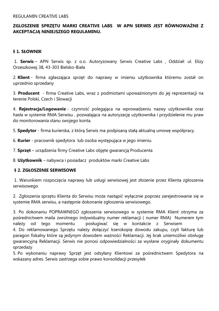 REGULAMIN CREATIVE LABS ZGLOSZENIE SPRZĘTU MARKI CREATIVE LABS AKCEPTACJĄ NINIEJSZEGO REGULAMINU. W APN SERWIS JEST RÓWNOWAŻNE Z § 1. SŁOWNIK 1. Serwis – APN Serwis sp. z o.o. Autoryzowany Serwis Creative Labs , Oddział: ul. Elizy Orzeszkowej 38, 43-303 Bielsko-Biała 2. Klient - firma zgłaszająca sprzęt do naprawy w imieniu użytkownika któremu został on uprzednio sprzedany 3. Producent - firma Creative Labs, wraz z podmiotami upoważnionymi do jej reprezentacji na terenie Polski, Czech i Słowacji 4. Rejestracja/Logowanie - czynność polegająca na wprowadzeniu nazwy użytkownika oraz hasła w systemie RMA Serwisu , pozwalająca na autoryzację użytkownika i przydzielenie mu praw do monitorowania stanu swojego konta. 5. Spedytor - firma kurierska, z którą Serwis ma podpisaną stałą aktualną umowę współpracy. 6. Kurier - pracownik spedytora lub osoba występująca w jego imieniu. 7. Sprzęt – urządzenia firmy Creative Labs objęte gwarancją Producenta 8. Użytkownik – nabywca i posiadacz produktów marki Creative Labs § 2. ZGŁOSZENIE SERWISOWE 1. Warunkiem rozpoczęcia naprawy lub usługi serwisowej jest złożenie przez Klienta zgłoszenia serwisowego 2. Zgłoszenia sprzętu Klienta do Serwisu może nastąpić wyłącznie poprzez zarejestrowanie się w systemie RMA serwisu, a następnie dokonanie zgłoszenia serwisowego. 3. Po dokonaniu POPRAWNEGO zgłoszenia serwisowego w systemie RMA Klient otrzyma za pośrednictwem maila zwrotnego indywidualny numer reklamacji ( numer RMA) Numerem tym należy od tego momentu posługiwać się w kontakcie z Serwisem 4. Do reklamowanego Sprzętu należy dołączyć kserokopię dowodu zakupu, czyli fakturę lub paragon fiskalny które są jedynym dowodem ważności Reklamacji. Jej brak uniemożliwi obsługę gwarancyjną Reklamacji. Serwis nie ponosi odpowiedzialności za wysłane oryginały dokumentu sprzedaży 5. Po wykonaniu naprawy Sprzęt jest odsyłany Klientowi za pośrednictwem Spedytora na wskazany adres. Serwis zastrzega sobie prawo konsolidacji przesyłek § 3. WYSYŁKA SPRZĘTU DO SERWISU 1 Wysyłany Sprzęt musi zostać prawidłowo zabezpieczony i spakowany przed wysyłką. W przeciwnym przypadku istnieje ryzyko uszkodzenia sprzętu w czasie transportu lub odmowy Kuriera do odbioru przesyłki. Przesyłka musi zostać oznaczona nadanym numerem RMA w widocznym miejscu na przesyłce. 2. Sprzęt przez Spedytora odbierany jest tylko i wyłącznie od Klientów 3. W ramach konsolidacji przesyłek i usprawnienia współpracy z Klientami wprowadzamy system konsolidacji przesyłek. Odbiór sprzętu od danego Klienta będzie miał miejsce 1 raz w tygodniu . O harmonogramie odbiorów poinformujemy Klienta osobnym dokumentem 2. W przypadku otrzymania przez Serwis przesyłki niewłaściwie zabezpieczonej lub niemożliwej do odesłania ze względu na możliwość uszkodzenia sprzętu, Serwis doliczy koszty nowego opakowania w wysokości 20zł brutto, które poniesie Klient/Użytkownik 4. Wszystkie przesyłki wysyłane za pośrednictwem Spedytora są ubezpieczone do kwoty 5000 zł. 5. Spedytorami serwisu są firmy UPS oraz Siódemka. Na postawie numeru listu przewozowego Klient może indywidualnie śledzić przesyłkę poprzez zalogowanie sie na stronie internetowej UPS : www.ups.com, lub Siódemka www.siodemka.com 6. Dokumentem potwierdzającym przyjęcia sprzętu do Serwisu jest list przewozowy Spedytora 7. Nie wydanie przez Klienta przesyłki kurierowi pomimo informacji o umówieniu odbioru skutkować będzie obciążeniem Klienta kosztami każdej kolejnej próby odbioru §4. Gwarancja Producenta 1.Gwarancją nie są objęte: uszkodzenia mechaniczne, chemiczne, termiczne lub celowe uszkodzenia sprzętu i wywołane nimi wady, uszkodzenia i wady wynikłe na skutek niewłaściwego lub niezgodnego z instrukcją użytkowania, przechowywania transportu czy konserwacji sprzętu, a także stosowanie sprzętu niezgodnie z przepisami bezpieczeństwa, uszkodzenia i wady wynikłe na skutek niewłaściwej lub niezgodnej z instrukcją instalacji, napraw, przeróbek, dostrojeń lub zmian konstrukcyjnych dokonywanych przez Użytkownika, sprzęt, który nie został dostarczony do serwisu w oryginalnym lub bezpiecznym opakowaniu (karton, formy styropianowe, folie, pudełka zabezpieczone gąbką lub styropianem itp.), oraz wywołane tym uszkodzenia, sprzęt, którego dokument zakupu, lub numery seryjne w jakikolwiek sposób zmieniono, zamazano lub zatarto, a także plomby są uszkodzone lub nieczytelne (zmienione, zatarte, zamazane), sprzęt, do którego Użytkownik zagubił dokument zakupu, który jest jedynym dokumentem umożliwiającym reklamowanie sprzętu. 2. Zgłoszona wada podlega weryfikacji przez Serwis, który stwierdzi czy usterka nie nastąpiła z winy Użytkownika 3. W przypadku, gdy w toku analizy zasadności reklamacji i oględzin wadliwego towaru lub jego części, Serwis stwierdzi, iż naruszono warunki udzielonej gwarancji, w szczególności Sprzęt lub jego części zostały zmodyfikowane w zakresie właściwości fizycznych lub prawnych, Serwis poinformuje o tym Klienta, zwracając Klientowi wadliwy sprzęt na jego koszt poprzez odesłanie za pobraniem w kwocie 30 PLN 4. Producent oraz Autoryzowany Serwis nie mają obowiązku dostarczenia Użytkownikowi zastępczego Sprzętu na czas trwania procedury reklamacyjnej § 5. CZAS TRWANIA NAPRAWY 1. Czas trwania naprawy jest uwarunkowany dostępnością części i/lub komponentów. Maksymalny czas naprawy powinien wynosić 30 dni roboczych. Jeżeli po tym terminie Serwis nie będzie w stanie dokonać naprawy lub wykonać usługi Klient oraz Producent zostaną o tym poinformowani 2. O terminie zakończenia naprawy, zmianie statusu zlecenia, Klient zostanie niezwłocznie poinformowany poprzez zmianę statusu w systemie RMA 3. Klient ma możliwość śledzenia statusu naprawy w systemie RMA serwisu. Opcja ta jest dostępna po zalogowaniu się do powyższego systemu. http://creat