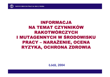 INFORMACJA NA TEMAT CZYNNIKÓW RAKOTWÓRCZYCH I MUTAGENNYCH W ŚRODOWISKU PRACY – NARAŻENIE, OCENA RYZYKA, OCHRONA ZDROWIA Łódź, 2004 Pierwszy akt prawny w Polsce, który określił wykaz czynników rakotwórczych wraz ze sposobem rejestracji narażenia pracowników na te czynniki oraz warunkami sprawowania nadzoru nad stanem zdrowia osób narażonych na nie zawodowo, to rozporządzenie Ministra Zdrowia i Opieki Społecznej z dnia 11 września 1996 roku w sprawie czynników rakotwórczych w środowisku pracy oraz nadzoru nad stanem zdrowia pracowników zawodowo narażonych na te czynniki. Rozporządzenie przestało obowiązywać w momencie wejścia Polski do Unii Europejskiej W świetle przepisów tego rozporządzenia pracodawca zatrudniający pracowników w warunkach narażenia na kancerogeny był zobowiązany do podejmowania szeregu działań profilaktycznych oraz do prowadzenia rejestru czynników rakotwórczych. Opracowano projekt kolejnego rozporządzenia Ministra Zdrowia w sprawie substancji, preparatów, czynników lub procesów technologicznych o działaniu rakotwórczym lub mutagennym w środowisku pracy implementującego do prawa polskiego przepisy obowiązujące w Unii Europejskiej. • 90/394/EWG (ze zmianą 99/38/WE) Projekt jest zgodny z postanowieniami dyrektyw: • 2004/37/WE • 83/477/EWG • 2000/54/WE • oraz z przepisami Europejskiej Wspólnoty Energii Atomowej PROJEKT ROZPORZĄDZENIA OKREŚLA: wykaz substancji, preparatów, czynników lub procesów technologicznych o działaniu rakotwórczym lub mutagennym i sposób ich rejestrowania sposób prowadzenia rejestru prac, których wykonywanie powoduje konieczność pozostawania w kontakcie z substancjami, preparatami, czynnikami lub procesami technologicznymi o działaniu rakotwórczym lub mutagennym szczegółowe warunki ochrony pracowników przed zagrożeniami spowodowanymi przez substancje, preparaty, czynniki lub procesy technologiczne o działaniu rakotwórczym lub mutagennym sposób prowadzenia rejestru pracowników zatrudnionych przy tych pracach wzory dokumentów dotyczących narażenia pracowników na substancje, preparaty, czynniki lub procesy technologiczne o działaniu rakotwórczym lub mutagennym oraz sposób przechowywania i przekazywania tych dokumentów do podmiotów właściwych do rozpoznawania lub stwierdzania chorób zawodowych warunki i sposób monitorowania stanu zdrowia pracowników narażonych na działanie substancji, preparatów, czynników lub procesów technologicznych o działaniu rakotwórczym lub mutagennym Wykaz substancji, preparatów, czynników lub procesów technologicznych o działaniu rakotwórczym lub mutagennym Rozszerzenie zakresu regulacji o czynniki mutagenne wynika z postanowień dyrektywy 99/38/WE zmieniającej po raz drugi dyrektywę 90/394/EWG w sprawie ochrony pracowników przed zagrożeniem dotyczącym narażenia na działanie czynników rakotwórczych podczas pracy. Dyrektywa zaleca stosowanie jednakowych zabezpieczeń przed narażeniem zarówno na chemiczne czynniki rakotwórcze, jak i mutagenne. W porównaniu z wykazem czynników rakotwórczych z 1996 roku, wykaz czynników rakotwórczych lub mutagennych w środowisku pracy jest znacznie obszerniejszy. Szczególnie istotne zmiany zostały wprowadzone w części dotyczącej substancji i preparatów chemicznych. Wykaz z 1996 roku obejmował 100 substancji chemicznych, mieszanin i procesów technologicznych uznanych za rakotwórcze, podczas gdy obecnie w wykazie substancji rakotwórczych lub mutagennych jest 819 pozycji (w tym 663 pozycji stanowią złożone substancje ropo- i węglopochodne). Zdefiniowano dokładnie stężenia graniczne substancji rakotwórczych w preparatach chemicznych, powyżej których preparaty te uznaje się odpowiednio za rakotwórcze lub mutagenne. Klasyfikacja w wykazie jest zgodna z klasyfikacją substancji i preparatów chemicznych obowiązującą w Unii Europejskiej na mocy dyrektyw 67/548/EWG oraz 99/45/WE wraz z ich późniejszymi zmianami i dostosowaniami do postępu technicznego (do 28 ATP włącznie), a rygorami rozporządzenia objęto wszystkie substancje i preparaty chemiczne zaklasyfikowane jako rakotwórcze kategorii 1 albo 2 lub mutagenne kategorii 1 albo 2 wg kryteriów zawartych w ww. dyrektywach. Do kategorii 1 klasyfikuje się substancje o udowodnionym, na podstawie danych epidemiologicznych, działaniu rakotwórczym lub mutagennym u człowieka (z braku wystarczających dowodów dotychczas żadna substancja nie została zaklasyfikowana jako mutagenna kategorii 1). Do kategorii 2 zaliczono substancje, które rozpatruje się jako rakotwórcze/mutagenne dla człowieka, przede wszystkim ze względu na dostępne wyniki badań na zwierzętach. Uregulowania prawne dot. klasyfikacji i wykazu zawarte w tych dyrektywach są już implementowane do polskiego prawa ustawą z dnia 11 stycznia 2001 roku o substancjach i preparatach chemicznych wraz z przepisami wykonawczymi do tej ustawy. Fragment wykazu preparatów o działaniu rakotwórczym lub mutagennym Noty dotyczace klasyfikacji substancji jako rakotwórczej Stezenie graniczne (%) substancji w preparacie Numer WE Numer CAS Kategoria rakotwórczosci / mutagennosci - - Rakotw. Kat. 1 0,1 Lp. Numer indeksowy 40 033-005-00-1 kwas arsenowy(V) i jego sole 42 048-002-00-0 tlenek kadmu(II) 215-146-2 1306-19-0 Rakotw. Kat. 2 0,1 43 048-006-00-2 fluorek kadmu(II) 232-222-0 7790-79-6 Rakotw. Kat. 2 Muta. Kat. 2 0,01/0,19) 44 048-008-00-3 chlorek kadmu(II) 233-296-7 10108-64-2 Rakotw. Kat. 2 Muta. Kat. 2 0,01/0,19) 45 048-009-00-9 siarczan(VI) kadmu(II) 233-331-6 10124-36-4 Rakotw. Kat. 2 0,1 48 601-013-00-X buta-1,3-dien 203-450-8 106-99-0 Rakotw. Kat. 1 Muta. Kat. 2 0,1 49 601-020-00-8 benzen 200-753-7 71-43-2 Rakotw. Kat. 1 0,1 50 601-032-00-3 benzo[a]piren; benzo[d,e,f]chryzen 200-028-5 50-32-8 Rakotw. Kat. 2 Muta. Kat. 2 0,1 154 648-001-00-0 Destylaty (smola weglowa), frakcja benzolowa; Olej lekki 283-482-7 84650-02-2 Rakotw. Kat. 2 0,1 