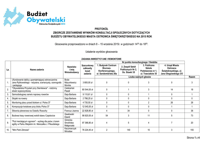 PROTOKÓŁ ZBIORCZE ZESTAWIENIE WYNIKÓW KONSULTACJI SPOŁECZNYCH DOTYCZĄCYCH BUDŻETU OBYWATELSKIEGO MIASTA OSTROWCA ŚWIĘTOKRZYSKIEGO NA 2015 ROK Głosowanie przeprowadzono w dniach 8 – 15 września 2015r. w godzinach 1400 do 1800. Ustalenie wyników głosowania ZADANIA INWESTYCYJNE I REMONTOWE Lp. Nazwa zadania Nazwisko i imię Wnioskodawcy 3. Ufundowanie tablicy upamiętniającej ostrowczanina Jana Rybkowskiego - reżysera, scenarzysty, scenografa i pedagoga "Obywatelska Przystań przy Sienkiewce" - rodzinny skwer wypoczynkowy Samoobsługowy serwis naprawy rowerów BryłaMazurkiewicz Monika Celebański Paweł Deja Barbara 4. Stojaki na rowery 5. 1. Szacunkowy całkowity koszt zadania 1. Budynek Centrum BiurowoKonferencyjnego, ul. Sandomierska 26a Nr punktu konsultacyjnego / Siedziba 3. Publiczna 2. Zespół Szkół Szkoła Publicznych Nr 2, Podstawowa nr 1, Os. Stawki 35 ul. Trzeciaków 35 Liczba ważnych głosów 4. Urząd Miasta Ostrowca Świętokrzyskiego, ul. Jana Głogowskiego 3/5 Razem 3 800,00 zł 0 0 3 0 3 80 544,00 zł 0 1 3 14 18 9 110,61 zł 0 0 1 0 1 Deja Barbara 2 798,25 zł 0 0 0 0 0 Monitoring placu przed blokiem ul. Polna 37 Deja Barbara 4 735,50 zł 0 0 2 26 28 6. Kompozycje kwiatowe przy bloku Polna 37 Deja Barbara 12 045,00 zł 0 0 0 1 1 7. Siłownia plenerowa na Osiedlu Rosochy 22 828,80 zł 4 34 0 0 38 8. Budowa trasy rowerowej wokół stawu Częstocice 98 820,00 zł 54 3 11 5 73 9. "Pod merdającym ogonem" - wybieg dla psów z torem agility w Parku Miejskim im. Marszałka J. Piłsudskiego 97 366,80 zł 4 5 4 7 20 10. "Mini Park Zdrowia" Francuz Joanna Gawłowski Dawid GóreckaSmolińska Małgorzata Kaczmarczyk Mirosław 76 224,40 zł 2 140 10 3 155 2. Strona 1 z 4 11. Modernizacja placu zabaw przy ul. Niskiej w Ostrowcu Św. Kałuża Mariusz 50 758,00 zł 330 13 19 18 380 12. Klub Młodzieżowy/Miejsce spotkań dla młodzieży z Gminy Ostrowiec Świętokrzyski KargulewiczMrozińska Karolina 22 000,00 zł 10 6 10 12 38 13. Remont i wyposażenie sali treningowej sekcji break dance MCK w budynku kina Etiuda Aleja 3 Maja 6 Krzystek Adrian 12 945,50 zł 2 6 7 5 20 Kurant Mariola 78 500,00 zł 2 3 6 136 147 Kwiatkowski Zbigniew 6 400,00 zł 0 1 0 0 1 Lipka Elżbieta 100 000,00 zł 9 57 12 3 81 Łata Mariusz 98 594,34 zł 0 2 17 1 20 Maj Wiesława 49 707,38 zł 5 56 0 9 70 Ozimkiewicz Paweł 35 376,00 zł 3 10 30 9 52 Paluch Jolanta 52 600,00 zł 0 0 0 9 9 Pałka Andrzej 19 900,00 zł 0 1 25 0 26 14. 15. 16. Ogród wypoczynkowy dla mieszkańców Osiedla "Kamienna" Doprowadzenie wody pitnej do Ogrodu Działkowego "KAKTUS" ul. Mostowa b/n w Ostrowcu Świętokrzyskim Boisko sportowe, wielofunkcyjne dla Osiedla Koszary 21. Budowa boiska wielofunkcyjnego na terenie Parku Jordanowskiego przy ul. Kopernika Budowa otwartej siłowni zewnętrznej dla mieszkańców Dzielnicy Denków przy placu zabaw w rejonie ulic Zielonej i Samsonowicza Budowa zaplecza socjalno-sanitarnego kortów tenisowych przy Publicznym Gimnazjum nr 1 Miejsce rekreacji na Osiedlu Śródmieście przy ul. Siennieńskiej 20 Siłownie zewnętrzne na placach zabaw 22. Psie stacje - kupa psów Pichór Elżbieta 100 000,00 zł 2 0 0 3 5 23. Budowa siłowni zewnętrznej za budynkiem LO nr III im. Wł. Broniewskiego w Ostrowcu Świętokrzyskim Pisula Agata 40 400,00 zł 3 1 12 1 17 24. Remont ul. Siennieńskiej na terenie osiedla Słoneczne w Ostrowcu Świętokrzyskim Pomorski Jerzy 92 914,20 zł 0 1 0 14 15 Pytlak Wiktor 5 601,42 zł 1 6 0 2 9 Pytlak Wiktor 7 700,00 zł 2 2 0 1 5 Pytlak Wiktor 27 015,18 zł 0 0 0 0 0 Pytlak Wiktor 24 443,90 zł 0 0 0 0 0 Pytlak Wiktor Sękiewicz Andrzej 7 833,01 zł 0 10 0 0 10 26 735,28 zł 0 9 0 0 9 17. 18. 19. 20. 25. 26. 27. 28. 29. 30. Kolorowe pasy drogowe zwiększające bezpieczeństwo na drogach często uczęszczanych przez dzieci Innowacyjne stojaki na rowery zachęcające mieszkańców miasta do częstszego korzystania z transportu rowerowego Wielofunkcyjna ścieżka spacerowa (łącząca tereny mieszkalne Os. Stawki z ul. Samsonowicza) Street workout park - kompleks urządzeń służących do ćwiczeń na świeżym powietrzu Rozbudowa parkingu na Osiedlu Stawki Remont chodnika wzdłuż ogrodzenia PSP nr 5 od strony wschodniej w Os. Ogrody Strona 2 z 4 31. Fontanna oraz siłownia z urządzeniami fitness Skocka Danuta 100 000,00 zł 41 0 0 1 42 32. Szalet Miejski Ostrowiec Św. Rynek 100 000,00 zł 0 1 2 51 54 33. Plac zabaw dla każdego Sołtys Józef Stec Włodzimierz 99 996,23 zł 1 2 198 4 205 Stelmasik Kamil 90 430,83 zł 2 0 77 5 84 99 978,21 zł 0 316 16 4 336 24 132,68 zł 0 0 1 0 1 14 262,50 zł 0 0 0 0 0 13 400,00 zł 0 15 0 3 18 Wasik Hanna 32 686,42 zł 0 17 0 0 17 Wójcik Bogumiła 30 060,00 zł 3 6 44 4 57 34. 35. 36. Pułankowy plac zabaw. Utworzenie strefy edukacyjnowypoczynkowej dla najmłodszych mieszkańców osiedla Pułanki na terenie PSP nr 7 Droga dojazdowa do ZSP Nr 2 na osiedlu Stawki w Ostrowcu Świętokrzyskim Street workout park - kompleks urządzeń służących do ćwiczeń na świeżym powietrzu 37. Renowacja śmietników na Os. Kuźnia 38. Budowa chodnika wzdłuż ogrodzenia Przedszkola nr 15 Remont chodnika wzdłuż drogi od bloku 30 do pawilonu 33A w Os. Ogrody "Siłownia pod chmurką" zlokalizowana na terenie ośrodka Gutwin 39. 40. Szczepanek Hanna Szymoniak Maciej Szymoniak Maciej Uba Urszula 41. Urząd Bez Barier - dostosowanie obiektu do potrzeb osób starszych, niewidomych i niedowidzących Wójcik Dorota 55 100,00 zł 0 0 0 1 1 42. Łamanie barier w dostępie do informacji - wyposażenie Urzędu Miasta w stanowisko komputerowe dla petenta niepełnosprawnego Wójcik Dorota 35 070,00 zł 0 0 0 1 1 Ogółem 480 724 510 353 2067 Strona 3 z 4 ZADANIA Z ZAKRESU KULTURY Lp. Nazwa zadania 1. "Kultura dla dzieci" - 25 Lecie PRL i Sienkiewiczowskie Dzień Seniora w Ostrowcu Świętokrzyskim (Dzień Seniora w Ostrowcu Świętokrzyskim - Koncert dla Seniora, Aktywny Senior – 25 Lecia PRL i Sienkiewiczowskiego, „RAZEM ŁATWIEJ” – 25 le
