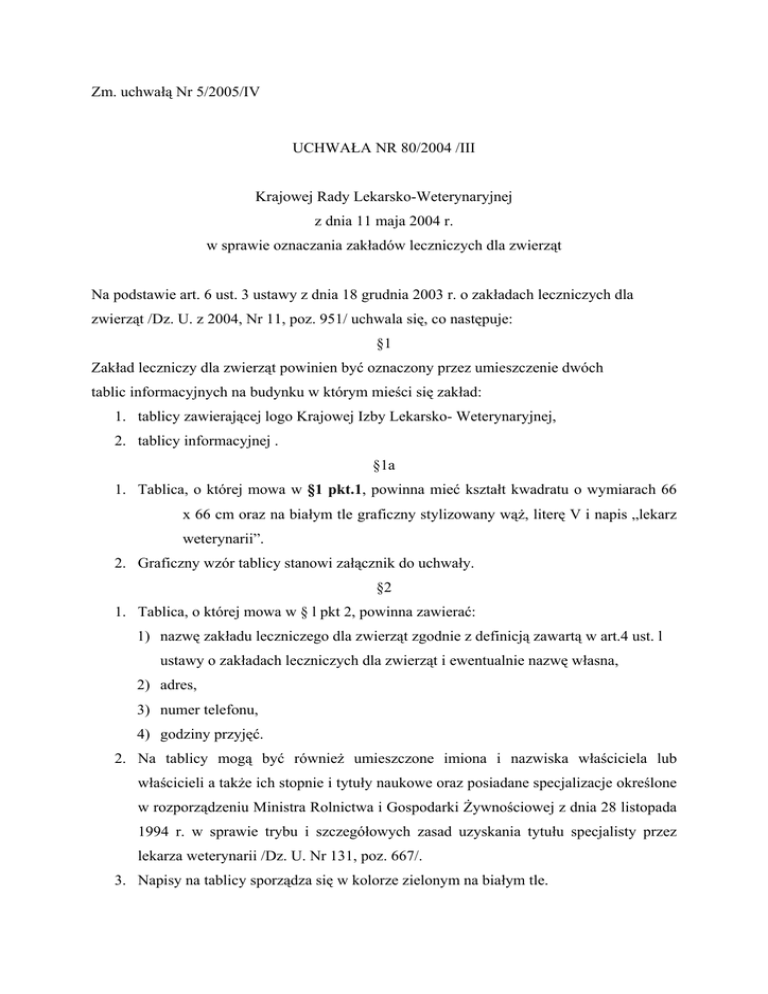 Zm. uchwałą Nr 5/2005/IV UCHWAŁA NR 80/2004 /III Krajowej Rady Lekarsko-Weterynaryjnej z dnia 11 maja 2004 r. w sprawie oznaczania zakładów leczniczych dla zwierząt Na podstawie art. 6 ust. 3 ustawy z dnia 18 grudnia 2003 r. o zakładach leczniczych dla zwierząt /Dz. U. z 2004, Nr 11, poz. 951/ uchwala się, co następuje: §1 Zakład leczniczy dla zwierząt powinien być oznaczony przez umieszczenie dwóch tablic informacyjnych na budynku w którym mieści się zakład: 1. tablicy zawierającej logo Krajowej Izby Lekarsko- Weterynaryjnej, 2. tablicy informacyjnej . §1a 1. Tablica, o której mowa w §1 pkt.1, powinna mieć kształt kwadratu o wymiarach 66 x 66 cm oraz na białym tle graficzny stylizowany wąż, literę V i napis „lekarz weterynarii”. 2. Graficzny wzór tablicy stanowi załącznik do uchwały. §2 1. Tablica, o której mowa w § l pkt 2, powinna zawierać: 1) nazwę zakładu leczniczego dla zwierząt zgodnie z definicją zawartą w art.4 ust. l ustawy o zakładach leczniczych dla zwierząt i ewentualnie nazwę własna, 2) adres, 3) numer telefonu, 4) godziny przyjęć. 2. Na tablicy mogą być również umieszczone imiona i nazwiska właściciela lub właścicieli a także ich stopnie i tytuły naukowe oraz posiadane specjalizacje określone w rozporządzeniu Ministra Rolnictwa i Gospodarki Żywnościowej z dnia 28 listopada 1994 r. w sprawie trybu i szczegółowych zasad uzyskania tytułu specjalisty przez lekarza weterynarii /Dz. U. Nr 131, poz. 667/. 3. Napisy na tablicy sporządza się w kolorze zielonym na białym tle. §3 Traci moc uchwała Nr 32 Krajowej Rady Lekarsko-Weterynaryjnej z dnia 13 listopada 1993 r. wyprawie ustalenia jednolitego znaku informacyjnego dla praktyk weterynaryjnych. §4 Uchwała wchodzi w życie z dniem uchwalenia z mocą obowiązująca od dnia 1 lipca 2004 r Sekretarz KRL-W Włodzimierz Skorupski Prezes KRL-W Bartosz Winiecki 1. Załącznik zawiera wzór tablicy, której mowa w §1 pkt.2 2. Graficzny wzór tablicy: