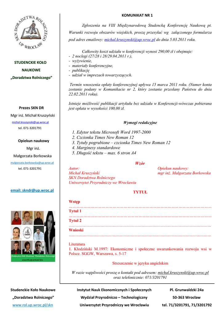 KOMUNIKAT NR 1 Zgłoszenia na VIII Międzynarodową Studencką Konferencję Naukową pt. Warunki rozwoju obszarów wiejskich, proszę przesyłać wg załączonego formularza pod adres emailowy: [email protected] do dnia 5.03.2011 roku. STUDENCKIE KOŁO NAUKOWE „Doradztwa Rolniczego” - Całkowity koszt udziału w konferencji wynosi 290,00 zł i obejmuje: 2 noclegi (27/28 i 28/29.04.2011 r.), wyżywienie, materiały konferencyjne, publikację udział w imprezach towarzyszących. Termin wnoszenia opłaty konferencyjnej upływa 15 marca 2011 roku. (Numer konta zostanie podany w Komunikacie nr 2, który zostanie przesłany Państwu do dnia 22.02.2011 roku). Prezes SKN DR Istnieje możliwość publikacji artykułu bez udziału w Konferencji-wówczas pobierana jest opłata w wysokości 100,00 zł. Mgr inż. Michał Kruszyński [email protected] Wymogi redakcyjne tel. 071-3201791 Opiekun naukowy Mgr inż. Małgorzata Borkowska [email protected] tel. 071-3201791 email: [email protected] 1. Edytor tekstu Microsoft Word 1997-2000 2. Czcionka Times New Roman 12 3. Tytuły pogrubione – czcionka Times New Roman 12 4. Marginesy standardowe 5. Długość tekstu – max. 6 stron A4 Wzór Autor: Michał Kruszyński SKN Doradztwa Rolniczego Uniwersytet Przyrodniczy we Wrocławiu Opiekun naukowy: mgr inż. Małgorzata Borkowska TYTUŁ Wstęp ……………………………………………………………………………………………………… Tytuł 1 ……………………………………………………………………………………………………… Tytuł 2 ………………………………………………………………………………………….. Wnioski ………………………………………………………………………………………….. Literatura 1. Kłodziński M.1997: Ekonomiczne i społeczne uwarunkowania rozwoju wsi w Polsce. SGGW, Warszawa, s. 5-17 Streszczenie w języku angielskim W razie wątpliwości proszę o kontakt pod adresem: [email protected] oraz telefonicznie: 071/3201791 Studenckie Koło Naukowe Instytut Nauk Ekonomicznych i Społecznych Pl. Grunwaldzki 24a „Doradztwa Rolniczego” Wydział Przyrodniczo – Technologiczny 50-363 Wrocław www.rol.up.wroc.pl/skn Uniwersytet Przyrodniczy we Wrocławiu tel. 71/3201791, 71/3201792