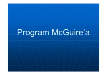 Program McGuire’a Gdzie kursy? Wielka Brytania Irlandia Stany Zjednoczone Holandia Skandynawia Australia Nowa Zelandia Południowa Afryka Definicja Jąkanie to.. czynnik psychiczny czynnik fizyczny Czynnik psychiczny mentalna i emocjonalna część jąkania Stały konflikt jednostki Lęk przed „wydaniem się”, że jąka się Lęk przed byciem postrzeżonym jako niekompetentny (praca, zapytany o opinię) Lęk przed odrzuceniem społecznym „Koło paniki” ..czyli mówienie jak przechodzenie przez pole minowe zmieszanie, lęk.. powstrzymywanie kroku/mowy.. mentalna i fizyczna blokada.. MINA !!/blok wstyd, poczucie winy Typy osób jąkających się A. UKRYTY • triki, skanowanie wypowiedzi, zastępowanie słów, unikanie pewnych sytuacji, wyręczanie się drugą osobą • życie rzadko prowadzi na pole minowe • dobra kontrola „koła paniki” B. ODKRYTY (wtórny) • triki przestają działać, słowa których nie sposób zastąpić (dane personalne, konkretne pytania, odpowiedzi), nie sposób uniknąć sytuacji, nie ma osoby do wyręczenia się • życie często prowadzi na pole minowe • „koło paniki” poza kontrolą Czynnik fizyczny Przepona (główny mięsień oddechowy) przepona część lędźwiowa 98% oddychania automatyczna (niezależna od woli) pracuje podczas mówienia, czuwania, spania część żebrowa ziewanie, wzmożone oddychanie, wdychanie nosem, ciężkie kasłanie, krzyczenie, głośne śpiewanie (śpiewacy operowi) wdech, wydech.. Co ważne Zdenerwowanie paraliżuje pracę cz. lędźwiowej przepony, pozostawia ją w pozycji wydechowej, narzuca jej złą pracę (zaburzony tor oddychania, zbyt płytkie, nieregularne wdechy) Nie ma wdechu, nie ma mowy. Cz. żebrowa, kontrolowana świadomie, przejmuje pracę głównego mięśnia oddechowego. praktyka 1. założenie paska na kl. piersiową 2. szybki i głęboki wdech („szybkie ziewnięcie”)- żebra idą na zewnątrz i do góry 3. wydech 4. pauza 5s. 10x „walka z blokiem” hit and hold („uderz i przytrzymaj”) spółgłoski zwarto-wybuchowe tj. p,b,k,g,t,d jak przy dmuchaniu świeczek na torcie Nie! Paaarasol Ale! Ppparasol np. Pppoproszę kawę! np. bbbalon kkkontrola gggarnek tttorba dddowód samogłoski tj. a,o,e,u,i,y tak samo „block release” („wypuszczenie bloku”) projekcja mowy z głębi klatki piersiowej np. mmma..makaron pppo… poproszę ,,Zawszepamiętnik” 1. wytrzymaj presję czasu 2. najpierw pomyśl co chcesz powiedzieć, „usłysz zdanie w głowie” 3. rozluźnij się, opuść ramiona 4. nawiąż kontakt wzrokowy z rozmówcą 5. szybki i pełny wdech 6. mów od razu po wdechu 7. „walka z blokiem” 8. wypuść pozostałe powietrze przełamanie ,,koła paniki” Lęk przed ,,wydaniem się”, sposobem odebrania, nieakceptacją.. toczy ,,kołem..” Jak pokonać lęk?.. robić dokładnie to czego najbardziej obawiamy się! ZNIECZULIĆ SIĘ!! „celowa niepłynność” • przedstawić się jako osoba jąkająca się, ale w trakcie terapii • „uderz i przytrzymaj” • „zwolnienie bloku” Ale! na „pewniepłynnych” słowach np. Witam! Kawę latte poproszę Witam! - ”pewniepłynne” słowo kawę – „słowo-mina” Wwwitam! Kawę… („uderz i..”) Wwwi… Witam! („zwolnienie..”) pokonanie „słowa miny” A. poziom lęku niski • głęboko z przepony lub • „zwolnienie bloku” (jeden wydech) B. poziom lęku umiarkowany • „zwolnienie bloku” i • głęboko z przepony (dwa wdechy) C. poziom lęku wysoki (nie mogę wydobyć nawet pierwszej litery słowa!) • „uderz i przytrzymaj” i • „zwolnienie bloku” i • głęboko z przepony Technika a życie codzienne 1. oddychaj cz. żebrową przepony od przebudzenia rano przynajmniej 1/5 oddechów 2. „zawszepamiętnik” 3. przełam „koło paniki” 4. pokonaj „słowa miny” do nudnego stadium (telefon, ulica) 5. poszerzaj swoją „strefę komfortu” poprzez stawianie czoła „polom minowym” (telefon, ulica, znajomi, praca)
