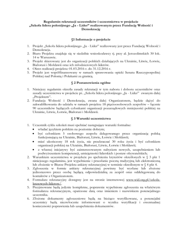 Regulamin rekrutacji uczestników i uczestnictwa w projekcie „Szkoła lidera polonijnego „Ja - Lider” realizowanym przez Fundację Wolność i Demokrację §1 Informacje o projekcie 1. Projekt „Szkoła lidera polonijnego „Ja - Lider” realizowany jest przez Fundację Wolność i Demokracja. 2. Biuro Projektu znajduje się w siedzibie wnioskodawcy tj. przy al. Jerozolimskich 30 lok. 14 w Warszawie. 3. Projekt skierowany jest do organizacji polskich działających na Ukrainie, Litwie, Łotwie, Białorusi i Mołdawii oraz ich młodzieżowych liderów. 4. Okres realizacji projektu: 01.03.2016 r. do 31.12.2016 r. 5. Projekt jest współfinansowany w ramach sprawowania opieki Senatu Rzeczypospolitej Polskiej nad Polonią i Polakami za granicą. § 2 Postanowienia ogólne 1. Niniejszy regulamin określa zasady rekrutacji w tym naboru i doboru uczestników oraz zasady uczestnictwa w projekcie pt. „Szkoła lidera polonijnego „Ja - Lider” zwanym dalej „Projektem”. 2. Fundacja Wolność i Demokracja, zwana dalej Organizatorem, będzie dążyć do zakwalifikowania do udziału w ramach projektu 18 pięcioosobowych zespołów – łącznie 90 uczestników będących członkami organizacji pozarządowych mniejszości polskiej na Ukrainie, Litwie, Łotwie, Białorusi i Mołdawii. § 3 Warunki uczestnictwa 1. Uczestnik cyklu szkoleń musi spełniać następujące warunki formalne: władać językiem polskim na poziomie dobrym; być członkiem 5 osobowego zespołu delegowanego przez organizację polską funkcjonującą na Ukrainie, Białorusi, Litwie, Łotwie i Mołdawii; mieć ukończony 18 rok życia, nie przekraczać 30 roku życia i być członkiem organizacji polskiej na Ukrainie, Białorusi, Litwie, Łotwie i Mołdawii; z własnej inicjatywy być zainteresowanym nabyciem nowych, uzupełnieniem lub podwyższeniem kompetencji, umiejętności liderskich i postaw obywatelskich; 2. Warunkiem uczestnictwa w projekcie po spełnieniu kryteriów określonych w § 3 pkt 1 niniejszego regulaminu, jest wypełnienie i przesłanie pocztą tradycyjną lub elektroniczną lub złożenie w Biurze Projektu ankiety rekrutacyjnej w terminie określonym w § 4 pkt 4. 3. Zgłoszenia w formie ankiety rekrutacyjnej powinny być wysłane lub złożone jednorazowo przez osobę będącą odpowiedzialną za zespół oraz oddelegowaną do kontaktów z Organizatorem. 4. Formularz rekrutacyjny dostępny jest na stronie internetowej www.wid.org.pl/szkolakresowych-liderow/. 5. Przyjmowane będą jedynie kompletne, poprawnie wypełnione zgłoszenia na właściwym formularzu rekrutacyjnym, opatrzone datą oraz imieniem i nazwiskiem potencjalnego uczestnika. 6. Złożone dokumenty zgłoszeniowe będą na bieżąco weryfikowane, a potencjalni uczestnicy będą niezwłocznie informowani o wyniku weryfikacji i ewentualnej konieczności poprawienia lub uzupełnienia dokumentów. 7. Za moment zgłoszenia przyjmuje się chwilę, w której do Biura Projektu wpłynął poprawnie wypełniony formularz rekrutacyjny. § 4 Zasady rekrutacji 1. Proces rekrutacji będzie odbywał się sukcesywnie, a rozpocznie się 01.05.2016 r. 2. Organizację procesu rekrutacji oraz rekrutację osób do uczestnictwa w szkoleniach objętych Projektem prowadzi Koordynator projektu. 3. Terminy i daty rekrutacji będą publikowane na stronie internetowej www.wid.org.pl, oraz we wszystkich narzędziach promocji (materiały promocyjne i środki masowego przekazu). 4. Przyjmowanie zgłoszeń na pełny cykl szkoleń rozpocznie się 01.05.2016 r. a zakończy się 30.07.2016 r. o godz. 16.00. 5. Sposoby informowania Beneficjentów ostatecznych o rekrutacji: wysłanie drogą mailową oficjalnego potwierdzenia o zakwalifikowaniu; komunikaty na stronie internetowej www.wid.org.pl; ogłoszenia w środkach masowego przekazu – media polonijne ukazujące się na Ukrainie, Litwie, Łotwie, Białorusi i Mołdawii; 6. W przypadku nie zebrania się grupy szkoleniowej określonej w §2 w w/w terminach przewiduje się możliwość przedłużenia rekrutacji do momentu zebrania wymaganej liczby uczestników. 7. Zgłoszenia na listę podstawową będą przyjmowane do momentu uzyskania wymaganej liczby uczestników dla określonej w §2 grupy docelowej. 8. Zgłoszenia, które wpłyną po uzyskaniu określonej liczby uczestników będą rejestrowane na liście rezerwowej. 9. Procedura rekrutacyjna składa się z następujących etapów: a. Wypełnienie formularza rekrutacyjnego i dostarczenie go lub przesłanie do Biura Projektu; b. Weryfikacja złożonych dokumentów; c. Sporządzenie listy uczestników szkoleń; d. Przesłanie pocztą elektroniczną informacji do wszystkich osób, które zostały zakwalifikowane do uczestnictwa w projekcie; 10. Przystąpienie kandydata do procesu rekrutacji, jest równoznaczne z zaakceptowaniem niniejszych procedur. § 5 Prawa uczestnika szkolenia 1. Każdy Uczestnik szkolenia ma prawo do: udziału w szkoleniu, do którego się zakwalifikował; zgłaszania uwag i oceny szkolenia, w którym uczestniczy; otrzymania materiałów szkoleniowych i innych pomocy dydaktycznych do zajęć; otrzymania zaświadczenia o uczestnictwie w cyklu szkoleń w ramach Projektu, po zaliczeniu wszystkich modułów cząstkowych; § 6 Obowiązki uczestnika szkolenia 1. Każdy Uczestnik szkolenia zobowiązuje się do: zapoznania się z treścią niniejszego regulaminu; uczestniczenia we wszystkich modułach szkolenia; wypełniania w trakcie trwania szkolenia ankiet ewaluacyjnych; 2. Każdy zespół, w skład którego wchodzi 5 młodych polonijnych liderów, deklaruje gotowość realizacji opracowanego podczas warsztatów miniprojektu po powrocie do miejsca działalności organizacji. § 7 Szkolenia 1. W ramach cyklu szkoleń zostaną przeprowadzone następujące moduły szkoleniowe: a. PIERWSZY MODUŁ – temat zajęć: Skuteczna komunikacja, efektywny zespół; Rola lidera, motywowanie do działania, elementy asertywnego reagowania na sytuacje trudne; Zarzą