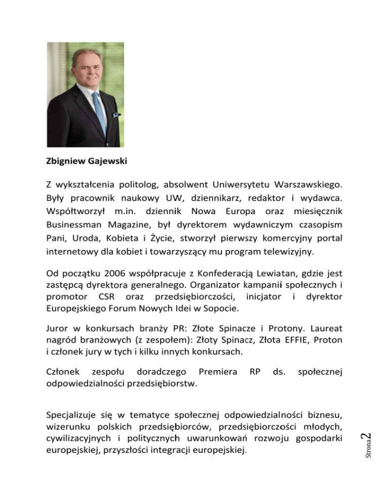 Zbigniew Gaje ewski Z wykkształcen nia polito olog, abssolwent Uniwerssytetu W Warszawsskiego. Były pracown nik naukkowy UW W, dzien nnikarz, redaktoor i wyd dawca. ółtworzył m.in. dzienniik Nowa Europa orazz miesięcznik Wspó ne, był dyrektorrem wydawniczyym czassopism Busineessman Magazin Pani, Uroda, Kobieta i Życie, stworzyył pierwsszy kom ercyjny portal intern netowy dla d kobiett i towarzzyszący mu m progrram telew wizyjny. Od po oczątku 2006 2 współpracuuje z Kon nfederacjją Lewia tan, gdzie jest zastęp pcą dyrektora ge eneralneggo. Organizator kampanii k i społeczznych i promo otor CSSR orazz przeddsiębiorcczości, inicjatorr i dyyrektor Europ pejskiego o Forum Nowych N Idei w So opocie. Juror w konkkursach branży b PPR: Złote e Spinaccze i Prootony. Laaureat nagró ód branżo owych (zz zespołeem): Złotty Spinaccz, Złota EFFIE, Proton P i człon nek jury w tych i kilku k innyych konkkursach. dss. społecznej Specjaalizuje się w tem matyce sspołeczn nej odpowiedzial ności biznesu, wizeru unku po olskich przedsięb p biorców,, przedssiębiorczoości mło odych, cywilizacyjnych i politycznychh uwaru unkowań ń rozwojju gospodarki pejskiej, przyszłoś p ści integrracji euro opejskiej.. europ 2 RP Strona Członeek zespołu doradcze d go Pre emiera odpow wiedzialn ności przedsiębioorstw.