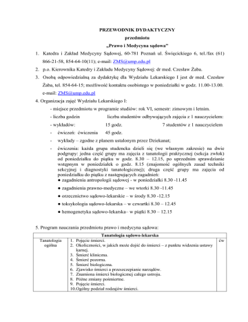 PRZEWODNIK DYDAKTYCZNY przedmiotu „Prawo i Medycyna sądowa” 1. Katedra i Zakład Medycyny Sądowej, 60-781 Poznań ul. Święcickiego 6, tel./fax (61) 866-21-58, 854-64-10(11); e-mail: [email protected] 2. p.o. Kierownika Katedry i Zakładu Medycyny Sądowej: dr med. Czesław Żaba. 3. Osobą odpowiedzialną za dydaktykę dla Wydziału Lekarskiego I jest dr med. Czesław Żaba, tel. 854-64-15; możliwość kontaktu osobistego w poniedziałki w godz. 11.00-13.00. e-mail: [email protected] 4. Organizacja zajęć Wydziału Lekarskiego I: - miejsce przedmiotu w programie studiów: rok VI, semestr: zimowym i letnim. - liczba godzin liczba studentów odbywających zajęcia z 1 nauczycielem: - wykładów: 15 godz. 7 studentów z 1 nauczycielem - ćwiczeń: ćwiczenia 45 godz. - wykłady – zgodne z planem ustalonym przez Dziekanat; - ćwiczenia: każda grupa studencka dzieli się (we własnym zakresie) na dwie podgrupy: jedna część grupy ma zajęcia z tanatologii praktycznej (sekcja zwłok) od poniedziałku do piątku w godz. 8.30 – 12.15, po uprzednim sprawdzianie wstępnym w poniedziałek o godz. 8.15 (znajomość ogólnych zasad techniki sekcyjnej i diagnostyki tanatologicznej); druga część grupy ma zajęcia od poniedziałku do piątku z następujących zagadnień: ● zagadnienia antropologii sądowej - w poniedziałki 8.30 -11.45 ● zagadnienia prawno-medyczne – we wtorki 8.30 -11.45 ● orzecznictwo sądowo-lekarskie – w środy 8.30 -12.15 ● toksykologia sądowo-lekarska – w czwartki 8.30 – 12.45 ● hemogenetyka sądowo-lekarska– w piątki 8.30 – 12.15 5. Program nauczania przedmiotu prawo i medycyna sądowa: Tanatologia ogólna Tanatologia sądowo-lekarska 1. Pojęcie śmierci. 2. Okoliczności, w jakich może dojść do śmierci – z punktu widzenia ustawy karnej. 3. Śmierć kliniczna. 4. Śmierć pozorna. 5. Śmierć biologiczna. 6. Zjawisko śmierci a przeszczepianie narządów. 7. Znamiona śmierci biologicznej całego ustroju. 8. Późne zmiany pośmiertne. 9. Pojęcie śmierci. 10. Ogólny podział rodzajów śmierci. ćw Śmierć z przyczyn naturalnych Obrażenia ciała i śmierć wskutek urazu mechanicznego Uduszenie gwałtowne Rażenie prądem elektrycznym lub piorunem Postrzałowe uszkodzenia ciała Opiniowanie w sprawach karnych. Karna odpowiedzialność zawodów medycznych 11. Segregacja przyczyn śmierci. 12. Zbieg przyczyn śmierci. 13. Odczyny postwitalne (interletalne). 14. Określanie czasu śmierci. 15. Oględziny zwłok na miejscu ich znalezienia. 16. Sądowo-lekarskie oględziny i sekcja zwłok 17. Zabezpieczanie materiału biologicznego do badań histopatologicznych, serologicznych i toksykologicznych. 18. Wypełnianie karty zgonu. 1. Niektóre trudności diagnostyczne. 2. Śmierć naturalna osób dorosłych. 3. Śmierć dzieci i młodzieży. 4. Ocena niespodziewanego zgonu nagłego z przyczyn naturalnych. 1. Obrażenia wywoływane narzędziami ostrymi. 2. Obrażenia spowodowane narzędziami tępymi. 3. Uszkodzenia narządów wewnętrznych w następstwie urazów mechanicznych ze szczególnym uwzględnieniem aspektów wypadków drogowych i z udziałem pojazdów szynowych. Rekonstrukcja przebiegu wypadków drogowych. 1. Przebieg procesu duszenia się i jego objawy. 2. Obraz sekcyjny śmierci wskutek uduszenia. 3. Niektóre dane dotyczące wymiany gazowej w płucach. 4. Zatkanie otworów nosowych i jamy ustnej. 5. Zamknięcie krtani, tchawicy lub dużych oskrzeli przez ciało obce. 6. Unieruchomienie klatki piersiowej. 7. Utonięcie. 8. Śmierć w wodzie. 9. Zagardlenie: powieszenie zadzierzgnięcie zadławienie. 10. Śmierć w ciasnej przestrzeni. 11. Choroba kesonowa. 1. Znamię prądu elektrycznego. Patomechanizm zgonu. 1. 2. 3. 4. 5. 6. 1. 2. 3. 4. 5. ćw ćw ćw ćw Broń palna. ćw Amunicja. Rany i uszkodzenia postrzałowe. Postrzały pociskiem odbitym. Otwory wlotowe i wylotowe. Ocena odległości strzału. Orzecznictwo sądowo-lekarskie Rola biegłego i zasady powoływania w świetle przepisów Kodeksu ćw Postępowania Karnego. Przestępstwa przeciwko zdrowiu i życiu ze szczególnym uwzględnieniem: a. zabójstwa i pobicia ze skutkiem śmiertelnym b. dzieciobójstwa c. eutanazji d. przerwania ciąży. Zasady badania sądowo-lekarskiego pokrzywdzonego. Zasady opracowywania opinii sądowo-lekarskich dotyczących oceny skutków i mechanizmu powstania obrażeń ciała. Karna odpowiedzialność w związku z wykonywaniem zawodu w świetle obowiązujących przepisów prawa. Błąd medyczny, niepowodzenie 2 Opiniowanie w sprawach cywilnoodszkodowawczych. Cywilna odpowiedzialność zawodów medycznych Opinie sądowolekarskie w Prawie Pracy Regulacje prawne zawodu lekarza. Odpowiedzialność zawodowa lekarzy. Kodeks Etyki Lekarskiej Dokumentacja medyczna w świetle obowiązujących przepisów prawa Hemogenetyka sądowolekarska lekarskie, powikłania. Działanie bez zgody pacjenta. 6. Przestępstwa przeciwko wolności i obyczajności ze szczególnym uwzględnieniem czynów nierządnych i lubieżnych. Zasady dotyczące przeprowadzania badania pokrzywdzonego i opiniowania sądowo-lekarskiego. 7. Dziecko jako ofiara przestępstw. Zespół dręczonego dziecka. 1. Zdrowie jako dobro ogólne w rozumieniu Kodeksu Cywilnego. 2. Tajemnica zawodowa w przepisach Kodeksu Cywilnego. 3. Odpowiedzialność cywilna zakładów publicznej służby zdrowia. Pracownicy służby zdrowia jako funkcjonariusze państwowi. 4. Prawa pacjenta oraz odpowiedzialność służby zdrowia za niewłaściwe zachowanie w stosunku do pacjenta. 5. Zasady ustalania odpowiedzialności cywilnej i zawodowej w związku z wykonywaniem zawodu- wina umyślna, błąd, wina bezimienna, prawdopodobieństwo zawinienia. 6. Zasady opracowywania opinii sądowo- lekarskich dotyczących skutków urazów, możliwości wykonywania pracy, rokowań, kosztów leczenia, nawiązki za ból. 7. Cywilno-prawne aspekty działania prywatnych placówek leczniczych. 8. Ubezpieczenia od odpowiedzialności cy