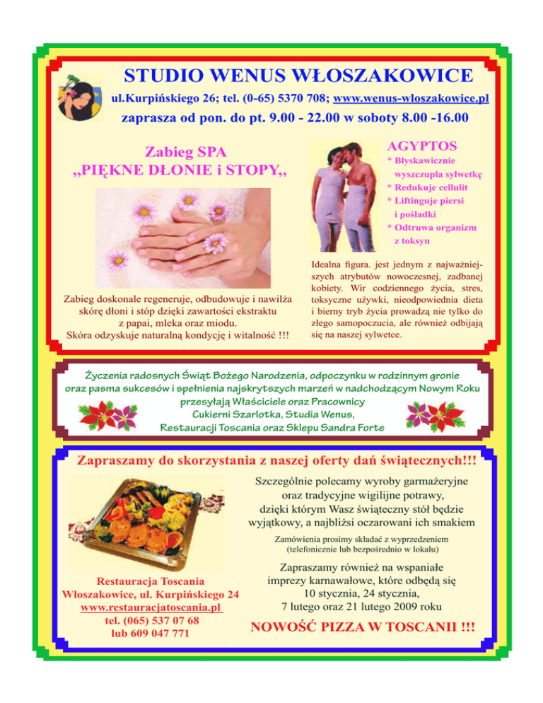 STUDIO WENUS Włoszakowice ul.Kurpińskiego 26; tel. (0-65) 5370 708; www.wenus-wloszakowice.pl zaprasza od pon. do pt. 9.00 - 22.00 w soboty 8.00 -16.00 Zabieg SPA ,,PIĘKNE DŁONIE i STOPY,, Zabieg doskonale regeneruje, odbudowuje i nawilża skórę dłoni i stóp dzięki zawartości ekstraktu z papai, mleka oraz miodu. Skóra odzyskuje naturalną kondycję i witalność !!! AGYPTOS * Błyskawicznie wyszczupla sylwetkę * Redukuje cellulit * Liftinguje piersi i pośladki * Odtruwa organizm z toksyn Idealna figura. jest jednym z najważniejszych atrybutów nowoczesnej, zadbanej kobiety. Wir codziennego życia, stres, toksyczne używki, nieodpowiednia dieta i bierny tryb życia prowadzą nie tylko do złego samopoczucia, ale również odbijają się na naszej sylwetce. Życzenia radosnych Świąt Bożego Narodzenia, odpoczynku w rodzinnym gronie oraz pasma sukcesów i spełnienia najskrytszych marzeń w nadchodzącym Nowym Roku przesyłają Właściciele oraz Pracownicy Cukierni Szarlotka, Studia Wenus, Restauracji Toscania oraz Sklepu Sandra Forte Zapraszamy do skorzystania z naszej oferty dań świątecznych!!! Szczególnie polecamy wyroby garmażeryjne oraz tradycyjne wigilijne potrawy, dzięki którym Wasz świąteczny stół będzie wyjątkowy, a najbliżsi oczarowani ich smakiem Zamówienia prosimy składać z wyprzedzeniem (telefonicznie lub bezpośrednio w lokalu) Restauracja Toscania Włoszakowice, ul. Kurpińskiego 24 www.restauracjatoscania.pl tel. (065) 537 07 68 lub 609 047 771 Zapraszamy również na wspaniałe imprezy karnawałowe, które odbędą się 10 stycznia, 24 stycznia, 7 lutego oraz 21 lutego 2009 roku Nowość pizza w ToscanIi !!!
