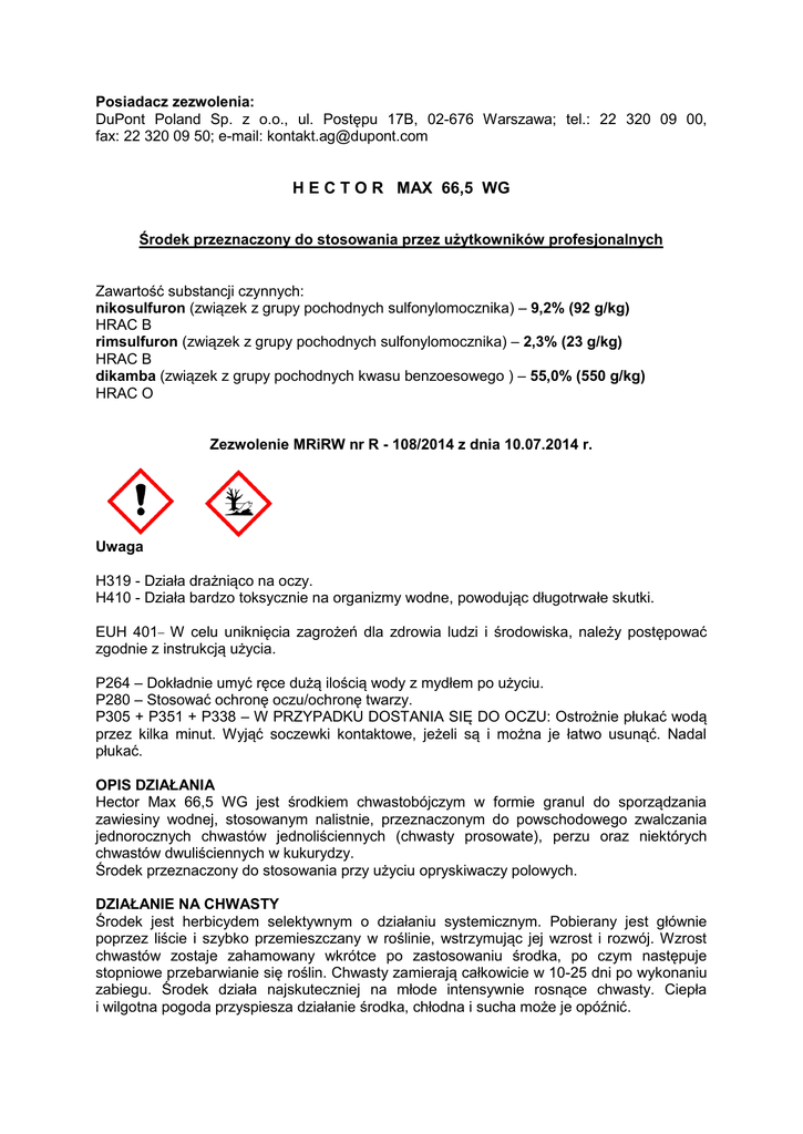 Posiadacz zezwolenia: DuPont Poland Sp. z o.o., ul. Postępu 17B, 02-676 Warszawa; tel.: 22 320 09 00, fax: 22 320 09 50; e-mail: [email protected] H E C T O R MAX 66,5 WG Środek przeznaczony do stosowania przez użytkowników profesjonalnych Zawartość substancji czynnych: nikosulfuron (związek z grupy pochodnych sulfonylomocznika) – 9,2% (92 g/kg) HRAC B rimsulfuron (związek z grupy pochodnych sulfonylomocznika) – 2,3% (23 g/kg) HRAC B dikamba (związek z grupy pochodnych kwasu benzoesowego ) – 55,0% (550 g/kg) HRAC O Zezwolenie MRiRW nr R - 108/2014 z dnia 10.07.2014 r. Uwaga H319 - Działa drażniąco na oczy. H410 - Działa bardzo toksycznie na organizmy wodne, powodując długotrwałe skutki. EUH 401 W celu uniknięcia zagrożeń dla zdrowia ludzi i środowiska, należy postępować zgodnie z instrukcją użycia. P264 – Dokładnie umyć ręce dużą ilością wody z mydłem po użyciu. P280 – Stosować ochronę oczu/ochronę twarzy. P305 + P351 + P338 – W PRZYPADKU DOSTANIA SIĘ DO OCZU: Ostrożnie płukać wodą przez kilka minut. Wyjąć soczewki kontaktowe, jeżeli są i można je łatwo usunąć. Nadal płukać. OPIS DZIAŁANIA Hector Max 66,5 WG jest środkiem chwastobójczym w formie granul do sporządzania zawiesiny wodnej, stosowanym nalistnie, przeznaczonym do powschodowego zwalczania jednorocznych chwastów jednoliściennych (chwasty prosowate), perzu oraz niektórych chwastów dwuliściennych w kukurydzy. Środek przeznaczony do stosowania przy użyciu opryskiwaczy polowych. DZIAŁANIE NA CHWASTY Środek jest herbicydem selektywnym o działaniu systemicznym. Pobierany jest głównie poprzez liście i szybko przemieszczany w roślinie, wstrzymując jej wzrost i rozwój. Wzrost chwastów zostaje zahamowany wkrótce po zastosowaniu środka, po czym następuje stopniowe przebarwianie się roślin. Chwasty zamierają całkowicie w 10-25 dni po wykonaniu zabiegu. Środek działa najskuteczniej na młode intensywnie rosnące chwasty. Ciepła i wilgotna pogoda przyspiesza działanie środka, chłodna i sucha może je opóźnić. Chwasty wrażliwe: bodziszek drobny, chwastnica jednostronna, gwiazdnica pospolita, komosa biała, maruna bezwonna, perz właściwy, rdest plamisty, rumian polny, szarłat szorstki. Chwasty średnio wrażliwe: psianka czarna, rdest powojowy. Chwasty odporne: skrzyp polny, odporne są chwasty średnio wrażliwe w późniejszych fazach rozwojowych (powyżej 6 liści). STOSOWANIE ŚRODKA Kukurydza Maksymalna dawka dla jednorazowego zastosowania: 440 g/ha Zalecana dawka dla jednorazowego zastosowania: 330-440 g/ha Środek stosować w fazie 2-6 liści kukurydzy (BBCH 12 - 16), gdy: - większość roślin perzu osiągnęła wysokość 15-20 cm, - rośliny chwastnicy jednostronnej znajdują się w fazie 3 liści do końca fazy krzewienia, - większość chwastów dwuliściennych znajduje się w fazie 2-4 liści. Wyższą z zalecanych dawkę stosować w wypadku występowania psianki czarnej oraz przy intensywnym zachwaszczeniu. Hector Max 66,5 WG stosuje się łącznie z adiuwantem Trend 90 EC w stężeniu 0,1% (100 ml /100 l wody). Maksymalna liczba zabiegów w sezonie wegetacyjnym: 1 Zalecana ilość wody: 200 - 300 l/ha Zalecane opryskiwanie: średniokropliste NASTĘPSTWO ROŚLIN W przypadku konieczności wcześniejszej likwidacji plantacji jako roślinę następczą można uprawiać kukurydzę lub zboża ozime (przed siewem należy przeprowadzić orkę). W roku, w którym zastosowano Hector Max 66,5 WG nie można uprawiać pomidorów i tytoniu. Wiosną i jesienią następnego roku można uprawiać wszystkie rośliny. ŚRODKI OSTROŻNOŚCI I ZALECENIA STOSOWANIA ZWIĄZANE Z DOBRĄ PRAKTYKĄ ROLNICZĄ 1. Po zastosowaniu środka na niektórych odmianach kukurydzy mogą wystąpić przemijające objawy fitotoksyczności. 2. Warunki niekorzystne dla wzrostu i rozwoju kukurydzy w okresie poprzedzającym zabiegi jak i po zabiegu mogą zwiększyć ryzyko wystąpienia objawów fitotoksyczności. 3. Środka nie stosować: - w kukurydzy cukrowej, pękającej oraz w uprawie materiałów hodowlanych, - bezpośrednio po okresie długotrwałych chłodów (lub ciągłych opadów), na rośliny, których wzrost został zahamowany. Zabieg można wykonać po wznowieniu intensywnego wzrostu przez rośliny kukurydzy (gdy zostanie odbudowana powłoka woskowa), - w temperaturze powietrza poniżej 10oC i powyżej 25oC oraz podczas silnego nasłonecznienia, - gdy różnice temperatur między dniem a nocą są większe niż 17oC, - na plantacjach roślin chorych, osłabionych przez szkodniki, przymrozek, mróz, nadmiar wilgoci, suszę, niedobór składników mineralnych lub inne czynniki powodujące osłabienie wzrostu (stosowanie na glebach bardzo lekkich zwiększa ryzyko wystąpienia i wpływu wymienionych czynników stresowych), - na mokre rośliny (rosa, deszcze), - gdy przewiduje się wystąpienie opadu w przeciągu 3 godzin po zabiegu. 4. Podczas stosowania środka nie dopuścić do: - znoszenia cieczy użytkowej na sąsiednie plantacje roślin uprawnych, - nakładania się cieczy użytkowej na stykach pasów zabiegowych i uwrociach. SPORZĄDZANIE CIECZY UŻYTKOWEJ Ciecz użytkową środka sporządzić bezpośrednio przed użyciem. Przed przystąpieniem do sporządzenia cieczy użytkowej dokładnie ustalić potrzebną jej ilość. Przed przystąpieniem do odmierzania (odważania) środka zawartość pojemnika dokładnie wstrząsnąć (wymieszać). Środek odmierzyć załączoną do opakowania wyskalowaną miarką (lub odważyć). Odmierzoną ilość środka wsypać bezpośrednio do zbiornika opryskiwacza napełnionego częściowo wodą (z włączonym mieszadłem) i uzupełnić wodą do potrzebnej ilości ciągle dokładnie mieszając. W ostatniej kolejności dodać środek wspomagający Trend 90 EC. Opróżnione opakowania przepłukać trzykrotnie wodą, a popłuczyny wlać do zbiornika opryskiwacza z cieczą użytkową. W przypadku przerw w opryskiwaniu przed prz