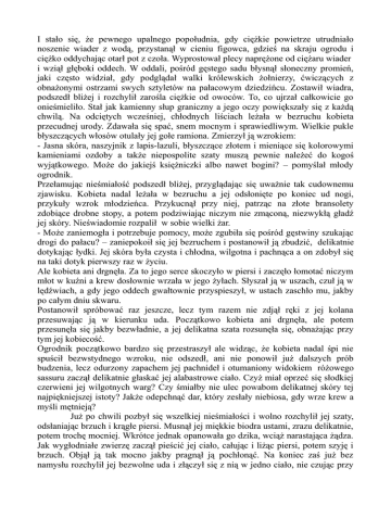 I stało się, że pewnego upalnego popołudnia, gdy ciężkie powietrze utrudniało noszenie wiader z wodą, przystanął w cieniu figowca, gdzieś na skraju ogrodu i ciężko oddychając otarł pot z czoła. Wyprostował plecy naprężone od ciężaru wiader i wziął głęboki oddech. W oddali, pośród gęstego sadu błysnął słoneczny promień, jaki często widział, gdy podglądał walki królewskich żołnierzy, ćwiczących z obnażonymi ostrzami swych sztyletów na pałacowym dziedzińcu. Zostawił wiadra, podszedł bliżej i rozchylił zarośla ciężkie od owoców. To, co ujrzał całkowicie go onieśmieliło. Stał jak kamienny słup graniczny a jego oczy powiększały się z każdą chwilą. Na odciętych wcześniej, chłodnych liściach leżała w bezruchu kobieta przecudnej urody. Zdawała się spać, snem mocnym i sprawiedliwym. Wielkie pukle błyszczących włosów otulały jej gołe ramiona. Zmierzył ją wzrokiem: - Jasna skóra, naszyjnik z lapis-lazuli, błyszczące złotem i mieniące się kolorowymi kamieniami ozdoby a także niepospolite szaty muszą pewnie należeć do kogoś wyjątkowego. Może do jakiejś księżniczki albo nawet bogini? – pomyślał młody ogrodnik. Przełamując nieśmiałość podszedł bliżej, przyglądając się uważnie tak cudownemu zjawisku. Kobieta nadal leżała w bezruchu a jej odsłonięte po koniec ud nogi, przykuły wzrok młodzieńca. Przykucnął przy niej, patrząc na złote bransolety zdobiące drobne stopy, a potem podziwiając niczym nie zmąconą, niezwykłą gładź jej skóry. Nieświadomie rozpalił w sobie wielki żar. - Może zaniemogła i potrzebuje pomocy, może zgubiła się pośród gęstwiny szukając drogi do pałacu? – zaniepokoił się jej bezruchem i postanowił ją zbudzić, delikatnie dotykając łydki. Jej skóra była czysta i chłodna, wilgotna i pachnąca a on zdobył się na taki dotyk pierwszy raz w życiu. Ale kobieta ani drgnęła. Za to jego serce skoczyło w piersi i zaczęło łomotać niczym młot w kuźni a krew dosłownie wrzała w jego żyłach. Słyszał ją w uszach, czuł ją w lędźwiach, a gdy jego oddech gwałtownie przyspieszył, w ustach zaschło mu, jakby po całym dniu skwaru. Postanowił spróbować raz jeszcze, lecz tym razem nie zdjął ręki z jej kolana przesuwając ją w kierunku uda. Początkowo kobieta ani drgnęła, ale potem przesunęła się jakby bezwładnie, a jej delikatna szata rozsunęła się, obnażając przy tym jej kobiecość. Ogrodnik początkowo bardzo się przestraszył ale widząc, że kobieta nadal śpi nie spuścił bezwstydnego wzroku, nie odszedł, ani nie ponowił już dalszych prób budzenia, lecz odurzony zapachem jej pachnideł i otumaniony widokiem różowego sassuru zaczął delikatnie głaskać jej alabastrowe ciało. Czyż miał oprzeć się słodkiej czerwieni jej wilgotnych warg? Czy śmiałby nie ulec powabom delikatnej skóry tej najpiękniejszej istoty? Jakże odepchnąć dar, który zesłały niebiosa, gdy wrze krew a myśli mętnieją? Już po chwili pozbył się wszelkiej nieśmiałości i wolno rozchylił jej szaty, odsłaniając brzuch i krągłe piersi. Musnął jej miękkie biodra ustami, zrazu delikatnie, potem trochę mocniej. Wkrótce jednak opanowała go dzika, wciąż narastająca żądza. Jak wygłodniałe zwierzę zaczął pieścić jej ciało, całując i liżąc piersi, potem szyję i brzuch. Objął ją tak mocno jakby pragnął ją pochłonąć. Na koniec zaś już bez namysłu rozchylił jej bezwolne uda i złączył się z nią w jedno ciało, nie czując przy tym wcale, jak ona drży wraz z nim i ciężko oddycha. Pierwszy raz był niezdarny i krótki, za to on myślał, że trafił do nieba. Rozedrgany nie opuścił sassuru leżącej kobiety. Nie nasycił się wszak do pełna a w lędźwiach wciąż jeszcze czuł ogień. Po krótkiej chwili zanurzył twarz w jej czarne włosy i jakby pogrążony w amoku sprawił sobie rozkosz tym większą, bo wiedział już jak osiągnąć niebo. Wówczas, gdy drżąc i sapiąc skończył, ona otwarła oczy i zajrzała wprost do wnętrza jego duszy, a wtedy dostrzegając ich odmienność pojął grozę swego położenia. Takich oczu nie widział u żadnej kobiety. Tylko oni mieli takie oczy. Bez trudu potrafiły wwiercić się jego głowę i odczytać myśli. Strach i groza prawie zatrzymała jego przerażone serce, albowiem zdał sobie sprawę, że nie jest ona z tego świata.