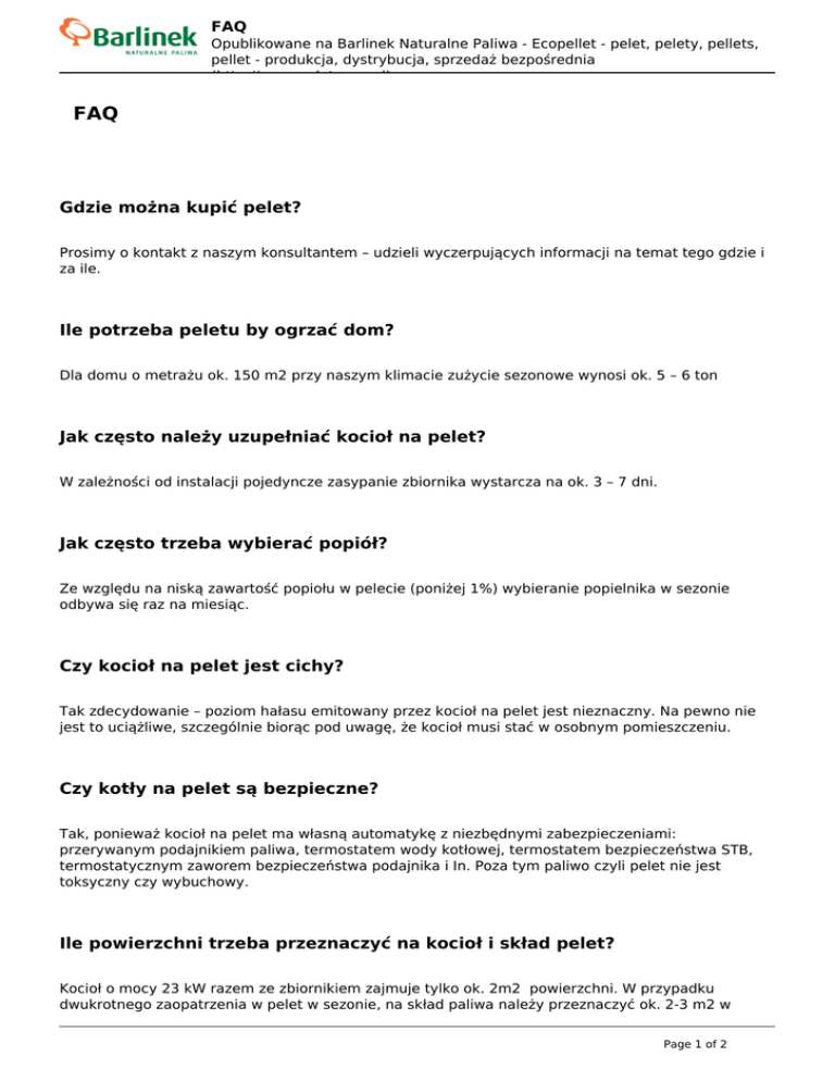 FAQ Opublikowane na Barlinek Naturalne Paliwa - Ecopellet - pelet, pelety, pellets, pellet - produkcja, dystrybucja, sprzedaż bezpośrednia (http://www.pelet.com.pl) FAQ Gdzie można kupić pelet? Prosimy o kontakt z naszym konsultantem – udzieli wyczerpujących informacji na temat tego gdzie i za ile. Ile potrzeba peletu by ogrzać dom? Dla domu o metrażu ok. 150 m2 przy naszym klimacie zużycie sezonowe wynosi ok. 5 – 6 ton Jak często należy uzupełniać kocioł na pelet? W zależności od instalacji pojedyncze zasypanie zbiornika wystarcza na ok. 3 – 7 dni. Jak często trzeba wybierać popiół? Ze względu na niską zawartość popiołu w pelecie (poniżej 1%) wybieranie popielnika w sezonie odbywa się raz na miesiąc. Czy kocioł na pelet jest cichy? Tak zdecydowanie – poziom hałasu emitowany przez kocioł na pelet jest nieznaczny. Na pewno nie jest to uciążliwe, szczególnie biorąc pod uwagę, że kocioł musi stać w osobnym pomieszczeniu. Czy kotły na pelet są bezpieczne? Tak, ponieważ kocioł na pelet ma własną automatykę z niezbędnymi zabezpieczeniami: przerywanym podajnikiem paliwa, termostatem wody kotłowej, termostatem bezpieczeństwa STB, termostatycznym zaworem bezpieczeństwa podajnika i In. Poza tym paliwo czyli pelet nie jest toksyczny czy wybuchowy. Ile powierzchni trzeba przeznaczyć na kocioł i skład pelet? Kocioł o mocy 23 kW razem ze zbiornikiem zajmuje tylko ok. 2m2 powierzchni. W przypadku dwukrotnego zaopatrzenia w pelet w sezonie, na skład paliwa należy przeznaczyć ok. 2-3 m2 w Page 1 of 2 FAQ Opublikowane na Barlinek Naturalne Paliwa - Ecopellet - pelet, pelety, pellets, pellet - produkcja, dystrybucja, sprzedaż bezpośrednia (http://www.pelet.com.pl) suchym pomieszczeniu. Czy wystarczy surowca na pelet? Tak, na pewno! Człowiek od początku „oswojenia”ognia wykorzystywał do ogrzewania głównie drewno. Nawet tak długa eksploatacja tych zasobów naturalnych nie ma wpływu zarówno na lokalny jak i globalny ekosystem. Materiałem na pelet jest drewno – najszybciej „odnawiające się” paliwo. Nie można tego powiedzieć o innych paliwach jak węgiel czy ropa. Pelet jest paliwem ekologicznym gdyż po pierwsze, tak jak inne paliwa z biomasy, jest pochodzenia organicznego, a po wtóre jest wytworzony z materiałów ubocznych przetwórstwa drzewnego. Dlatego w celu wytworzenia paliwa nie ma potrzeby ścinania ani jednego drzewa. Warto zaznaczyć, że materiały uboczne stanowią nawet powyżej 50% pierwotnego surowca drzewnego a dotychczas były zazwyczaj marnotrawione. W jakiej formie można kupić pelet? Pelet dystrybuowany w Polsce jest dostępny w poręcznych 15-25 kg workach oraz w opakowaniu "Big-bag" 1T. Adres URL źródła: http://www.pelet.com.pl/pl/faq.html Page 2 of 2 Powered by TCPDF (www.tcpdf.org)