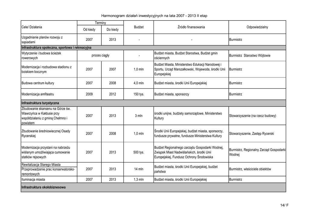Harmonogram działań inwestycyjnych na lata 2007 - 2013 II etap Terminy Cele/ Działania Uzgadnianie planów rozwoju z sąsiadami Od kiedy Do kiedy 2007 2013 Infrastruktura społeczna, sportowa i rekreacyjna Wytyczenie i budowa ścieŜek proces ciągły rowerowych BudŜet Źródło finansowania - - - Odpowiedzialny Burmistrz BudŜet miasta, BudŜet Starostwa, BudŜet gmin ościennych Burmistrz Starostwo Wójtowie Modernizacja i rozbudowa stadionu z boiskiem bocznym 2007 2007 1,0 mln BudŜet Miasta, Ministerstwo Edukacji Narodowej i Sportu, Urząd Marszałkowski, Wojewoda, środki Unii Europejskiej Burmistrz Budowa centrum kultury 2007 2008 4,0 mln BudŜet miasta, środki Unii Europejskiej Burmistrz Modernizacja amfiteatru 2009 2012 150 tys. BudŜet miasta, sponsorzy Burmistrz Zbudowanie skansenu na Górze św. Wawrzyńca w Kałdusie przy współdziałaniu z gminą Chełmno i powiatem 2007 2013 3 mln środki unijne, budŜety samorządowe, Ministerstwo Kultury Stowarzyszenie (na rzecz budowy) Zbudowanie średniowiecznej Osady Rycerskiej 2007 2008 1,0 mln Środki Unii Europejskiej, budŜet miasta, sponsorzy, fundusze prywatne, fundusze Ministerstwa Kultury Stowarzyszenie, Zastęp Rycerski Modernizacja przystani na nabrzeŜu wiślanym umoŜliwiająca cumowanie statków rejsowych 2007 2013 500 tys. BudŜet Regionalnego zarządu Gospodarki Wodnej, Związek Miast Nadwiślańskich, środki Unii Europejskiej, Fundusz Ochrony Środowiska Burmistrz, Regionalny Zarząd Gospodarki Wodnej 2007 2013 14 mln BudŜet miasta, środki Unii Europejskiej, budŜet państwa Burmistrz, właściciele obiektów 2007 2013 1,3 mln BudŜet miasta, środki Unii Europejskiej Burmistrz Infrastruktura turystyczna Rewitalizacja Starego Miasta Przeprowadzenie prac konserwatorskoremontowych Iluminacja miasta Infrastruktura okołobiznesowa 14/ F Harmonogram działań inwestycyjnych na lata 2007 - 2013 II etap Utworzenie Inkubatora Przedsiębiorczości Tereny inwestycyjne Pozyskanie terenów inwestycyjnych przez współdziałanie z sąsiednimi gminami BudŜet miasta, środki krajowe, środki urzędu pracy, środki regionalne, fundusze unijne Centrum Wspierania Przedsiębiorczości — — Związek Gmin 2013 — — Starosta 2007 2010 12 mln BudŜet miasta, środki Unii Europejskiej, Wojewódzki Zarząd Dróg, budŜet państwa Burmistrz 2007 2013 5,5 mln BudŜet miasta, środki Unii Europejskiej Burmistrz 2007 2013 5 mln BudŜet miasta, środki Unii Europejskiej Burmistrz 2007 2008 - Generalna Dyrekcja Dróg Krajowych i Autostrad, środki Unii Europejskiej Generalna Dyrekcja Dróg Krajowych i Autostrad 2007 2009 1,5 mln BudŜet miasta, środki Unii Europejskiej Dyrektor Zakładu wodociągów i Kanalizacji 2007 2013 200 tys. 2007 2013 2010 Infrastruktura techniczna - drogi Budowa obwodnicy od E1 do Brzozowa Budowa „małej obwodnicy” (odcinek E1 do drogi 550 przez Os. Rybaki) Wykonanie nakładek nawierzchni dróg asfaltowych na terenie całego miasta Modernizacja dróg: - ul.Podgórna, Kolonia Wilsona, Zakole, Prosta, Ustronie, Wybudowanie, Wiklinowa, Czereśniowa, Lipowa, Śliwowa, Magazynowa, Szosa Grudziądzka (przy byłym torze PKP), os. Dworzyska, ul.Nad Browiną, Nadrzeczna, Storczykowa, druga droga z ul.Kwiatowej do 550 i do om UŚĆ, ul.Kolibrowa, Bociania, Osnowska, śurawia, odj Rybaki, ul.Powiśle Przebudowa skrzyŜowań trasy E1 z ul.Szosa Grudziądzka, Nad Groblą, Łunawska Uzbrojenie terenu w media Modernizacja ujęcia wody i stacji uzdatniania wody 14/ F Harmonogram działań inwestycyjnych na lata 2007 - 2013 II etap Budowa linii segregacji odpadów na składowisku 2007 2008 1 mln BudŜet miasta, środki Unii Europejskiej, Wojewódzki Fundusz Ochrony Środowiska i Gospodarki Wodnej, Burmistrz Narodowy Fundusz Ochrony Środowiska i Gospodarki Wodnej Wykonanie sieci wodociągowej: ul.Łunawska, Podgórna, Wiklinowa, om Uść, Przemysłowa, Magazynowa, Wybudowanie (CPN) 2007 2008 1 mln BudŜet miasta, środki Unii Europejskiej Burmistrz Wykonanie kanalizacji sanitarnej: -os. Wybudowanie, odj Działki Miejskie, ul.Łunawska, os. Dworzyska, Os. Nad Browiną, ul.Osnowska, odj Kwiatowa, ul.Toruńska, Ogrodowa do ul.Chabrowej, Przemysłowa, Magazynowa, om UŚĆ 2007 2010 7 mln BudŜet miasta, środki Unii Europejskiej, Wojewódzki Fundusz Ochrony Środowiska i Gospodarki Wodnej Burmistrz 2007 2007 100 tys. BudŜet miasta, środki Unii Europejskiej Burmistrz 2007 2010 0,5 mln BudŜet miasta, środki Unii Europejskiej, Wojewódzki Fundusz Ochrony Środowiska i Gospodarki Wodnej Burmistrz 2008 2012 - Zakład Energetyczny Zakład Energetyczny 2009 2013 3,8 mln BudŜet miasta, środki Unii Europejskiej, Wojewódzki Fundusz Ochrony Środowiska i Gospodarki Wodnej, Zakład Gazowniczy Burmistrz Wykonanie wewnętrznej kanalizacji sanitarnej na terenie ośrodka nad jez. Starogrodzkim Wykonaie kanalizacji deszczowej: -os. Działki Miejskie, ul.Wiklinowa, Podgórna, om Uść, os. Dworzyska Rozbudowa sieci energetycznej: - om Uść, odj Nad Browiną Wykonanie sieci gazyfikacyjnej: ul.Łunawska, Wiklinowa, om Uść, ul.Przemysłowa, Magazynowa, os. Wybudowanie, odj Działki Miejskie, os. Dworzyska, os.Rybaki, ul. Nad Groblą 14/ F