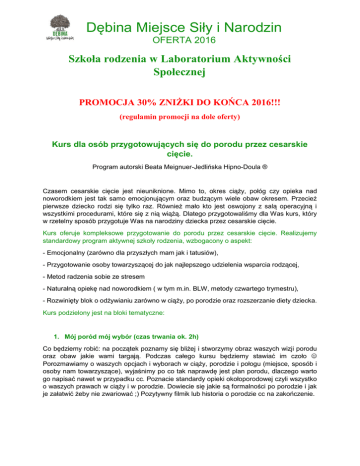 Dębina Miejsce Siły i Narodzin OFERTA 2016 Szkoła rodzenia w Laboratorium Aktywności Społecznej PROMOCJA 30% ZNIŻKI DO KOŃCA 2016!!! (regulamin promocji na dole oferty) Kurs dla osób przygotowujących się do porodu przez cesarskie cięcie. Program autorski Beata Meignuer-Jedlińska Hipno-Doula ® Czasem cesarskie cięcie jest nieuniknione. Mimo to, okres ciąży, połóg czy opieka nad noworodkiem jest tak samo emocjonującym oraz budzącym wiele obaw okresem. Przecież pierwsze dziecko rodzi się tylko raz. Również mało kto jest oswojony z salą operacyjną i wszystkimi procedurami, które się z nią wiążą. Dlatego przygotowaliśmy dla Was kurs, który w rzetelny sposób przygotuje Was na narodziny dziecka przez cesarskie cięcie. Kurs oferuje kompleksowe przygotowanie do porodu przez cesarskie cięcie. Realizujemy standardowy program aktywnej szkoły rodzenia, wzbogacony o aspekt: - Emocjonalny (zarówno dla przyszłych mam jak i tatusiów), - Przygotowanie osoby towarzyszącej do jak najlepszego udzielenia wsparcia rodzącej, - Metod radzenia sobie ze stresem - Naturalną opiekę nad noworodkiem ( w tym m.in. BLW, metody czwartego trymestru), - Rozwinięty blok o odżywianiu zarówno w ciąży, po porodzie oraz rozszerzanie diety dziecka. Kurs podzielony jest na bloki tematyczne: 1. Mój poród mój wybór (czas trwania ok. 2h) Co będziemy robić: na początek poznamy się bliżej i stworzymy obraz waszych wizji porodu oraz obaw jakie wami targają. Podczas całego kursu będziemy stawiać im czoło Porozmawiamy o waszych opcjach i wyborach w ciąży, porodzie i połogu (miejsce, sposób i osoby nam towarzyszące), wyjaśnimy po co tak naprawdę jest plan porodu, dlaczego warto go napisać nawet w przypadku cc. Poznacie standardy opieki okołoporodowej czyli wszystko o waszych prawach w ciąży i w porodzie. Dowiecie się jakie są formalności po porodzie i jak je załatwić żeby nie zwariować ;) Pozytywny filmik lub historia o porodzie cc na zakończenie. Dębina Miejsce Siły i Narodzin OFERTA 2016 2. BLS czyli podstawowe zabiegi reanimacyjne u niemowląt (czas trwania ok. 3 h) Kurs BLS ( Basic Life Support) czyli podstawowe zabiegi reanimacyjne u niemowląt to warsztaty dedykowane rodzicom, opiekunom, małych dzieci. Algorytm postępowania w przypadku niedrożności dróg oddechowych spowodowanej ciałem obcym u niemowlaka (zadławienie), opracowany na podstawie wytycznych Europejskiej Rady Resuscytacji 2015. Algorytm podstawowych zabiegów reanimacyjnych u niemowlaka, opracowany na podstawie wytycznych Europejskiej Rady Resuscytacji 2015. Na kursie, po krótkim wykładzie będziemy ćwiczyć resuscytację krążeniowo-oddechową oraz postępowanie w zadławieniu. Wszystkie praktyczne ćwiczenia prowadzone są na profesjonalnych fantomach niemowlęcych. 3. Zrozumieć poród, oswoić połóg (czas trwania ok. 2,5 h) Co będziemy robić: dowiecie się wszystkiego o porodzie przez cc. Przygotowanie i przebieg cc. Standardy przyjęcia do szpitala. Rodzaje znieczuleń. Dlaczego kontakt skóra do skóry i kangurowanie jest szczególnie ważne po cc. Dowiecie się co to jest kolonizacja bakteriami po porodzie przez cc. Jak prosto komunikować swoje potrzeby personelowi medycznemu przed, w trakcie i po porodzie. A że poród to nie koniec, porozmawiamy o wszystkim co się z nami dzieje w połogu i jak z tym sobie radzić. Jak obserwować swoje ciało po cesarskim cięciu i na co reagować. Pozytywny filmik lub historia o porodzie cc na zakończenie. 4. Twoje mleko moje zdrowie (czas trwania ok. 2 h) Co będziemy robić: obalać mity na temat karmienia naturalnego. Poznacie fakty dotyczące karmienia naturalnego oraz butelką. Jak rozhulać laktację po cc. Stawimy czoła najczęstszym problemom z karmieniem, porozmawiamy o roli ojca w karmieniu naturalnym. Dowiecie się, że nie ma czegoś takiego jak dieta kobiety karmiącej, przećwiczymy pozycje karmienia naturalnego po cc. Pozytywny filmik lub historia porodowa na zakończenie. 5. Jem więc jestem (czas trwania ok. 2 h) Co będziemy robić: poznacie odżywianie z zupełnie nowej perspektywy! Jak to co jemy wpływa na przebieg ciąży i połóg? Porozmawiamy o rozszerzaniu diety dziecka, metodzie BLW. Dowiecie się co instynkt ma wspólnego z jedzeniem, jak słuchać i usłyszeć własny apetyt. Obejrzymy filmik , opowiemy ciekawe historie, popróbujemy zdrowych pyszności, może nawet coś wspólnie narysujemy. 6. Rodzicielstwo instynktowne (czas trwania ok. 3 h) Co będziemy robić: dowiecie się wszystkiego o opiece nad noworodkiem. Kąpiel, noszenie, przewijanie, sprawa kolki i wiele innych przydatnych tematów. Również co to jest czwarty trymestr i skoki rozwojowe. Dowiecie się dlaczego w przypadku dziecka „mniej znaczy więcej” oraz poznacie naturalne i najprostsze metody pielęgnacji noworodka. Bedzie również coś dla przyszłych mam, czyli jak i czym smarować brzuszek oraz jak zadbać o siebie w połogu. Pozytywny filmik lub historia...nie-porodowa na zakończenie ;) SPOTKANIE SPECJALNE – KRĄG OPOWIEŚCI PORODOWYCH – TYLKO DLA KOBIET! Na zakończenie zapraszamy was na wyjątkowe spotkanie na które zaprosimy gościa specjalnego. Co to jest Krąg Opowieści Porodowych? To czas kiedy my kobiety, zasiądziemy we wspólnym kręgu aby posłuchać opowieści porodowych oraz podzielić się tym co leży nam Dębina Miejsce Siły i Narodzin OFERTA 2016 na sercu. W kręgu wszystkie jesteśmy sobie równe, niezależnie od tego czy jesteśmy już matkami czy nie, czy jesteśmy stare czy jeszcze jesteśmy dziećmi. Krąg to czas na bycie sobą, w kręgu nie oceniamy. To czas tylko dla nas. Kręgi kobiet są bardzo starą i potrzebną tradycją. Zapraszamy was do zamknięcia waszego kursu właśnie w ten niezwykły sposób. SZCZEGÓŁY ORGANIZACYJNE Czas trwania: szczegóły Grafik Inwestycja: 280 zł 400 zł(osoba towarzysząca nieodpłatnie) W cenie zajęcia, materiały dydaktyczne, nagranie mp3, napoje i