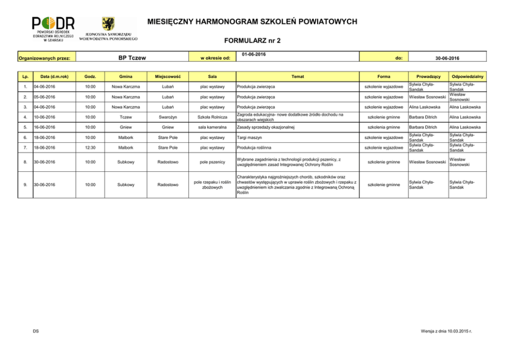MIESIĘCZNY HARMONOGRAM SZKOLEŃ POWIATOWYCH FORMULARZ nr 2 BP Tczew Organizowanych przez: Lp. Data (d.m.rok) Godz. Gmina w okresie od: Miejscowość 01-06-2016 Sala do: Temat Forma 1. 04-06-2016 10:00 Nowa Karczma Lubań plac wystawy Produkcja zwierzęca szkolenie wyjazdowe 2. 05-06-2016 10:00 Nowa Karczma Lubań plac wystawy Produkcja zwierzęca szkolenie wyjazdowe 3. 04-06-2016 10:00 Nowa Karczma Lubań plac wystawy Produkcja zwierzęca szkolenie wyjazdowe 4. 10-06-2016 10:00 Tczew Swarożyn Szkoła Rolnicza Zagroda edukacyjna- nowe dodatkowe źródło dochodu na obszarach wiejskich 5. 16-06-2016 10:00 Gniew Gniew sala kameralna Zasady sprzedaży okazjonalnej 30-06-2016 Prowadzący Odpowiedzialny Sylwia ChyłaSandak Sylwia ChyłaSandak Wiesław Wiesław Sosnowski Sosnowski Alina Laskowska Alina Laskowska szkolenie gminne Barbara Ditrich Alina Laskowska szkolenia gminne Barbara Ditrich Alina Laskowska Sylwia ChyłaSandak Sylwia ChyłaSandak Sylwia ChyłaSandak Sylwia ChyłaSandak 6. 18-06-2016 10:00 Malbork Stare Pole plac wystawy Targi maszyn szkolenie wyjazdowe 7. 18-06-2016 12:30 Malbork Stare Pole plac wystawy Produkcja roślinna szkolenie wyjazdowe 8. 30-06-2016 10:00 Subkowy Radostowo pole pszenicy Wybrane zagadnienia z technologii produkcji pszenicy, z uwzględnieniem zasad Integrowanej Ochrony Roślin szkolenie gminne Wiesław Sosnowski Wiesław Sosnowski 9. 30-06-2016 10:00 Subkowy Radostowo pole rzepaku i roślin zbożowych Charakterystyka najgroźniejszych chorób, szkodników oraz chwastów występujących w uprawie roślin zbożowych i rzepaku z uwzględnieniem ich zwalczania zgodnie z Integrowaną Ochroną Roślin szkolenie gminne Sylwia ChyłaSandak Sylwia ChyłaSandak DS Wersja z dnia 10.03.2015 r.