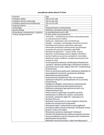specyfikacja tablicy iBoard 57 DUAL Parametr Przekątna tablicy Przekątna obszaru roboczego Przekątna powierzchni projekcyjnej Proporcje obrazu Technologia Sposób obsługi Komunikacja z komputerem / zasilanie Funkcje oprogramowania Opis 146 cm (57 cali) 133 cm (52 cali) 133 cm (52 cali) 4:3 Pozycjonowania w podczerwieni Dotykowy: dowolnym piórem lub palcem Za pośrednictwem portu USB W pełni polska wersja językowa. Tryb DUAL – możliwość pracy dwóch osób jednocześnie na całej powierzchni tablicy. Podręczne, edytowalne menu kontekstowe. Zdrapka – narzędzie umożliwiające tworzenie ćwiczeń interaktywnych poprzez zasłanianie wybranych elementów prezentacji cyfrową farbą i jej późniejsze usuwanie przy pomocy specjalnej szpachelki. Narzędzia do geometrii – cyrkiel, linijka, ekierka, kątomierz umożliwiające pomiar długości odcinków i wartości kątów przy pomocy specjalnych znaczników. Możliwość zmiany wielkości narzędzi pomiarowych bez zmiany ich skali. Przechwytywanie obrazów umożliwiające błyskawiczne „wycięcie” elementu graficznego o dowolnym kształcie z zawartości strony www, zdjęcia, filmu itd. i wstawienie go do prezentacji. Praca na warstwach graficznych, blokowanie obiektów na poszczególnych warstwach, grupowanie obiektów, definiowanie przeźroczystości Rozpoznawanie pojedynczych liter oraz wyrazów napisanych odręcznie i przekształcenie ich na czcionkę komputerową. Inteligentny długopis: automatyczne rozpoznawanie odręcznie narysowanych figur geometrycznych. Możliwość wstawiania figur geometrycznych oraz trójwymiarowych brył. Kamera ekranu rejestrująca wszystkie czynności wykonywane na tablicy tzn. pisanie, zaznaczanie, rysowanie, wstawianie zdjęć itd. i zapisująca je w formacie filmu avi. Możliwość umieszczenia w menu programu własnych skrótów do zewnętrznych programów. Wstawianie tabel i umieszczanie w poszczególnych komórkach tabeli wartości liczbowych. Możliwość zmiany grubości i koloru linii tabeli. Wstawianie wykresów słupkowych i kołowych Interfejs HID dzięki któremu tablica jest gotowa do pracy zaraz po podłączeniu jej do komputera bez instalowania jakichkolwiek sterowników. Możliwość tworzenia quizów i zadań interaktywnych z Standardowe wyposażenie funkcją sprawdzania poprawności odpowiedzi Łatwe wstawianie plików graficznych do prezentacji poprzez mechanizm przeciągnij i upuść bezpośrednio z okna eksploratora plików lub z pulpitu. Porządkowanie numerów stron prezentacji poprzez mechanizm przeciągnij i upuść. Interaktywna galeria narzędzi fizycznych do tworzenia doświadczeń. Funkcja Wymowa umożliwiająca wypowiadanie słów wstawianych w polach tekstowych za pośrednictwem syntezatora mowy. Łatwe wstawianie do prezentacji obrazu rejestrowanego przez dowolny wizualizer podłączony do portu USB komputera. Dodawanie odręcznych adnotacji w dokumentach pptx, docx, xlsx z możliwością późniejszej ich edycji lub usunięcia w programach PowerPoint, Excel, Word. Nieograniczona czasowo aktualizacja oprogramowania. 3 pióra w kolorach: czerwonym, niebieskim i czarnym oraz wymazywacz umieszczone w uchwytach magnetycznych inteligentnej ramy, rozpoznającej kolor podniesionego pióra lub funkcję wymazywania. Kabel USB A-A długości 5 m Przedłużacz kabla USB długości 5 m Instrukcja obsługi w języku polskim Multimedialne szkolenie w formie filmu z komentarzem lektora Uchwyt montażowy ścienny