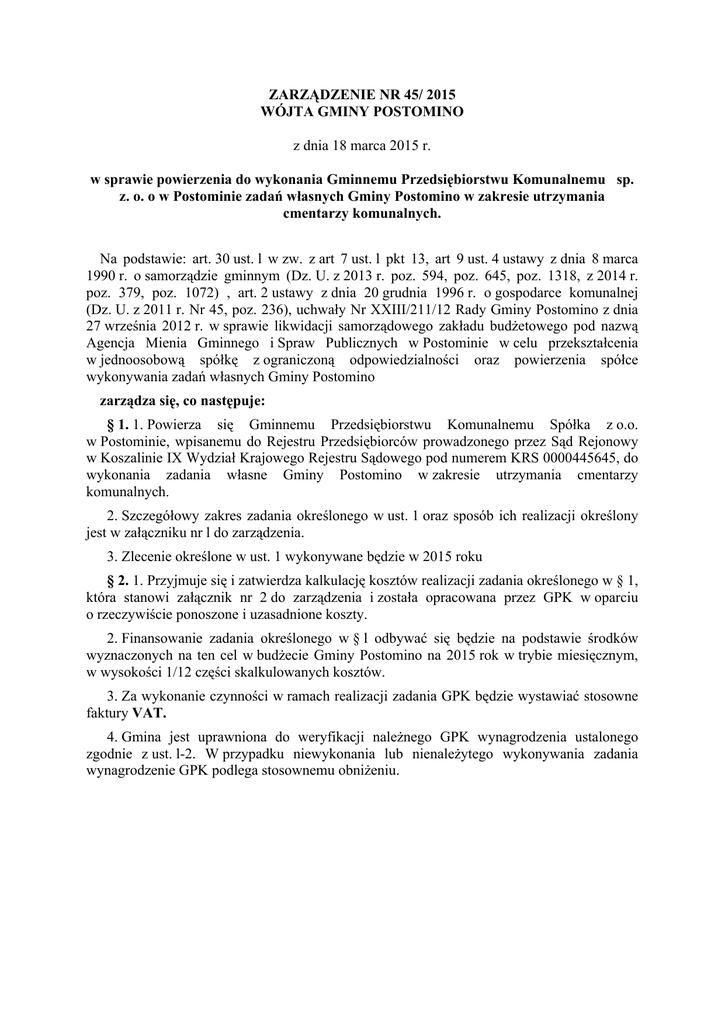 ZARZĄDZENIE NR 45/ 2015 WÓJTA GMINY POSTOMINO z dnia 18 marca 2015 r. w sprawie powierzenia do wykonania Gminnemu Przedsiębiorstwu Komunalnemu sp. z. o. o w Postominie zadań własnych Gminy Postomino w zakresie utrzymania cmentarzy komunalnych. Na podstawie: art. 30 ust. l w zw. z art 7 ust. l pkt 13, art 9 ust. 4 ustawy z dnia 8 marca 1990 r. o samorządzie gminnym (Dz. U. z 2013 r. poz. 594, poz. 645, poz. 1318, z 2014 r. poz. 379, poz. 1072) , art. 2 ustawy z dnia 20 grudnia 1996 r. o gospodarce komunalnej (Dz. U. z 2011 r. Nr 45, poz. 236), uchwały Nr XXIII/211/12 Rady Gminy Postomino z dnia 27 września 2012 r. w sprawie likwidacji samorządowego zakładu budżetowego pod nazwą Agencja Mienia Gminnego i Spraw Publicznych w Postominie w celu przekształcenia w jednoosobową spółkę z ograniczoną odpowiedzialności oraz powierzenia spółce wykonywania zadań własnych Gminy Postomino zarządza się, co następuje: § 1. 1. Powierza się Gminnemu Przedsiębiorstwu Komunalnemu Spółka z o.o. w Postominie, wpisanemu do Rejestru Przedsiębiorców prowadzonego przez Sąd Rejonowy w Koszalinie IX Wydział Krajowego Rejestru Sądowego pod numerem KRS 0000445645, do wykonania zadania własne Gminy Postomino w zakresie utrzymania cmentarzy komunalnych. 2. Szczegółowy zakres zadania określonego w ust. 1 oraz sposób ich realizacji określony jest w załączniku nr l do zarządzenia. 3. Zlecenie określone w ust. 1 wykonywane będzie w 2015 roku § 2. 1. Przyjmuje się i zatwierdza kalkulację kosztów realizacji zadania określonego w § 1, która stanowi załącznik nr 2 do zarządzenia i została opracowana przez GPK w oparciu o rzeczywiście ponoszone i uzasadnione koszty. 2. Finansowanie zadania określonego w § l odbywać się będzie na podstawie środków wyznaczonych na ten cel w budżecie Gminy Postomino na 2015 rok w trybie miesięcznym, w wysokości 1/12 części skalkulowanych kosztów. 3. Za wykonanie czynności w ramach realizacji zadania GPK będzie wystawiać stosowne faktury VAT. 4. Gmina jest uprawniona do weryfikacji należnego GPK wynagrodzenia ustalonego zgodnie z ust. l-2. W przypadku niewykonania lub nienależytego wykonywania zadania wynagrodzenie GPK podlega stosownemu obniżeniu. § 3. Zarządzenie wchodzi w życie z dniem podpisania z mocą obowiązującą od dnia 1 stycznia 2015 roku. Wójt Gminy Postomino Janusz Bojkowski Załącznik Nr 1 do Zarządzenia Nr 45/ 2015 Wójta Gminy Postomino z dnia 18 marca 2015 r. 1. Zlecenie obejmuje wykonywanie zadań własnych Gminy Postomino w zakresie utrzymania następujących cmentarzy komunalnych: Lp. 1 2 3 4 5 6 7 8 9 Miejscowość Marszewo Łącko Postomino Pałowo Pieńkowo Staniewice Rusinowo Pieszcz Chudaczewo Nr działki Powierzchnia w ha Wyposażenie w media, obiekty 26 0,51 woda 185 2,32 kaplica, energia elektryczna cz. 331 0,57 kaplica, energia elektryczna, woda 120 0,49 woda 151 0,37 kaplica, energia elektryczna 366 0,31 woda 127/1 0,46 brak cz. 247 0,495 kaplica , energia elektryczna. 46 0,267 kaplica, energia elektryczna, woda Łączna powierzchnia cmentarzy - 5,801 ha 2. Zobowiązany przyjmuje obowiązki dotyczące utrzymania porządku i czystości na terenie cmentarzy oraz obiektów i urządzeń cmentarnych jak kaplice, ogrodzenia, drogi, a w szczególności: a) zbieranie zanieczyszczeń z terenu cmentarzy, b) zamiatanie alejek na terenie cmentarzy, c) likwidację „dzikich” wysypisk na terenie cmentarzy, d) prowadzenie selektywnej zbiórki odpadów oraz zabezpieczenie dostatecznej ilości pojemników na odpady stałe i utrzymanie ich w estetycznym stanie, e) systematyczny wywóz odpadów stałych z terenu cmentarzy, f) utrzymanie porządku i czystości w kaplicach na cmentarzach o których mowa w ust. 1, g) bieżące utrzymywanie i konserwacja wyposażenia cmentarzy (ogrodzeń, instalacji, naprawa i malowanie koszy, tablic ogłoszeniowych itp.), h) umieszczanie przy każdym głównym wejściu na administrowanych cmentarzach następującej informacji: adresu biura zarządcy wraz z telefonem kontaktowym, informacji o aktualnych opłatach za korzystanie z cmentarzy komunalnych, regulaminu korzystania z usług cmentarnych, i) oczyszczanie ze śniegu i posypywanie piaskiem alejek, j) ustawianie i utrzymywanie w czystości i porządku toalet przenośnych przy cmentarzach w okresie święta Wszystkich Świętych. 3. Zobowiązany przyjmuje obowiązki dotyczące utrzymania i ochrony zieleni cmentarnej, a w szczególności: a) koszenia trawy i chwastów, grabienia liści i trawy,, b) cięć pielęgnacyjnych i sanitarnych drzew i krzewów, c) usuwanie suchych drzew i krzewów. 4. Zobowiązany przyjmuje obowiązki pogrzebowym w celach pochówkowych. dotyczące 5. Zobowiązany przyjmuje obowiązki z administrowaniem cmentarzy a w szczególności: udostępniania prowadzenia kaplic spraw firmom związanych a) prowadzenie racjonalnej gospodarki miejscami grzebalnymi oraz zarządzanymi obiektami, oraz wykonywania obsługi administracyjnej cmentarzy - przyjmowania interesantów i przechowywania dokumentacji cmentarnej, b) prowadzenie ksiąg cmentarnych systemie tradycyjnym i systemie zgodnie z rozporządzeniem Ministra Spraw Wewnętrznych i Administracji z dnia 1 sierpnia 2001 r. w sprawie sposobu prowadzenia ewidencji grobów (Dz. U. Nr 90 poz. 1013 ze zm.), c) systematyczne prowadzenie w szczególności: systemem tradycyjnym dokumentacji cmentarnej, - rejestru miejsc rezerwowych, - aktualizacji planu zagospodarowania i wykorzystywania miejsc na cmentarzu, d) przyjmowanie interwencji od dysponentów grobów dotyczących spraw cmentarzy i załatwianie tych spraw, e) wystawianie w imieniu Gminy Postomino na podstawie udzielonego upoważnienia faktur VAT, faktur korygujących VAT i ich duplikatów za korzystanie z cmentarzy komunalnych wg cennika określonego Zarządzeniem Wójta Gminy Postomino oraz przyjmowanie na kwitariusz przychodowy opłat z tytułu jak wyżej i przekazywanie ich na konto Urzędu Gminy w Pos