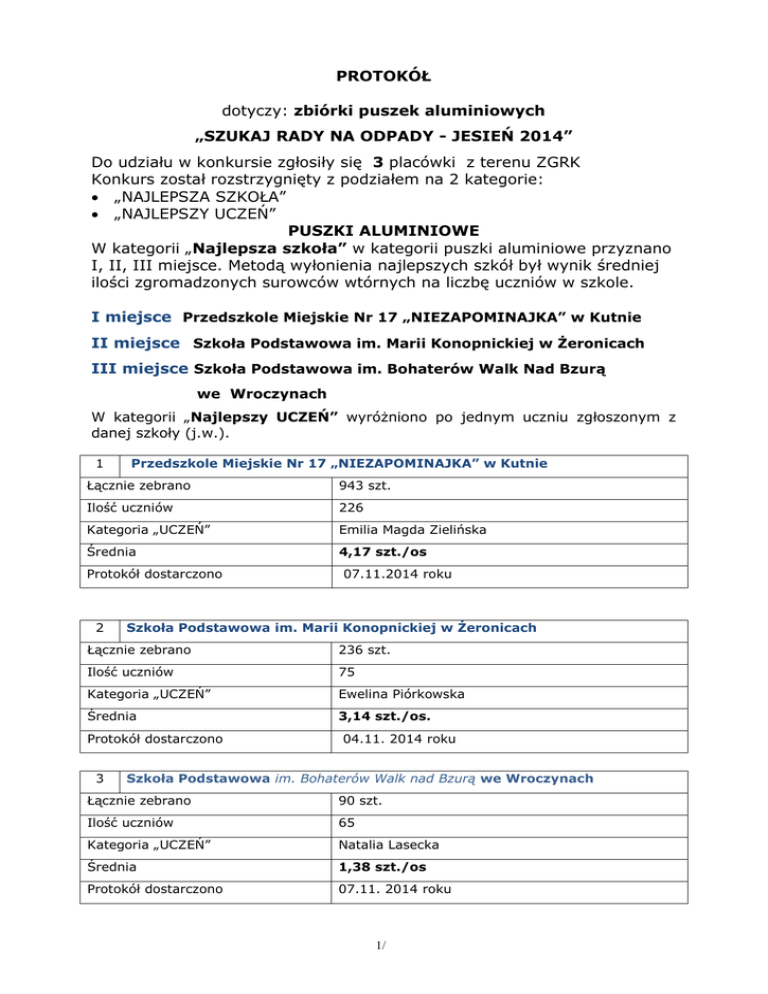 PROTOKÓŁ dotyczy: zbiórki puszek aluminiowych „SZUKAJ RADY NA ODPADY - JESIEŃ 2014” Do udziału w konkursie zgłosiły się 3 placówki z terenu ZGRK Konkurs został rozstrzygnięty z podziałem na 2 kategorie: „NAJLEPSZA SZKOŁA” „NAJLEPSZY UCZEŃ” PUSZKI ALUMINIOWE W kategorii „Najlepsza szkoła” w kategorii puszki aluminiowe przyznano I, II, III miejsce. Metodą wyłonienia najlepszych szkół był wynik średniej ilości zgromadzonych surowców wtórnych na liczbę uczniów w szkole. I miejsce Przedszkole Miejskie Nr 17 „NIEZAPOMINAJKA” w Kutnie II miejsce Szkoła Podstawowa im. Marii Konopnickiej w Żeronicach III miejsce Szkoła Podstawowa im. Bohaterów Walk Nad Bzurą we Wroczynach W kategorii „Najlepszy UCZEŃ” wyróżniono po jednym uczniu zgłoszonym z danej szkoły (j.w.). 1 Przedszkole Miejskie Nr 17 „NIEZAPOMINAJKA” w Kutnie Łącznie zebrano 943 szt. Ilość uczniów 226 Kategoria „UCZEŃ” Emilia Magda Zielińska Średnia 4,17 szt./os Protokół dostarczono 2 07.11.2014 roku Szkoła Podstawowa im. Marii Konopnickiej w Żeronicach Łącznie zebrano 236 szt. Ilość uczniów 75 Kategoria „UCZEŃ” Ewelina Piórkowska Średnia 3,14 szt./os. Protokół dostarczono 3 04.11. 2014 roku Szkoła Podstawowa im. Bohaterów Walk nad Bzurą we Wroczynach Łącznie zebrano 90 szt. Ilość uczniów 65 Kategoria „UCZEŃ” Natalia Lasecka Średnia 1,38 szt./os Protokół dostarczono 07.11. 2014 roku 1/ 2 Dnia 17 grudnia 2014 r. w Kutnowskim Domu Kultury odbyło się uroczyste wręczenie nagród laureatom konkursu. Ogółem uczniowie zebrali ok. 25,38 kg puszek aluminiowych. Zbiórka objęła ok. 366 uczniów. Średnia ilość zebranego aluminium – ok. 0,069 kg/ucznia. Biorąc pod uwagę, iż na 1 kg wchodzi 50 szt. puszek zebrano łącznie 1 269 szt. puszek aluminiowych co daje 3,46 szt./ucznia. 2/ 2