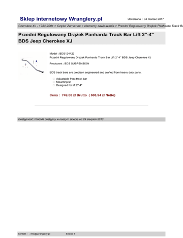 Sklep internetowy Wranglery.pl Utworzono : 04 marzec 2017 Cherokee XJ - 1984-2001 > Części Zamienne > elementy zawieszenia > Przedni Regulowany Drążek Panharda Track Ba Przedni Regulowany Drążek Panharda Track Bar Lift 2"-4" BDS Jeep Cherokee XJ Model : BDS124423 Przedni Regulowany Drążek Panharda Track Bar Lift 2"-4" BDS Jeep Cherokee XJ Producent : BDS SUSPENSION BDS track bars are precison engineered and crafted from heavy duty parts. � Adjustable front track bar � Mounting kit � Designed for lift 2"-4" Cena : 749,00 zł Brutto ( 608,94 zł Netto) Dostępność: Produkt dostępny w naszym sklepie od 29 sierpień 2013 kontakt : - [email protected] Strona 1
