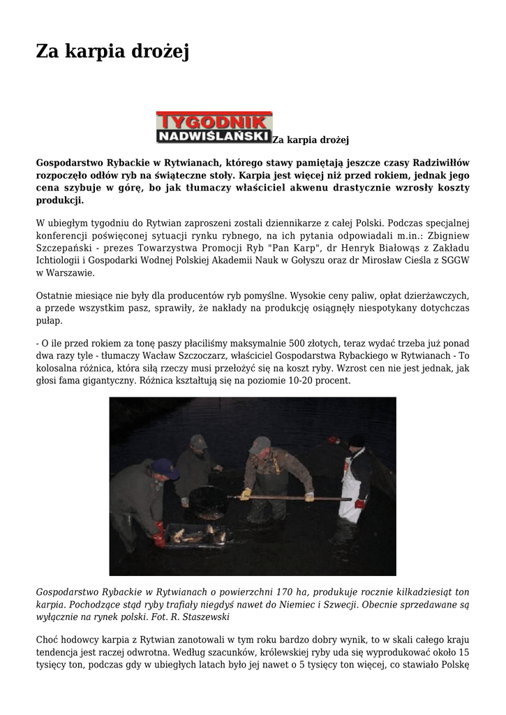 Za karpia drożej Za karpia drożej Gospodarstwo Rybackie w Rytwianach, którego stawy pamiętają jeszcze czasy Radziwiłłów rozpoczęło odłów ryb na świąteczne stoły. Karpia jest więcej niż przed rokiem, jednak jego cena szybuje w górę, bo jak tłumaczy właściciel akwenu drastycznie wzrosły koszty produkcji. W ubiegłym tygodniu do Rytwian zaproszeni zostali dziennikarze z całej Polski. Podczas specjalnej konferencji poświęconej sytuacji rynku rybnego, na ich pytania odpowiadali m.in.: Zbigniew Szczepański - prezes Towarzystwa Promocji Ryb "Pan Karp", dr Henryk Białowąs z Zakładu Ichtiologii i Gospodarki Wodnej Polskiej Akademii Nauk w Gołyszu oraz dr Mirosław Cieśla z SGGW w Warszawie. Ostatnie miesiące nie były dla producentów ryb pomyślne. Wysokie ceny paliw, opłat dzierżawczych, a przede wszystkim pasz, sprawiły, że nakłady na produkcję osiągnęły niespotykany dotychczas pułap. - O ile przed rokiem za tonę paszy płaciliśmy maksymalnie 500 złotych, teraz wydać trzeba już ponad dwa razy tyle - tłumaczy Wacław Szczoczarz, właściciel Gospodarstwa Rybackiego w Rytwianach - To kolosalna różnica, która siłą rzeczy musi przełożyć się na koszt ryby. Wzrost cen nie jest jednak, jak głosi fama gigantyczny. Różnica kształtują się na poziomie 10-20 procent. Gospodarstwo Rybackie w Rytwianach o powierzchni 170 ha, produkuje rocznie kilkadziesiąt ton karpia. Pochodzące stąd ryby trafiały niegdyś nawet do Niemiec i Szwecji. Obecnie sprzedawane są wyłącznie na rynek polski. Fot. R. Staszewski Choć hodowcy karpia z Rytwian zanotowali w tym roku bardzo dobry wynik, to w skali całego kraju tendencja jest raczej odwrotna. Według szacunków, królewskiej ryby uda się wyprodukować około 15 tysięcy ton, podczas gdy w ubiegłych latach było jej nawet o 5 tysięcy ton więcej, co stawiało Polskę na pierwszym miejscu w Europie - jako zdecydowanego karpiowego dominatora. Za nami plasowali się Czesi i Niemcy. Jako przyczynę tonażowego spadku produkcji karpia specjaliści wymieniają kilka czynników, które nałożyły się na siebie. Po trosze zawiniły problemy z pozyskaniem materiału zarybieniowego, a także aura. Deszczowy i zimny początek lata sprawił, że ryby nie rosły zbyt szybko. Karpie hodowane w systemie trzyletnim osiągnęły średnio wagę 1,5 kilograma. Nie da się wykluczyć, że część hodowców z powodów finansowych oszczędzała na karmie, co również przełożyło się na ogólny bilans produkcji. Konsumentów zelektryzowała ostatnio informacja o wyniszczającej chorobie ryb, dziesiątkującej jakoby hodowlane stawy, również w regionie świętokrzyskim. Chodzi o KHV - wirusa przypominającego ludzką opryszczkę i atakującego wyłącznie karpie. Wirus nie przenosi się na człowieka, ale w gospodarstwach rybackich może wywoływać ogromne szkody, powodując nawet stuprocentowe śnięcie obsady stawów. W Polsce choroba po raz pierwszy stwierdzona została w 2004 roku i od tamtej pory temat ten regularnie powraca, zwłaszcza w okresie przedświątecznym. Zdaniem Zbigniewa Szczepańskiego informacje na temat strat spowodowanych KHV są mocno przesadzone. - Gdzieniegdzie wirus rzeczywiście daje się we znaki, bo trudno z nim walczyć. Zaatakowany chorobą zbiornik trzeba osuszyć i odkazić, odławiając wcześniej wszystkie karpie - zaznacza prezes Towarzystwa Promocji Ryb - Straty spowodowane chorobą w naszym kraju mają jednak charakter marginalny. Z danym Państwowego Instytutu Weterynaryjnego wynika, że generalnie ryby chorują obecnie rzadziej, niż w latach minionych. Co do KHV trzeba przede wszystkim podkreślić mocno, że nie stanowi on żadnego zagrożenia dla ludzi. Jak twierdzi Zbigniew Szczepański dużo większym niż wirus problemem, spędzającym sen z oczu producentom są kormorany i różne drapieżniki. Z niektórych wyliczeń wynika, że ich łupem rokrocznie pada nawet ponad 10 tysięcy ton ryb hodowlanych. Rok temu, tuż przed Wigilią kilogram karpia w sklepie można było kupić za 10-11 złotych. Tym razem trzeba przygotować się na nieco większe wydatki. Obecnie cena królewskiej ryby oscyluje w przedziale 14-17 złotych, jednak duże sieci handlowe niebawem przygotują zapewne świąteczne promocje. Niektóre z nich bazować będą na karpiu z importu i w tym przypadku trudno prognozować poziomy cenowe. Źródło: Tygodnik Nadwiślanski nr 48(1594) z dn 1.12.2011r., Rafał Staszewski. Gmina Rytwiany - www.rytwiany.com.pl