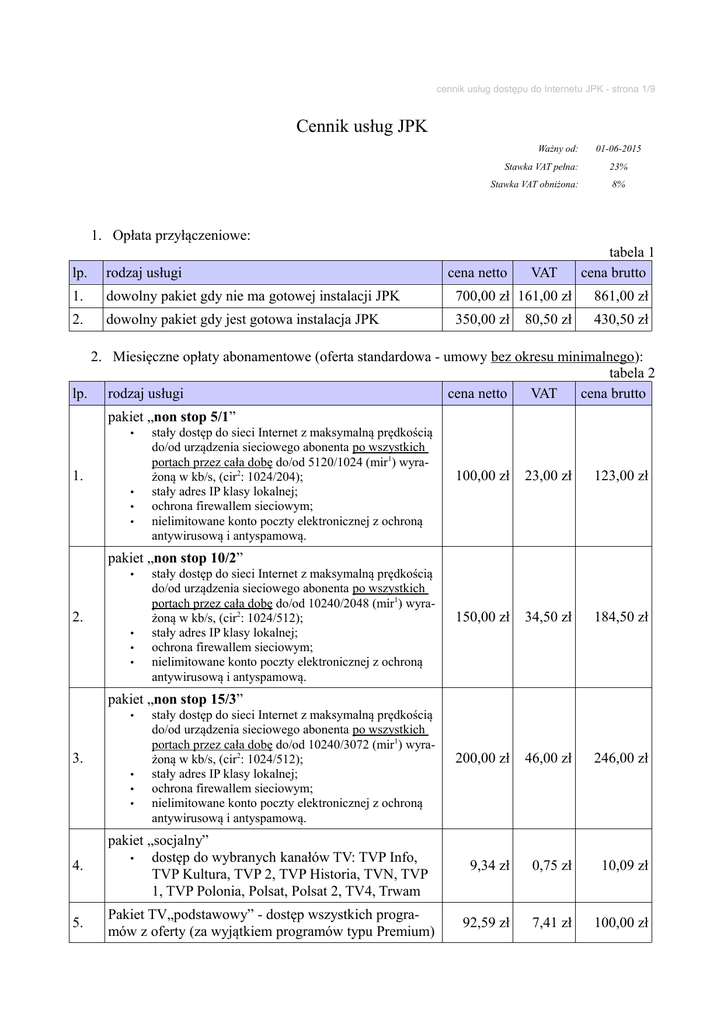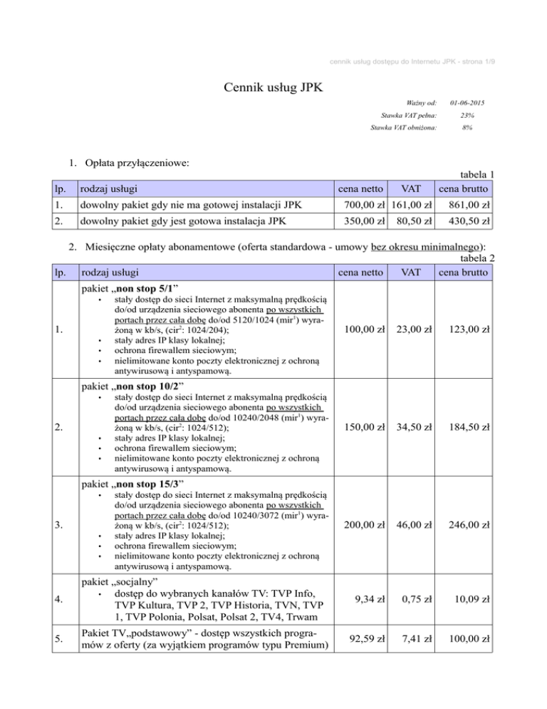 cennik usług dostępu do Internetu JPK - strona 1/9 Cennik usług JPK Ważny od: 01-06-2015 Stawka VAT pełna: 23% Stawka VAT obniżona: 8% 1. Opłata przyłączeniowe: cena netto VAT tabela 1 cena brutto lp. rodzaj usługi 1. dowolny pakiet gdy nie ma gotowej instalacji JPK 700,00 zł 161,00 zł 861,00 zł 2. dowolny pakiet gdy jest gotowa instalacja JPK 350,00 zł 430,50 zł 80,50 zł 2. Miesięczne opłaty abonamentowe (oferta standardowa - umowy bez okresu minimalnego): tabela 2 lp. rodzaj usługi cena netto VAT cena brutto pakiet „non stop 5/1” • 1. stały dostęp do sieci Internet z maksymalną prędkością do/od urządzenia sieciowego abonenta po wszystkich portach przez cała dobę do/od 5120/1024 (mir1) wyrażoną w kb/s, (cir2: 1024/204); stały adres IP klasy lokalnej; ochrona firewallem sieciowym; nielimitowane konto poczty elektronicznej z ochroną antywirusową i antyspamową. 100,00 zł 23,00 zł 123,00 zł 150,00 zł 34,50 zł 184,50 zł 200,00 zł 46,00 zł 246,00 zł 4. pakiet „socjalny” • dostęp do wybranych kanałów TV: TVP Info, TVP Kultura, TVP 2, TVP Historia, TVN, TVP 1, TVP Polonia, Polsat, Polsat 2, TV4, Trwam 9,34 zł 0,75 zł 10,09 zł 5. Pakiet TV„podstawowy” - dostęp wszystkich programów z oferty (za wyjątkiem programów typu Premium) 92,59 zł 7,41 zł 100,00 zł • • • pakiet „non stop 10/2” • 2. • • • stały dostęp do sieci Internet z maksymalną prędkością do/od urządzenia sieciowego abonenta po wszystkich portach przez cała dobę do/od 10240/2048 (mir1) wyrażoną w kb/s, (cir2: 1024/512); stały adres IP klasy lokalnej; ochrona firewallem sieciowym; nielimitowane konto poczty elektronicznej z ochroną antywirusową i antyspamową. pakiet „non stop 15/3” • 3. • • • stały dostęp do sieci Internet z maksymalną prędkością do/od urządzenia sieciowego abonenta po wszystkich portach przez cała dobę do/od 10240/3072 (mir1) wyrażoną w kb/s, (cir2: 1024/512); stały adres IP klasy lokalnej; ochrona firewallem sieciowym; nielimitowane konto poczty elektronicznej z ochroną antywirusową i antyspamową. cennik usług dostępu do Internetu JPK - strona 2/9 6. dzierżawa zewnętrznego IP 7. zwiększenie upload'u dla pakietów non stop o 1024 kb/s • zawsze zaokrąglane w dół do pełnych wielokrotności 1024 kb (np.: 256+1024=>1024); • nie więcej niż połowa download'u (np.: dla pakietu „non stop 10” maksymalny upload to 5120 kb/s); przypisanie klientowi IP z klasy zewnętrznej 10,00 zł 2,30 zł 12,30 zł 15,00 zł 3,45 zł 18,45 zł 1) MIR: (ang.: Maximal Information Rate) maksymalna przepływność, 2) CIR: (ang.: Committed Information Rate) przepływność gwarantowana, 3) Premium- pogramy, które wymagają dodatkowych opłat, lista i wysokość opłat są umieszczone w osobnym cenniku 3. Okresowe (inne niż miesięczne) opłaty abonamentowe: lp. rodzaj usługi cena netto VAT tabela 3 cena brutto upust brutto dowolny abonament opłacony kwartalnie • 1. • • upust 3% udzielany od miesięcznej kwoty abonamentu pomnożonej przez 3; wymaga wcześniejszego zamówienia wzór zamówienia dostępny na stronach jpk.pl; przykład dla: pakiet „non stop 5” (tabela 2 pozycja 1) 291,00 zł ** Niepra** Nieprawidłowe 66,93 zł widłowe wywyrażenie rażenie ** ** dowolny abonament opłacony rocznie • 2. • • 3. 4. upust 7% udzielany od miesięcznej kwoty abonamentu pomnożonej przez 12; wymaga wcześniejszego zamówienia wzór zamówienia dostępny na stronach jpk.pl; przykład dla: pakiet „non stop 5” (tabela 2 pozycja 1) dzierżawa zewnętrznego IP • opłata roczna przekierowanie 5 portów • opłata roczna 1 116,00 zł 256,68 zł 1 372,68 zł 100,00 zł 23,00 zł 103,32 zł 123,00 zł 23,40 zł 1 000,00 zł 230,00 zł 1 230,00 zł 244,00 zł 4. Miesięczne opłaty abonamentowe – ceny promocyjne – (umowy z okresem minimalnym trwania umowy – oferta związana z miesięczną ulga dla abonenta). Ceny są dostępne w odpowiednich regulaminach promocji. 5. Miesięczne opłaty abonamentowe (oferta standardowa - umowy bez okresu minimalnego pakiety wycofane ze sprzedaży oraz pakiety pozostałe po przejęciu innych firmy telekomunikacyjnych): tabela 4 lp. rodzaj usługi cena netto VAT cena brutto 1. pakiet „w3power 1” • stały dostęp do sieci Internet z maksymalną prędkością 140,00 zł 32,20 zł 172,20 zł cennik usług dostępu do Internetu JPK - strona 3/9 • • • • 2. pakiet „w3power 1,5” • • • • • 3. • • • • 160,00 zł 36,80 zł 196,80 zł stały dostęp do sieci Internet z maksymalną prędkością do/od urządzenia sieciowego abonenta wyłącznie dla ruchu www (ruch po porcie 80) do 2048/256 (mir1) wyrażoną w kb/s; stały dostęp do sieci Internet z maksymalną prędkością do/od urządzenia sieciowego abonenta dla pozostałego ruchu inny niż www (ruch po pozostałych portach) do 1024/256 wyrażoną w kb/s; stały adres IP klasy lokalnej; ochrona firewallem sieciowym; nielimitowane konto poczty elektronicznej z ochroną antywirusową i antyspamową. 176,00 zł 40,48 zł 216,48 zł 220,00 zł 50,60 zł 270,60 zł 330,00 zł 75,90 zł 405,90 zł pakiet „w3power 3” • • • • • 5. stały dostęp do sieci Internet z maksymalną prędkością do/od urządzenia sieciowego abonenta wyłącznie dla ruchu www (ruch po porcie 80) do 1536/160 (mir1) wyrażoną w kb/s; stały dostęp do sieci Internet z maksymalną prędkością do/od urządzenia sieciowego abonenta dla pozostałego ruchu inny niż www (ruch po pozostałych portach) do 448/112 wyrażoną w kb/s; stały adres IP klasy lokalnej; ochrona firewallem sieciowym; nielimitowane konto poczty elektronicznej z ochroną antywirusową i antyspamową. pakiet „w3power 2” • 4. do/od urządzenia sieciowego abonenta wyłącznie dla ruchu www (ruch po porcie 80) do 1024/160 (mir1) wyrażoną w kb/s; stały dostęp do sieci Internet z maksymalną prędkością do/od urządzenia 