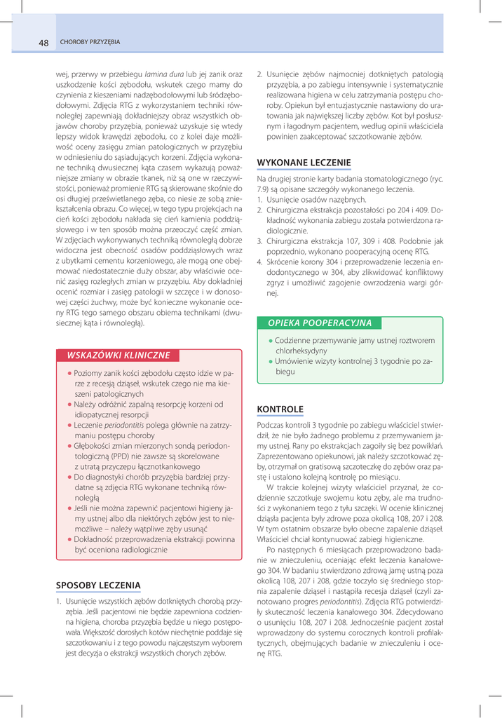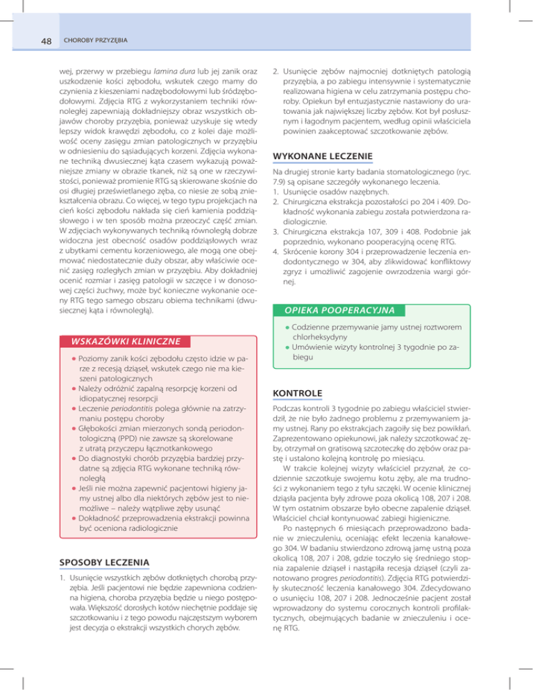 48 CHOROBY PRZYZĘBIA wej, przerwy w przebiegu lamina dura lub jej zanik oraz uszkodzenie kości zębodołu, wskutek czego mamy do czynienia z kieszeniami nadzębodołowymi lub śródzębodołowymi. Zdjęcia RTG z wykorzystaniem techniki równoległej zapewniają dokładniejszy obraz wszystkich objawów choroby przyzębia, ponieważ uzyskuje się wtedy lepszy widok krawędzi zębodołu, co z kolei daje możliwość oceny zasięgu zmian patologicznych w przyzębiu w odniesieniu do sąsiadujących korzeni. Zdjęcia wykonane techniką dwusiecznej kąta czasem wykazują poważniejsze zmiany w obrazie tkanek, niż są one w rzeczywistości, ponieważ promienie RTG są skierowane skośnie do osi długiej prześwietlanego zęba, co niesie ze sobą zniekształcenia obrazu. Co więcej, w tego typu projekcjach na cień kości zębodołu nakłada się cień kamienia poddziąsłowego i w ten sposób można przeoczyć część zmian. W zdjęciach wykonywanych techniką równoległą dobrze widoczna jest obecność osadów poddziąsłowych wraz z ubytkami cementu korzeniowego, ale mogą one obejmować niedostatecznie duży obszar, aby właściwie ocenić zasięg rozległych zmian w przyzębiu. Aby dokładniej ocenić rozmiar i zasięg patologii w szczęce i w donosowej części żuchwy, może być konieczne wykonanie oceny RTG tego samego obszaru obiema technikami (dwusiecznej kąta i równoległą). 2. Usunięcie zębów najmocniej dotkniętych patologią przyzębia, a po zabiegu intensywnie i systematycznie realizowana higiena w celu zatrzymania postępu choroby. Opiekun był entuzjastycznie nastawiony do uratowania jak największej liczby zębów. Kot był posłusznym i łagodnym pacjentem, według opinii właściciela powinien zaakceptować szczotkowanie zębów. Wykonane leczenie Na drugiej stronie karty badania stomatologicznego (ryc. 7.9) są opisane szczegóły wykonanego leczenia. 1. Usunięcie osadów nazębnych. 2. Chirurgiczna ekstrakcja pozostałości po 204 i 409. Dokładność wykonania zabiegu została potwierdzona radiologicznie. 3. Chirurgiczna ekstrakcja 107, 309 i 408. Podobnie jak poprzednio, wykonano pooperacyjną ocenę RTG. 4. Skrócenie korony 304 i przeprowadzenie leczenia endodontycznego w 304, aby zlikwidować konfliktowy zgryz i umożliwić zagojenie owrzodzenia wargi górnej. opieka pooperacyjna Codzienne przemywanie jamy ustnej roztworem chlorheksydyny zz Umówienie wizyty kontrolnej 3 tygodnie po zabiegu zz wskazówki kliniczne Poziomy zanik kości zębodołu często idzie w parze z recesją dziąseł, wskutek czego nie ma kieszeni patologicznych zz Należy odróżnić zapalną resorpcję korzeni od idiopatycznej resorpcji zz Leczenie periodontitis polega głównie na zatrzymaniu postępu choroby zz Głębokości zmian mierzonych sondą periodontologiczną (PPD) nie zawsze są skorelowane z utratą przyczepu łącznotkankowego zz Do diagnostyki chorób przyzębia bardziej przydatne są zdjęcia RTG wykonane techniką równoległą zz Jeśli nie można zapewnić pacjentowi higieny jamy ustnej albo dla niektórych zębów jest to niemożliwe – należy wątpliwe zęby usunąć zz Dokładność przeprowadzenia ekstrakcji powinna być oceniona radiologicznie zz SPOSOBY LECZENIA 1. Usunięcie wszystkich zębów dotkniętych chorobą przyzębia. Jeśli pacjentowi nie będzie zapewniona codzienna higiena, choroba przyzębia będzie u niego postępowała. Większość dorosłych kotów niechętnie poddaje się szczotkowaniu i z tego powodu najczęstszym wyborem jest decyzja o ekstrakcji wszystkich chorych zębów. Kontrole Podczas kontroli 3 tygodnie po zabiegu właściciel stwierdził, że nie było żadnego problemu z przemywaniem jamy ustnej. Rany po ekstrakcjach zagoiły się bez powikłań. Zaprezentowano opiekunowi, jak należy szczotkować zęby, otrzymał on gratisową szczoteczkę do zębów oraz pastę i ustalono kolejną kontrolę po miesiącu. W trakcie kolejnej wizyty właściciel przyznał, że codziennie szczotkuje swojemu kotu zęby, ale ma trudności z wykonaniem tego z tyłu szczęki. W ocenie klinicznej dziąsła pacjenta były zdrowe poza okolicą 108, 207 i 208. W tym ostatnim obszarze było obecne zapalenie dziąseł. Właściciel chciał kontynuować zabiegi higieniczne. Po następnych 6 miesiącach przeprowadzono badanie w znieczuleniu, oceniając efekt leczenia kanałowego 304. W badaniu stwierdzono zdrową jamę ustną poza okolicą 108, 207 i 208, gdzie toczyło się średniego stopnia zapalenie dziąseł i nastąpiła recesja dziąseł (czyli zanotowano progres periodontitis). Zdjęcia RTG potwierdziły skuteczność leczenia kanałowego 304. Zdecydowano o usunięciu 108, 207 i 208. Jednocześnie pacjent został wprowadzony do systemu corocznych kontroli profilaktycznych, obejmujących badanie w znieczuleniu i ocenę RTG.