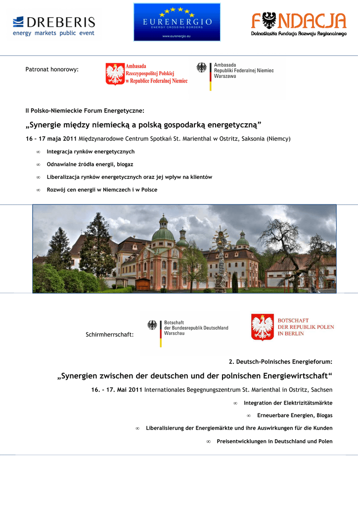 Patronat honorowy: II Polsko-Niemieckie Forum Energetyczne: „Synergie między niemiecką a polską gospodarką energetyczną” 16 – 17 maja 2011 Międzynarodowe Centrum Spotkań St. Marienthal w Ostritz, Saksonia (Niemcy) • Integracja rynków energetycznych • Odnawialne źródła energii, biogaz • Liberalizacja rynków energetycznych oraz jej wpływ na klientów • Rozwój cen energii w Niemczech i w Polsce Schirmherrschaft: 2. Deutsch-Polnisches Energieforum: „Synergien zwischen der deutschen und der polnischen Energiewirtschaft“ 16. - 17. Mai 2011 Internationales Begegnungszentrum St. Marienthal in Ostritz, Sachsen • Integration der Elektrizitätsmärkte • • Erneuerbare Energien, Biogas Liberalisierung der Energiemärkte und ihre Auswirkungen für die Kunden • Preisentwicklungen in Deutschland und Polen Partner/Partnerzy: www.energie-agentur-neisse.de Patronat medialny / Medienpartnerschaft: www.lanu.de Program / Programm: Poniedziałek, 16.05.2011 / Montag, 16.05.2011 11:30 Przyjazd uczestników / Anreise der Teilnehmer 12:00-13:00 Obiad / Mittagessen 13:00–15:30 Sesja 1 / Block 1 Otwarcie przez organizatorów: Eröffnung durch die Veranstalter: Janisław Muszyński, Prezes Zarządu, Dolnośląska Fundacja Rozwoju Regionalnego, dr Markus Reichel, Prezes Zarządu DREBERIS GmbH Janisław Muszyński, Geschäftsführer, Niederschlesische Stiftung für Regionale Entwicklung, Dr. Markus Reichel, Geschäftsführer, DREBERIS GmbH Mowy powitalne: Eröffnungsreden: Arkadiusz Roman, Radca Ambasady RP w Berlinie, Wydział Ekonomiczny Matthias Rehm, Główny specjalista ds. Ekonomicznych, Ambasada RFN w Warszawie Arkadiusz Roman, Botschaftsrat, Botschaft der Republik Polen in Berlin, Wirtschaftsabteilung Matthias Rehm, Wirtschaftsreferent, Botschaft der BRD in Warschau 1. Integracja rynków energetycznych 1. Tematy: • Transgraniczne zdolności przesyłowe: stan obecny i plany rozbudowy • Jak wysokie jest bezpieczeństwo zaopatrzenia w energię elektryczną w Niemczech i w Polsce? • Rozwój elektrowni i zapotrzebowania na energię elektryczną: ile naleŜałoby zainwestować po obu stronach granicy? • Czynniki wpływające na przyszły rozwój cen energii elektrycznej: struktura rynku, ceny paliw i koszty emisji CO2 • Kto będzie rozwijać struktury produkcyjne energii elektrycznej w Polsce i w Niemczech? Themen: • Grenzüberschreitende Übertragungskapazitäten: Aktueller Stand und Ausbauvorhaben • Wie hoch ist die Versorgungssicherheit in Deutschland und Polen? • Entwicklung des Kraftwerksparks und des Energiebedarfs: Welcher Investitionsbedarf besteht in beiden Märkten? • Parameter für die zukünftige Strompreisentwicklung: Markstruktur, Brennstoff- und CO2-Kosten • Wie wird sich die Erzeugungsstruktur in Polen und Deutschland weiterentwickeln? Integration der Elektrizitätsmärkte Referenten: Referenci: 1. Henryk Majchrzak, Prezes Zarządu, PSE Operator* 2. Grzegorz Onichimowski, Prezes Zarządu, Towarowa Giełda Energii 3. dr inŜ. Yvonne Saßnick, Dyrektor departamentu Projektów sieciowych i Technologii, 50Hertz Transmission GmbH 4. Andreas Gehrmann, Country Director Poland, RWE AG 5. dr Herbert Wirth, Prezes Zarządu, KGHM Polska Miedź S.A. 6. Prof. dr hab. Dominik Möst, Uniwersytet Techniczny Drezno, Kierownik Wydziału Gospodarki Energetycznej 15:30-16:00 Przerwa Kawowa / Kaffeepause 1. Henryk Majchrzak, Geschäftsführer, PSE Operator* 2. Grzegorz Onichimowski, Geschäftsführer, Polish Power Exchange 3. Dr.-Ing. Yvonne Saßnick, Bereichsleiterin Netzprojekte/Technologie, 50Hertz Transmission GmbH 4. Andreas Gehrmann, Country Director Poland, RWE AG 5. Dr. Herbert Wirth, Geschäftsführer, KGHM Polska Miedź S.A. 6. Prof. Dr. habil. Dominik Möst, TU Dresden, Lehrstuhlinhaber 16:00-18:00 Sesja 2 /Block 2 2. Energie odnawialne, biogaz 2. Tematy: • Akceptacja społeczna energii odnawialnych oraz potencjał rozbudowy po obu stronach granicy • Porównanie systemów wsparcia • Porównanie obciąŜeń finansowych dla odbiorców końcowych oraz korzyści społecznych i ekonomicznych • Które technologie mogą się prawdopodobnie rozwijać bez dalszych dotacji? • MoŜliwości współpracy Themen: • Akzeptanz für erneuerbare Energien und Ausbaupotential im Vergleich • Vergleich der Fördersysteme • Vergleich der preislichen Belastungen für Endkunden sowie der dem gegenüberstehende gesellschaftliche und volkswirtschaftliche Nutzen • Für welche Technologien kann erwartet werden, dass sie ohne weitere Förderung ausgebaut werden? • Kooperationsmöglichkeiten Referenci: 1. dr Wolfgang Daniels, Prezes Stowarzyszenia Wspierania Energii Odnawialnych w Saksonii 2. Zdzisław Rzewuski, Dyrektor, Wojewódzki Fundusz Ochrony Środowiska 3. dr inŜ. Michael Seiffert, Wicedyrektor działu Biorafinerie, Niemieckie Centrum Badania Biomasy DBFZ 4. Friedrich Czambor, Dyrektor DREBERIS energy, DREBERIS GmbH Referenten: 1. Dr. Wolfgang Daniels, Präsident, Vereinigung zur Förderung Erneuerbarer Energien in Sachsen e.V. 2. Zdzisław Rzewuski, Direktor, Niederschlesischer Umweltschutzfond 3. Dr.-Ing. Michael Seiffert, Stellvertretender Bereichsleiter Bioraffinerien, Deutsches BiomasseForschungsZentrum 4. Friedrich Czambor, Bereichsleiter DREBERIS energy, DREBERIS GmbH Erneuerbare Energien, Biogas 18:30 Dyskusja / Diskussion 19:00 Kolacja i wspólny wieczór / Abendessen und gemeinsamer Kaminabend Wtorek, 17.05.2011 / Dienstag 17.05.2011 08:00 – 08:45 Śniadanie / Frühstück 09:00 – 11:00 Sesja 3 / Block 3 3. Liberalizacja rynków energetycznych oraz jej wpływ na klientów; Rozwój cen w Niemczech i w Polsce Tematy: • Od odbiorcy do klienta? • Od klienta do producenta z własnych źródeł? • Porównanie pozycjonowania klientów przemysłowych oraz gospodarstw domowych w Niemczech i w Polsce • Rola klientów przemysłowych i wpływ oczekiwanego rozwoju cen na ich konkurencyjność w Europie i na świecie • Wpływ wprowadzenia sma