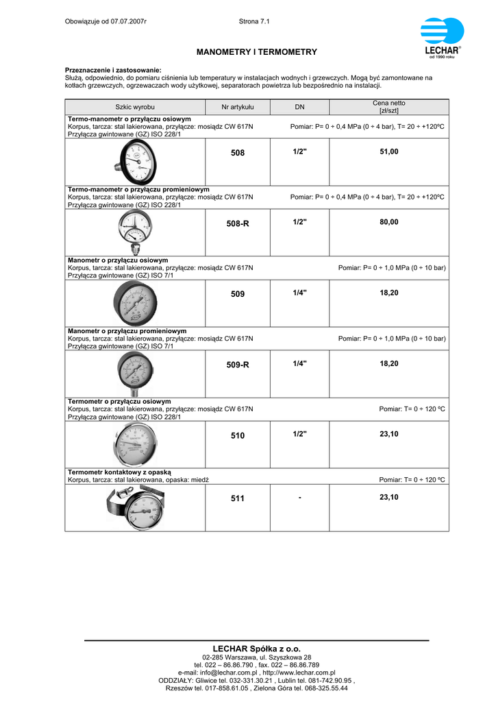 Obowiązuje od 07.07.2007r Strona 7.1 MANOMETRY I TERMOMETRY Przeznaczenie i zastosowanie: Służą, odpowiednio, do pomiaru ciśnienia lub temperatury w instalacjach wodnych i grzewczych. Mogą być zamontowane na kotłach grzewczych, ogrzewaczach wody użytkowej, separatorach powietrza lub bezpośrednio na instalacji. Szkic wyrobu Nr artykułu Termo-manometr o przyłączu osiowym Korpus, tarcza: stal lakierowana, przyłącze: mosiądz CW 617N Przyłącza gwintowane (GZ) ISO 228/1 508 Termo-manometr o przyłączu promieniowym Korpus, tarcza: stal lakierowana, przyłącze: mosiądz CW 617N Przyłącza gwintowane (GZ) ISO 228/1 508-R Pomiar: P= 0 ÷ 0,4 MPa (0 ÷ 4 bar), T= 20 ÷ +120ºC 1/2" 1/2" 80,00 Pomiar: P= 0 ÷ 1,0 MPa (0 ÷ 10 bar) 1/4" Manometr o przyłączu promieniowym Korpus, tarcza: stal lakierowana, przyłącze: mosiądz CW 617N Przyłącza gwintowane (GZ) ISO 7/1 509-R 51,00 Pomiar: P= 0 ÷ 0,4 MPa (0 ÷ 4 bar), T= 20 ÷ +120ºC Manometr o przyłączu osiowym Korpus, tarcza: stal lakierowana, przyłącze: mosiądz CW 617N Przyłącza gwintowane (GZ) ISO 7/1 509 Cena netto [zł/szt] DN 18,20 Pomiar: P= 0 ÷ 1,0 MPa (0 ÷ 10 bar) 1/4" Termometr o przyłączu osiowym Korpus, tarcza: stal lakierowana, przyłącze: mosiądz CW 617N Przyłącza gwintowane (GZ) ISO 228/1 510 18,20 Pomiar: T= 0 ÷ 120 ºC 1/2" Termometr kontaktowy z opaską Korpus, tarcza: stal lakierowana, opaska: miedź 23,10 Pomiar: T= 0 ÷ 120 ºC 511 - LECHAR Spółka z o.o. 02-285 Warszawa, ul. Szyszkowa 28 tel. 022 – 86.86.790 , fax. 022 – 86.86.789 e-mail: [email protected] , http://www.lechar.com.pl ODDZIAŁY: Gliwice tel. 032-331.30.21 , Lublin tel. 081-742.90.95 , Rzeszów tel. 017-858.61.05 , Zielona Góra tel. 068-325.55.44 23,10 Obowiązuje od 07.07.2007r Strona 7.2 ARMATURA MANOMETRYCZNA Przeznaczenie i zastosowanie: Służy do podłączania manometrów do instalacji wodnych i grzewczych. Rurki kompensacyjne chronią manometry przed uderzeniami hydraulicznymi. Zawory manometryczne odcinają manometry od instalacji i w ten sposób chronią je przed długotrwałym oddziaływaniem ciśnienia. Szkic wyrobu Nr artykułu DN Cena netto [zł/szt] 1/4” 3/8” 1/2” 24,20 26,10 28,90 Rurka kompensacyjna do przyłączania manometru Korpus, przyłącza: mosiądz EN 12164:98 Prob=1,6MPa, Trob=0ºC ÷ +100ºC Przyłącza gwintowane (GW/GZ) ISO 228/1 1809 Zawór manometryczny Korpus, zespół zamykający: mosiądz EN 12165:98, uszczelnienia: NBR Prob=1,6MPa, Trob=0ºC ÷ +80ºC Przyłącza gwintowane (GW/GZ) ISO 228/1 ; 1807 Spełnia wymagania normy PN-86/M-75198 1/4” 3/8” 1/2” 31,00 31,00 33,00 ARMATURA WODOWSKAZOWA Przeznaczenie i zastosowanie: Służy do wskazywania poziomu cieczy w zbiornikach podłączonych do instalacji wodnych i grzewczych. Szkic wyrobu Nr artykułu DN Cena netto [zł/szt] Zestaw zaworów wodowskazowych z zaworem upustowym Korpus, zespół zamykający: mosiądz EN 12165:98, uszczelnienia: NBR, pokrętło: stal węglowa lakierowana Prob=1,0MPa, Trob=0ºC ÷ +80ºC Przyłącza gwintowane (GZ) ISO 228/1 ; Spełnia wymagania normy PN-86/M-75198 1801 10-1/4” 10-3/8” 13-3/8” 13-1/2” 16-1/2” 78,30 78,30 78,30 93,40 93,40 Rurka wodowskazowa Korpus: poliwęglan ; Prob=1,6Mpa, Trob=0ºC ÷ +60ºC (wyższą temperaturę roboczą daje zastosowanie rurki szklanej) 2105 10mm x 2m 13mm x 2m 16mm x 2m 41,10 58,00 79,00 2106 10 13 16 2,10 2,10 2,10 Uszczelka do rurki wodowskazowej Korpus: NBR ; Prob=1,6Mpa, Trob=0ºC ÷ +80ºC LECHAR Spółka z o.o. 02-285 Warszawa, ul. Szyszkowa 28 tel. 022 – 86.86.790 , fax. 022 – 86.86.789 e-mail: [email protected] , http://www.lechar.com.pl ODDZIAŁY: Gliwice tel. 032-331.30.21 , Lublin tel. 081-742.90.95 , Rzeszów tel. 017-858.61.05 , Zielona Góra tel. 068-325.55.44 Obowiązuje od 07.07.2007r Strona 7.3 PRZYKŁAD ZASTOSOWANIA LECHAR Spółka z o.o. 02-285 Warszawa, ul. Szyszkowa 28 tel. 022 – 86.86.790 , fax. 022 – 86.86.789 e-mail: [email protected] , http://www.lechar.com.pl ODDZIAŁY: Gliwice tel. 032-331.30.21 , Lublin tel. 081-742.90.95 , Rzeszów tel. 017-858.61.05 , Zielona Góra tel. 068-325.55.44