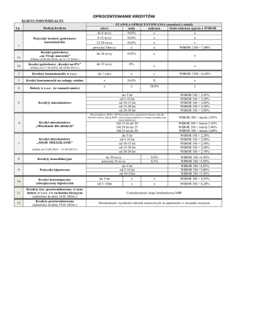 OPROCENTOWANIE KREDYTÓW KLIENT INDYWIDUALNY Lp okres do 6 m-cy 10,0% x x Pożyczki/ kredyty gotówkowe konsumenckie 6-12 m-cy 10,0% x x 1 1a Kredyt gotówkowy „na Twoje marzenie” 12-24-m-cy 10,0% x x powyżej 24m-cy x x WIBOR 12M + 7,00% do 24 m-cy 4,95% x do 12 m-cy 0% Kredyt gotówkowy „Kredyt na 0%” 2 Kredyty konsumenckie w r.o.r. do 1 roku 3 Kredyt konsumencki na zakupy ratalne 4 Debety w r.o.r. (w ramach umów) 6 7 x (Oferta od 01.08.2016r. do 31.12.2016r.) 1b 5 STAWKA OPROCENTOWANIA (standard z tabeli) stała zmienna Stało-zmienna oparta o WIBOR Rodzaj kredytu x x x x WIBOR 12M + 6,20% x 10,0% X x x x 10,0% x (Oferta od 17.10.2016r. d0 30.04.2017r.) do 5 lat od 5-10 lat od 10-15 lat od 15-20 lat od 20-30 lat Kredyty mieszkaniowe Kredyt mieszkaniowy „Mieszkanie dla młodych” WIBOR 1M + 2,95% WIBOR 1M + 3,20% WIBOR 1M + 3,40% WIBOR 1M + 3,50% WIBOR 1M + 3,80% Dla posiadaczy ROR w BS Przysucha od co najmniej 6 miesięcy lub dla klientów którzy założą ROR i skorzystają dodatkowo z innego produktu (np. karty płatniczej) WIBOR 3M + marża 2,95% Od 15 lat do 20 Od 20 lat do 25 Od 25 lat do 30 WIBOR 3M + marża 3,10% WIBOR 3M + marża 3,40% WIBOR 3M + marża 3,60% do 5 lat od 5-10 lat od 10-15 lat od 15-20 lat od 20-30 lat Kredyt mieszkaniowy „MOJE MIESZKANIE” (oferta od 12.09.2016 – 31.08.2017r.) do 36 m-cy powyżej 36 m-cy WIBOR 1M + 2,20% WIBOR 1M + 2,40% WIBOR 1M + 2,50% WIBOR 1M + 2,60% WIBOR 1M + 2,70% 8,0% 8,5% WIBOR 3M +4,50% WIBOR 3M +5,50% 8 Kredyty konsolidacyjne 9 Pożyczka hipoteczna 10 Kredyt konsumpcyjny zabezpieczony hipotecznie 11 Kredyty tzw. przeterminowane, w tym: debety w r.o.r. i w rachunku bieżącym (udzielone do dnia 18.01.2016r.) Czterokrotność stopy lombardowej NBP 12 Kredyty przeterminowane (udzielone od dnia 19.01.2016r.) Dwukrotność wysokości odsetek ustawowych za opóźnienie w stosunku rocznym do 5 lat od 5-10 lat od 10-15lat WIBOR 3M +4,95% WIBOR 3M +5,00% WIBOR 3M +5,50% do 5 lat x x WIBOR 3M + 5,95% od 5- 10lat x x WIBOR 3M + 6,20%