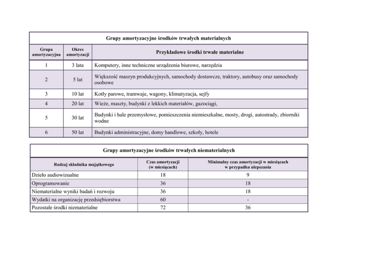 Grupy amortyzacyjne środków trwałych materialnych Grupa amortyzacyjna Okres amortyzacji 1 3 lata Komputery, inne techniczne urządzenia biurowe, narzędzia 2 5 lat Większość maszyn produkcyjnych, samochody dostawcze, traktory, autobusy oraz samochody osobowe 3 10 lat Kotły parowe, tramwaje, wagony, klimatyzacja, sejfy 4 20 lat Wieże, maszty, budynki z lekkich materiałów, gazociągi, 5 30 lat Budynki i hale przemysłowe, pomieszczenia niemieszkalne, mosty, drogi, autostrady, zbiorniki wodne 6 50 lat Budynki administracyjne, domy handlowe, szkoły, hotele Przykładowe środki trwałe materialne Grupy amortyzacyjne środków trwałych niematerialnych Czas amortyzacji (w miesiącach) Minimalny czas amortyzacji w miesiącach w przypadku ulepszania Dzieło audiowizualne 18 9 Oprogramowanie 36 18 Niematerialne wyniki badań i rozwoju Wydatki na organizację przedsiębiorstwa Pozostałe środki niematerialne 36 60 72 18 36 Rodzaj składnika majątkowego
