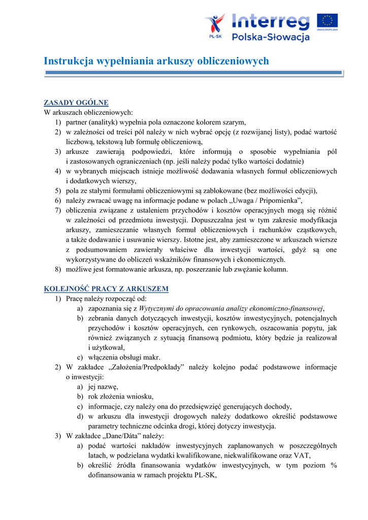 Instrukcja wypełniania arkuszy obliczeniowych ZASADY OGÓLNE W arkuszach obliczeniowych: 1) partner (analityk) wypełnia pola oznaczone kolorem szarym, 2) w zależności od treści pól należy w nich wybrać opcję (z rozwijanej listy), podać wartość liczbową, tekstową lub formułę obliczeniową, 3) arkusze zawierają podpowiedzi, które informują o sposobie wypełniania pól i zastosowanych ograniczeniach (np. jeśli należy podać tylko wartości dodatnie) 4) w wybranych miejscach istnieje możliwość dodawania własnych formuł obliczeniowych i dodatkowych wierszy, 5) pola ze stałymi formułami obliczeniowymi są zablokowane (bez możliwości edycji), 6) należy zwracać uwagę na informacje podane w polach „Uwaga / Pripomienka”, 7) obliczenia związane z ustaleniem przychodów i kosztów operacyjnych mogą się różnić w zależności od przedmiotu inwestycji. Dopuszczalna jest w tym zakresie modyfikacja arkuszy, zamieszczanie własnych formuł obliczeniowych i rachunków cząstkowych, a także dodawanie i usuwanie wierszy. Istotne jest, aby zamieszczone w arkuszach wiersze z podsumowaniem zawierały właściwe dla inwestycji wartości, gdyż są one wykorzystywane do obliczeń wskaźników finansowych i ekonomicznych. 8) możliwe jest formatowanie arkusza, np. poszerzanie lub zwężanie kolumn. KOLEJNOŚĆ PRACY Z ARKUSZEM 1) Pracę należy rozpocząć od: a) zapoznania się z Wytycznymi do opracowania analizy ekonomiczno-finansowej, b) zebrania danych dotyczących inwestycji, kosztów inwestycyjnych, potencjalnych przychodów i kosztów operacyjnych, cen rynkowych, oszacowania popytu, jak również związanych z sytuacją finansową podmiotu, który będzie ja realizował i użytkował, c) włączenia obsługi makr. 2) W zakładce „Założenia/Predpoklady” należy kolejno podać podstawowe informacje o inwestycji: a) jej nazwę, b) rok złożenia wniosku, c) informacje, czy należy ona do przedsięwzięć generujących dochody, d) w arkuszu dla inwestycji drogowych należy dodatkowo określić podstawowe parametry techniczne odcinka drogi, której dotyczy inwestycja. 3) W zakładce „Dane/Dáta” należy: a) podać wartości nakładów inwestycyjnych zaplanowanych w poszczególnych latach, w podzielana wydatki kwalifikowane, niekwalifikowane oraz VAT, b) określić źródła finansowania wydatków inwestycyjnych, w tym poziom % dofinansowania w ramach projektu PL-SK, c) ustalić wartość rezydualną inwestycji, dla głównych grup środków trwałych. Należy określić: wartość początkową tych środków (w roku ich wytworzenia lub zakupu) oraz stopę amortyzacji. d) zamieścić analizę przychodów oraz kosztów operacyjnych. Przedstawione wzory tabel stanowią wzór, który można modyfikować, jeżeli wymaga tego przedmiot inwestycji. Ważne, aby w wierszach: „Razem przychody: / Celkové príjmy:” oraz w tabelce: „4.3. KOSZTY OPERACYJNE - podsumowanie: / 4.3. PREVÁDZKOVÉ NÁKLADY - súhrn:” zamieszczone były sumy wartości cząstkowych tych przepływów. e) w przypadku analizy wykonywanej metodą przyrostu przychody i koszty inwestycji stanowią różnicę pomiędzy tymi przepływami dla wariantu zaniechania inwestycji oraz wariantu jej realizacji; f) jeżeli dotyczy to inwestycji – należy odpowiednio wypełnić tabelkę, która dotyczy rozliczenia oszczędności kosztów operacyjnych, g) wypełnić dane dotyczące źródeł finansowania projektu w części finansowej tabelki „5. UPROSZCZONY RACHUNEK PRZEPŁYWÓW PIENIĘŻNYCH / 5. ZJEDNODUŠENÝ VÝKAZ PEŇAŽNÝCH TOKOV”. 4) W zakładce „Wyniki/Výsledky” należy: a) podać wartość procentową maksymalnej wielkości współfinansowania określonej w ogłoszeniu o konkursie dla danego typu inwestycji”, b) obliczenia poziomu dofinansowania dla projektów, które generują dochody oraz wskaźników finansowych FNPV/C, FRR/C, FNPV/K, FRR/K zostaną wykonane automatycznie, c) w tabelach dotyczących analizy wrażliwości należy wybrać z rozwijanej listy zakres potencjalnych zmian wartości nakładów inwestycyjnych, przychodów i wartości rezydualnej oraz kosztów operacyjnych. Obliczenia – zmiany wartości wskaźników finansowych - zostaną wykonane automatycznie; 5) W zakładce „Trwałość/Udržateľnosť” należy: a) podać prognozowane wartości głównych przepływów finansowych związanych z analizą sytuacji finansowej partnera/operatora (przepływy bez inwestycji), b) zweryfikować i uzupełnić dane dotyczące przepływów wynikających z realizacji inwestycji, c) wyniki (podsumowanie) analizy trwałości zostanie wykonane automatycznie (tabela i wykres). 6) W zakładce „An. Ekonomiczna/Ekonomická an.” należy: a) określić wartość VAT i innych podatków, które związane są z korektą fiskalną nakładów inwestycyjnych, przychodów i kosztów operacyjnych, b) wprowadzić wartości korekty „cen rynkowych”, jeżeli jest to uzasadnione, c) wprowadzić wartości ekonomicznych korzyści i kosztów zewnętrznych, d) arkusz obliczy automatycznie: ekonomiczną wartość rezydualną, wyniki analizy ekonomicznej oraz wskaźniki ENPV, ERR i B/C, 2 e) w celu analizy wrażliwości wskaźników ekonomicznych konieczne jest wprowadzenie (z listy rozwijanej) zakresu potencjalnych zmian przepływów ekonomicznych (kosztów i korzyści ekonomicznych). Pozostałe obliczenia i wykresy prezentujące analizę wrażliwości arkusz wykona automatycznie; ARKUSZ DLA INWESTYCJI DROGOWYCH Specyficzne zasady, które dotyczą sposoby wypełnienia arkusza dla inwestycji drogowych opisane są w rozdziale 3 Uszczegółowienia analiz sektorowych, które są załącznikiem do Wytycznych. W przypadku, gdy inwestycja dotyczy kilku odcinków dróg, których nie można analizować łącznie, to każdy z odcinków powinien być przedmiotem odrębnej analizy. Wyniki obliczeń z odrębnych arkuszy należy następnie zsumować. ARKUSZ WERYFIKACJI DANYCH FINANSOWYCH DLA DZIAŁAŃ NIEINWE