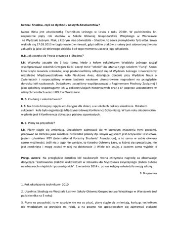 Iwona i Shadow, czyli co słychać u naszych Absolwentów? Iwona Biela jest absolwentką Technikum Leśnego w Lesku z roku 2010r. W październiku br. rozpocznie piąty rok studiów w Szkole Głównej Gospodarstwa Wiejskiego w Warszawie na Wydziale Leśnym. Ptak, z którym nas odwiedziła – Shadow, to sowa płomykówka Tyto alba. Sowa wykluła się 27.03.2013 w Legionowie ( w niewoli, gdyż odłów ptaków z natury jest zabroniony).Iwona zakupiła ją jako 10-dniowego pisklaka i od tego momentu zaczęła jego układanie. B.B. Jak zaczęła się Twoja przygoda z Shadow? I.B. Wszystko zaczęło się 2 lata temu, kiedy z kołem sokolniczym Wydziału Leśnego zaczął współpracować sokolnik Grzegorz Dzik i zaczął mnie "szkolić" do latania z jego sokołem "Furią". Samo koło liczyło niewielu członków, więc postanowiliśmy odłączyć się od Wydziału Leśnego i stworzyliśmy niezależne Międzywydziałowe Koło Naukowe Aves, działające obecnie przy Wydziale Nauk o Zwierzętach i rozpoczęliśmy własne badania naukowe uhonorowane nagrodami na przeglądzie dorobku kół naukowych. Dodatkowo zaczęliśmy współpracować z Regimentem Piechoty Zaciężnej i jako sokolnicy wspomagamy ich w rekonstrukcjach historycznych oraz z LP poprzez uczestnictwo w różnych Eventach wraz z RDLP w Warszawie. B. B. Co dalej z sokolnictwem? I. B. Na dzień dzisiejszy zajęcia edukacyjne dla dzieci, a w szkołach pokazy sokolnicze. Ostatnim sukcesem koła była organizacja Międzynarodowej Konferencji Sokolniczej. W tym roku akademickim w planie jest II Konferencja dotycząca ptaków szponiastych. B. B. Plany na przyszłość? I.B. Plany ciągle się zmieniają. Chciałabym zajmować się w szerszym znaczeniu tymi ptakami, pracować na lotnisku jako sokolnik, prowadzić pokazy itp. Innym wyjściem jest oczywiście Leśnictwo, jestem członkiem IFSY (International Forestry Students' Association), a to samo w sobie otwiera sporo możliwości. Jeśli nic z tego nie wyjdzie, to Katedra Ochrony Lasu, w której się specjalizuję, nie jest zamknięta i mogę zostać w niej na doktoracie ;) Wiele nie snuję, z czasem samo wyjdzie :) Przyp. autora: Na przeglądzie dorobku kół naukowych Iwona otrzymała nagrodę za obserwacje dotyczące "Zachowania ptaków krukowatych w stosunku do Myszołowa zwyczajnego (Buteo buteo) na obszarach miejskich i pozamiejskich". 2 września 2014 r. po raz kolejny odwiedziła swoją szkołę. B. Brajewska 1. Rok ukończenia technikum- 2010 2. Uczelnia: Studiuję na Wydziale Leśnym Szkoły Głównej Gospodarstwa Wiejskiego w Warszawie (od października na 5 roku) 3. Plany na przyszłość: tu w zasadzie nie ma co pisać, plany ciągle się zmieniają, kończąc technikum nie wiedziałam co przyjdzie mi robić, a na pewno nie spodziewałam się zajmować ptakami drapieżnymi.... W każdym razie w 1 z możliwych wyjść jest zajmowanie się w szerszym znaczeniu tymi ptakami, praca na lotnisku jako sokolnik, prowadzenie pokazów itp; innym wyjściem jest oczywiście Leśnictwo, jestem członkiem IFSY (International Forestry Students' Association) a to samo w sobie otwiera sporo możliwości, a jak nic z tego nie wyjdzie to Katedra Ochrony Lasu w której się specjalizuje nie jest zamknięta i mogę zostać w niej na doktoracie ;) Tak więc co do planów to wiele nie snuje, z czasem samo wyjdzie :) 4. Przygoda z sokolnictwem zaczęła się 2 lata temu kiedy z kołem sokolniczym Wydziału Leśnego zaczął współpracować sokolnik Grzegorz Dzik i zaczął mnie "szkolić" do latania z jego sokołem "Furią". Samo koło liczyło niewielu członków (8), więc postanowiliśmy odłączyć się od Wydziału Leśnego i stworzyliśmy niezależne Międzywydziałowe Koło Naukowe Aves działające obecnie przy Wydziale Nauk o Zwierzętach i w zasadzie dopiero na tym etapie zaczęło się wszystko rozwijać. Rozpoczeliśmy własne badania naukowe, samo nowo powstałe koło z wielkim wejściem, bo po 3 miesiacach oficjalnego istnienia, licząc nadal niewielu ponad 10 członków zebrało 2 nagrody głowne i 1 wyróżnienie w tegorocznym przeglądzie dorobku kół naukowych, co otworzyło nam znacznie drzwi do dalszej działalności. Dodatkowo zaczeliśmy współpracować z Regimentem Piechoty Zaciężnej i jako sokolnicy wspomagamy ich w rekonstrukcjach historycznych, z LP gdzie zwykle wraz z Regionalna Dyrekcją LP w Warszawie "obstawiamy" ich stoiska na różnych Eventach. W tym punkcie cały czas piszę "My" bo jednak sama bym wiele nie osiągnęła, w kole praktycznie nikt nie posiada prywatnie więcej niż 1 ptaka, każdy ptak to dodatkowa praca, a i z jednym jest jest momentami zbyt dużo. Jeśli chodzi o mnie to na przeglądzie dorobku kół naukowych jedynie jedna nagroda była moja, a dotyczyła "Zachowania ptaków krukowatych w stosunku do Myszołowa zwyczajnego (Buteo buteo) na obszarach miejskich i poza miejskich" 5. Gatunek ptaka- Shadow to sowa płomykówka Tyto alba urodzona 27.03.2013 w Legionowie (oczywiście w niewoli, odłów ptaków z natury jest zabroniony) zakupiłam ją jako 10-dniowego pisklaka i od tego momentu już zaczęłam jego układanie. 6. Co dalej z sokolnictwem: Na dzień dzisiejszy wraz z Aves'ami prowadzimy zajęcia edukacyjne dla dzieci, prowadzimy w szkołach pokazy sokolnicze, ostatnim sukcesem całego koła była Międzynarodowa Konferencja Sokolnicza której byliśmy organizatorami, a prelegentami byli między innymi: Andrzej Kruszewicz (dyrektor Zoo) Wojciech Piwowarski i Karol Wolnicki (Departament Leśnictwa i Ochrony Przyrody) czy Pavel Michal (dyrektor jedynej szkoły w Europie w której prowadzony jest przedmiot "sokolnictwo") W tym roku akademickim chcemy zrobić II Konferencję dotyczącą ptaków szponiastych, oraz jakoś rozszerzyć naszą działalność. Rozpisałam się więcej niż myślałam, mam nadzieję że pomogłam, a Pani Profesor już sobie z tego coś wybierze:) Pozdrawiam Iwona Biela