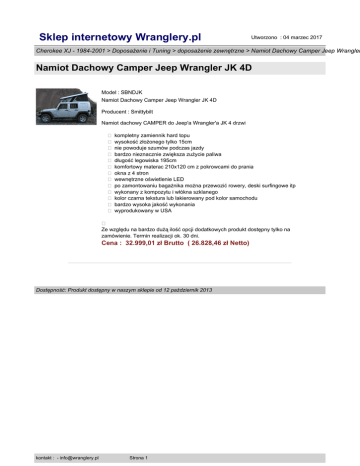 Sklep internetowy Wranglery.pl Utworzono : 04 marzec 2017 Cherokee XJ - 1984-2001 > Doposażenie i Tuning > doposażenie zewnętrzne > Namiot Dachowy Camper Jeep Wrangler Namiot Dachowy Camper Jeep Wrangler JK 4D Model : SBNDJK Namiot Dachowy Camper Jeep Wrangler JK 4D Producent : Smittybilt Namiot dachowy CAMPER do Jeep'a Wrangler'a JK 4 drzwi � kompletny zamiennik hard topu � wysokość złożonego tylko 15cm � nie powoduje szumów podczas jazdy � bardzo nieznacznie zwiększa zużycie paliwa � długość legowiska 195cm � komfortowy materac 210x120 cm z pokrowcami do prania � okna z 4 stron � wewnętrzne oświetlenie LED � po zamontowaniu bagażnika można przewozić rowery, deski surfingowe itp � wykonany z kompozytu i włókna szklanego � kolor czarna tekstura lub lakierowany pod kolor samochodu � bardzo wysoka jakość wykonania � wyprodukowany w USA � Ze względu na bardzo dużą ilość opcji dodatkowych produkt dostępny tylko na zamówienie. Termin realizacji ok. 30 dni. Cena : 32.999,01 zł Brutto ( 26.828,46 zł Netto) Dostępność: Produkt dostępny w naszym sklepie od 12 październik 2013 kontakt : - [email protected] Strona 1