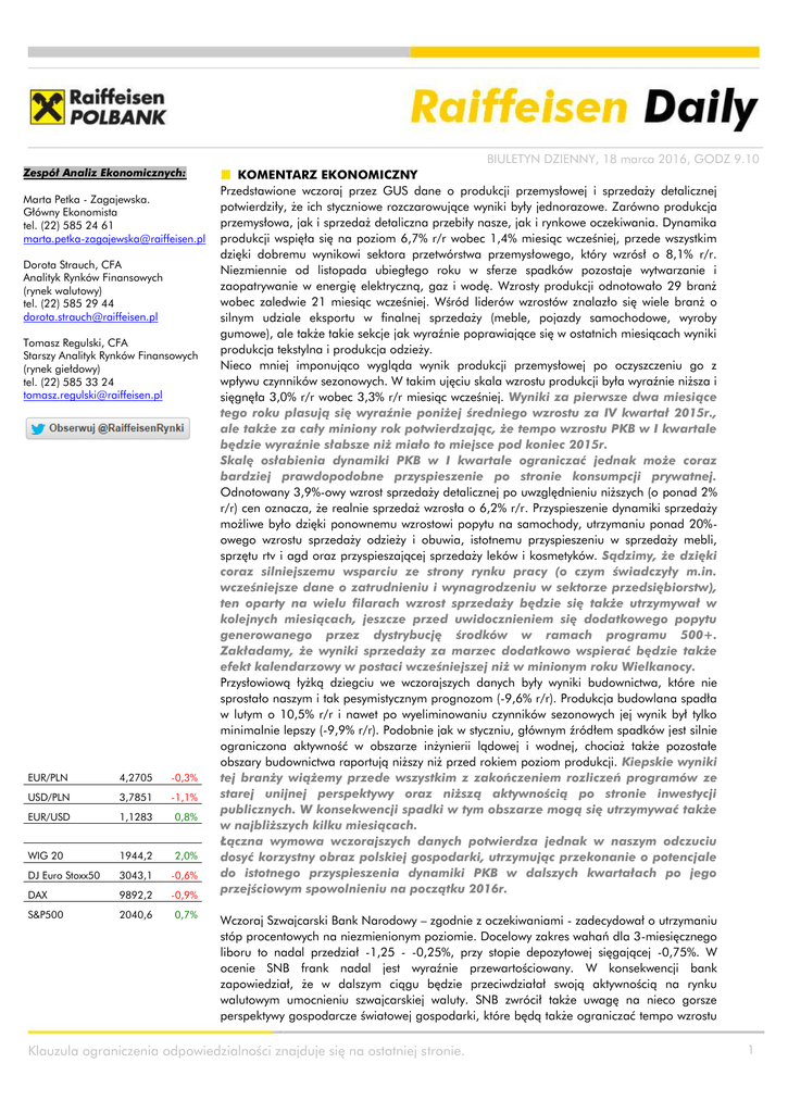 Zespół Analiz Ekonomicznych: Marta Petka - Zagajewska. Główny Ekonomista tel. (22) 585 24 61 [email protected] Dorota Strauch, CFA Analityk Rynków Finansowych (rynek walutowy) tel. (22) 585 29 44 [email protected] Tomasz Regulski, CFA Starszy Analityk Rynków Finansowych (rynek giełdowy) tel. (22) 585 33 24 [email protected] EUR/PLN 4,2705 -0,3% USD/PLN 3,7851 -1,1% EUR/USD 1,1283 0,8% WIG 20 1944,2 2,0% DJ Euro Stoxx50 3043,1 -0,6% DAX 9892,2 -0,9% S&P500 2040,6 0,7% BIULETYN DZIENNY, 18 marca 2016, GODZ 9.10 KOMENTARZ EKONOMICZNY Przedstawione wczoraj przez GUS dane o produkcji przemysłowej i sprzedaży detalicznej potwierdziły, że ich styczniowe rozczarowujące wyniki były jednorazowe. Zarówno produkcja przemysłowa, jak i sprzedaż detaliczna przebiły nasze, jak i rynkowe oczekiwania. Dynamika produkcji wspięła się na poziom 6,7% r/r wobec 1,4% miesiąc wcześniej, przede wszystkim dzięki dobremu wynikowi sektora przetwórstwa przemysłowego, który wzrósł o 8,1% r/r. Niezmiennie od listopada ubiegłego roku w sferze spadków pozostaje wytwarzanie i zaopatrywanie w energię elektryczną, gaz i wodę. Wzrosty produkcji odnotowało 29 branż wobec zaledwie 21 miesiąc wcześniej. Wśród liderów wzrostów znalazło się wiele branż o silnym udziale eksportu w finalnej sprzedaży (meble, pojazdy samochodowe, wyroby gumowe), ale także takie sekcje jak wyraźnie poprawiające się w ostatnich miesiącach wyniki produkcja tekstylna i produkcja odzieży. Nieco mniej imponująco wygląda wynik produkcji przemysłowej po oczyszczeniu go z wpływu czynników sezonowych. W takim ujęciu skala wzrostu produkcji była wyraźnie niższa i sięgnęła 3,0% r/r wobec 3,3% r/r miesiąc wcześniej. Wyniki za pierwsze dwa miesiące tego roku plasują się wyraźnie poniżej średniego wzrostu za IV kwartał 2015r., ale także za cały miniony rok potwierdzając, że tempo wzrostu PKB w I kwartale będzie wyraźnie słabsze niż miało to miejsce pod koniec 2015r. Skalę osłabienia dynamiki PKB w I kwartale ograniczać jednak może coraz bardziej prawdopodobne przyspieszenie po stronie konsumpcji prywatnej. Odnotowany 3,9%-owy wzrost sprzedaży detalicznej po uwzględnieniu niższych (o ponad 2% r/r) cen oznacza, że realnie sprzedaż wzrosła o 6,2% r/r. Przyspieszenie dynamiki sprzedaży możliwe było dzięki ponownemu wzrostowi popytu na samochody, utrzymaniu ponad 20%owego wzrostu sprzedaży odzieży i obuwia, istotnemu przyspieszeniu w sprzedaży mebli, sprzętu rtv i agd oraz przyspieszającej sprzedaży leków i kosmetyków. Sądzimy, że dzięki coraz silniejszemu wsparciu ze strony rynku pracy (o czym świadczyły m.in. wcześniejsze dane o zatrudnieniu i wynagrodzeniu w sektorze przedsiębiorstw), ten oparty na wielu filarach wzrost sprzedaży będzie się także utrzymywał w kolejnych miesiącach, jeszcze przed uwidocznieniem się dodatkowego popytu generowanego przez dystrybucję środków w ramach programu 500+. Zakładamy, że wyniki sprzedaży za marzec dodatkowo wspierać będzie także efekt kalendarzowy w postaci wcześniejszej niż w minionym roku Wielkanocy. Przysłowiową łyżką dziegciu we wczorajszych danych były wyniki budownictwa, które nie sprostało naszym i tak pesymistycznym prognozom (-9,6% r/r). Produkcja budowlana spadła w lutym o 10,5% r/r i nawet po wyeliminowaniu czynników sezonowych jej wynik był tylko minimalnie lepszy (-9,9% r/r). Podobnie jak w styczniu, głównym źródłem spadków jest silnie ograniczona aktywność w obszarze inżynierii lądowej i wodnej, chociaż także pozostałe obszary budownictwa raportują niższy niż przed rokiem poziom produkcji. Kiepskie wyniki tej branży wiążemy przede wszystkim z zakończeniem rozliczeń programów ze starej unijnej perspektywy oraz niższą aktywnością po stronie inwestycji publicznych. W konsekwencji spadki w tym obszarze mogą się utrzymywać także w najbliższych kilku miesiącach. Łączna wymowa wczorajszych danych potwierdza jednak w naszym odczuciu dosyć korzystny obraz polskiej gospodarki, utrzymując przekonanie o potencjale do istotnego przyspieszenia dynamiki PKB w dalszych kwartałach po jego przejściowym spowolnieniu na początku 2016r. Wczoraj Szwajcarski Bank Narodowy – zgodnie z oczekiwaniami - zadecydował o utrzymaniu stóp procentowych na niezmienionym poziomie. Docelowy zakres wahań dla 3-miesięcznego liboru to nadal przedział -1,25 - -0,25%, przy stopie depozytowej sięgającej -0,75%. W ocenie SNB frank nadal jest wyraźnie przewartościowany. W konsekwencji bank zapowiedział, że w dalszym ciągu będzie przeciwdziałał swoją aktywnością na rynku walutowym umocnieniu szwajcarskiej waluty. SNB zwrócił także uwagę na nieco gorsze perspektywy gospodarcze światowej gospodarki, które będą także ograniczać tempo wzrostu Klauzula ograniczenia odpowiedzialności znajduje się na ostatniej stronie. 1 BIULETYN DZIENNY, 18 marca 2016, GODZ 9.10 gospodarczego w Szwajcarii, oraz na wolniejszą normalizację inflacji, która – jak w większości europejskich gospodarek – wynika w głównej mierze z kształtowania się cen paliw. Chociaż drzwi do ewentualnego ponownego złagodzenia polityki pieniężnej przez SNB nadal są otwarte, to sądzimy, że jedynie nieskuteczność interwencji walutowych i ponowna silna presja na umocnienie szwajcarskiej waluty mogłyby skłonić tamtejsze władze monetarne do ponownej obniżki stóp procentowych. Także wczoraj o utrzymaniu stóp procentowych na niezmienionym poziomie (z główną sięgającą +0,5%) zadecydował Bank Anglii. Na 25pb obniżki zdecydował się Norges Bank. Obydwie decyzje były zgodne z rynkowymi oczekiwaniami. KOMENTARZ RYNKOWY Przy dobrym sentymencie na rynkach wschodzących kurs EURPLN dotarł wczoraj w godzinach popołudniowych pod poziom 4,27, który dotychczas hamował spadki. Para znalazła się tym samym blisko ważnego wsparcia w postaci 200-sesyjnej średniej ruchomej na poz